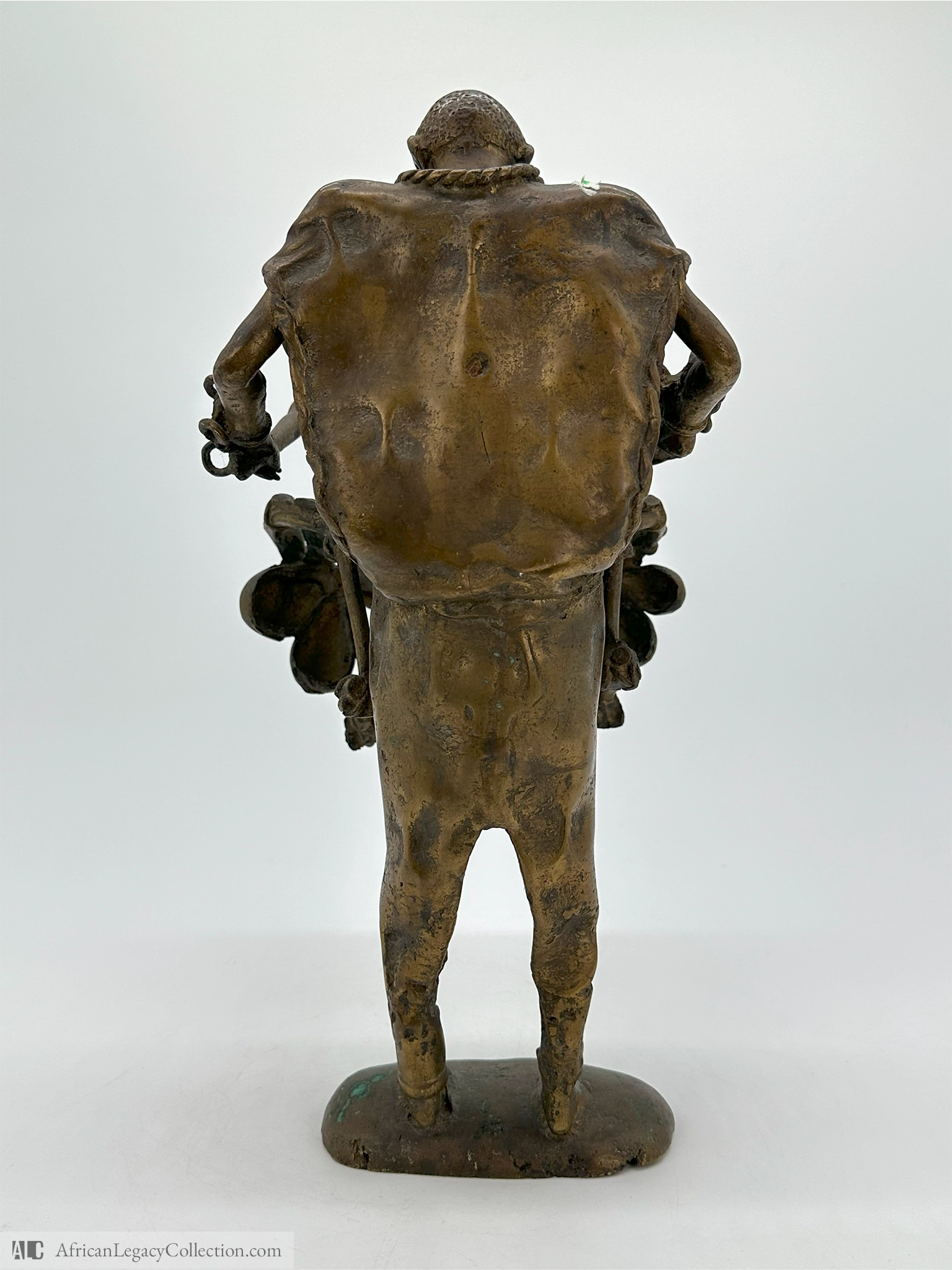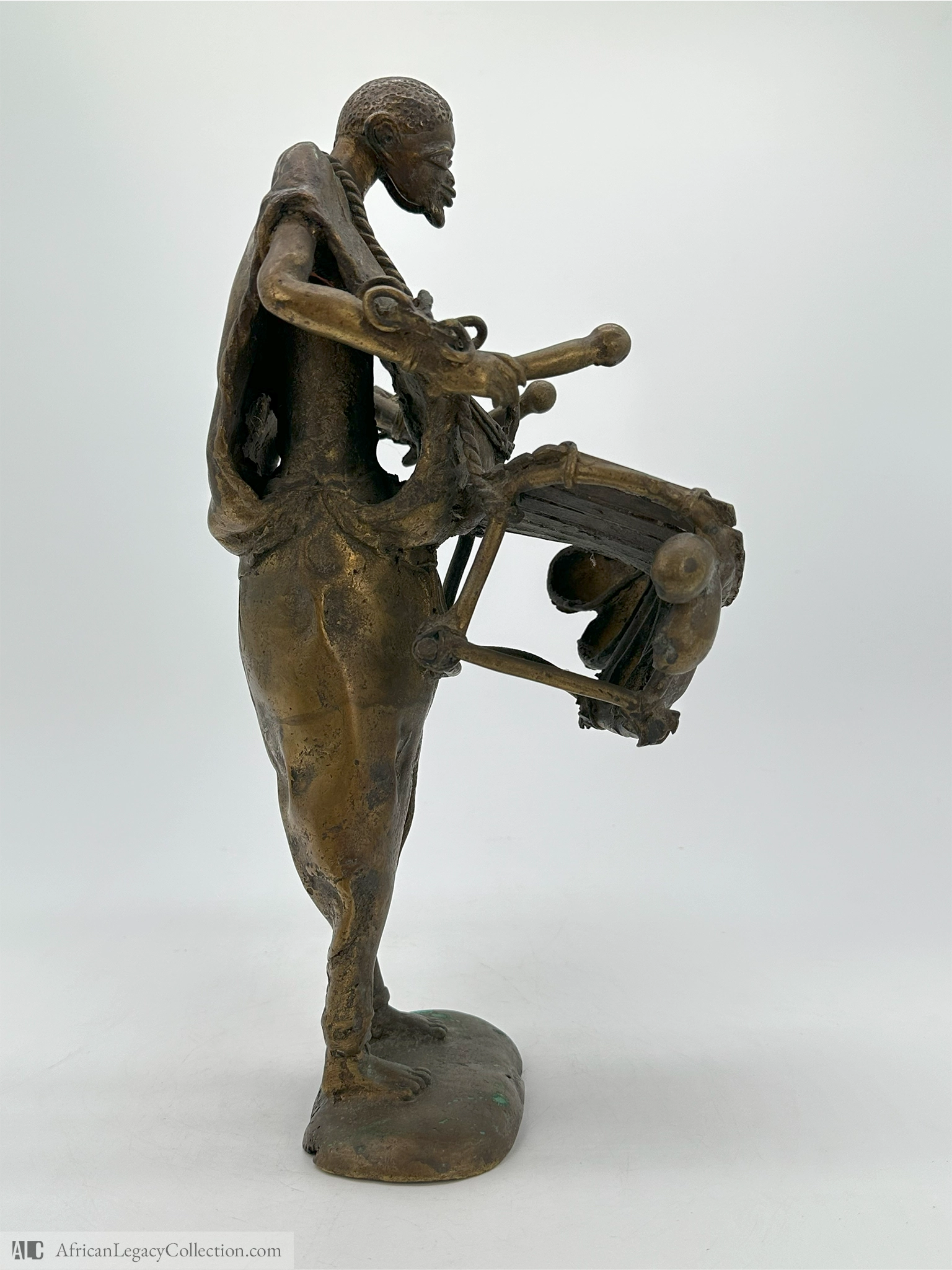 The sculpture is crafted using lost-wax casting, accentuating traditional techniques in metalworking. This form of craftsmanship reflects a rich historical context, where music and artistry played crucial roles in daily and ceremonial life. The bronze material and fine detailing highlight its significance as a cultural symbol and an artistic achievement.