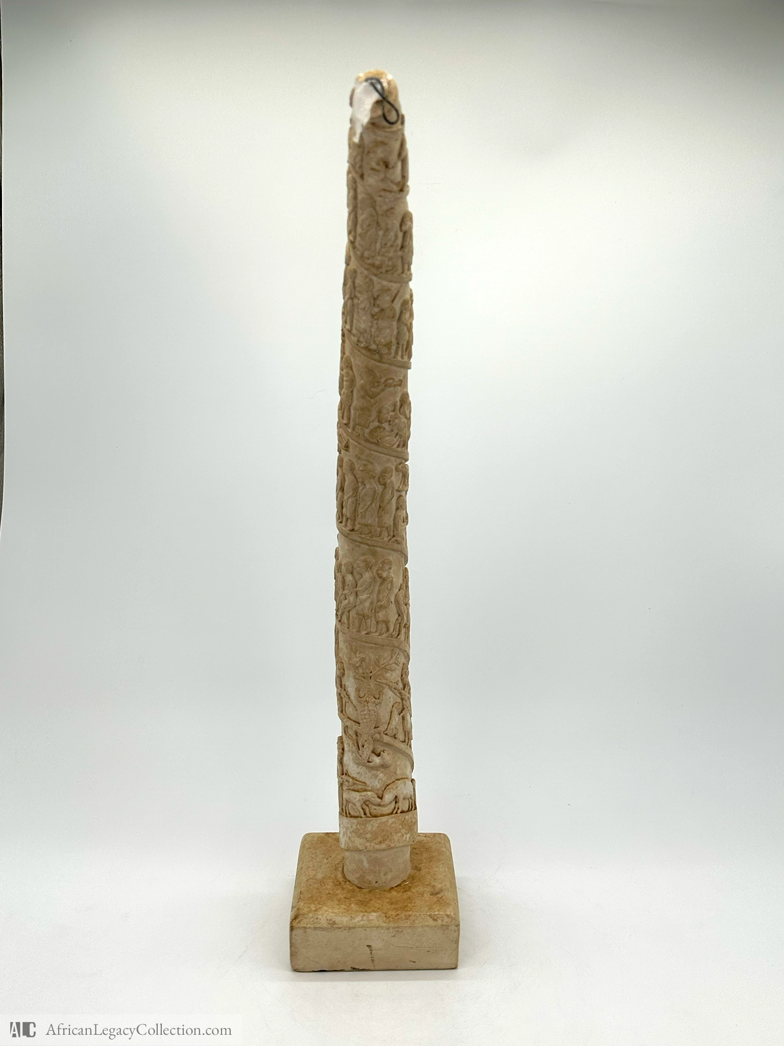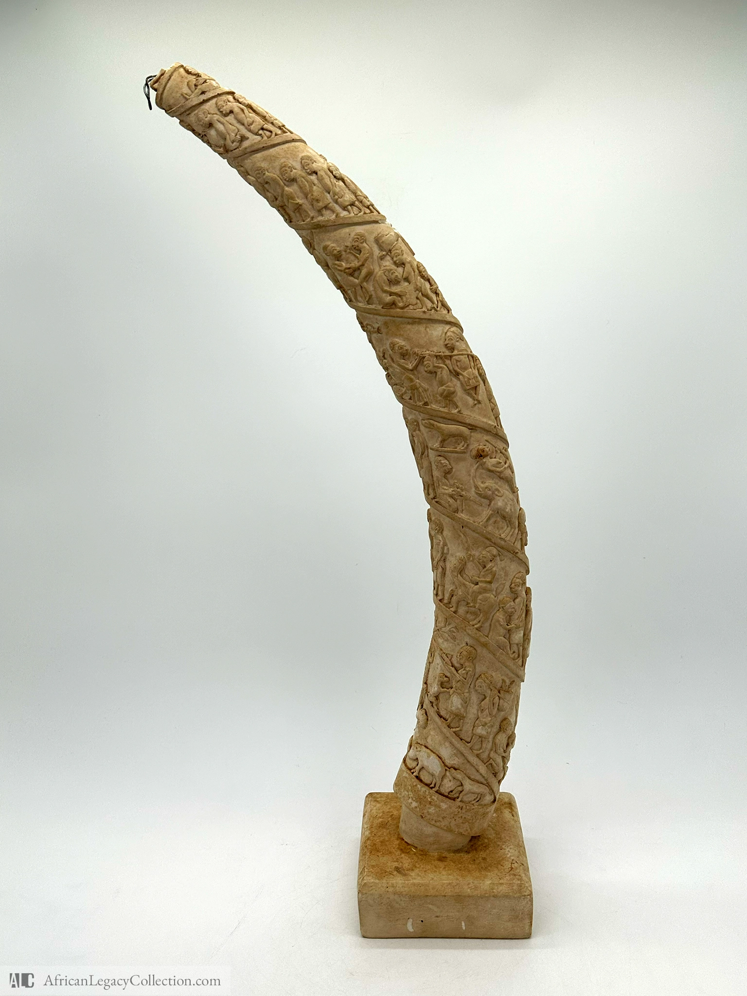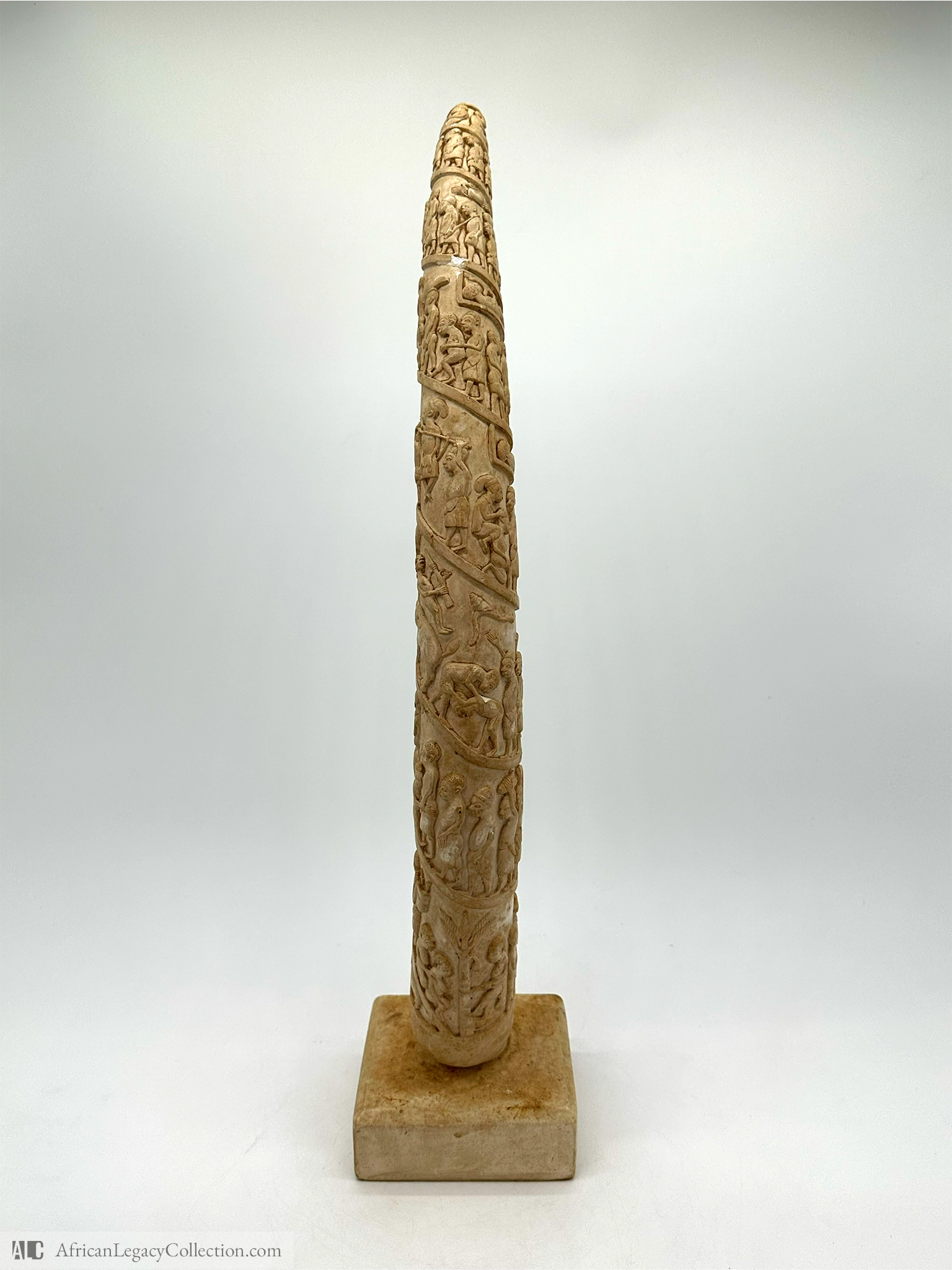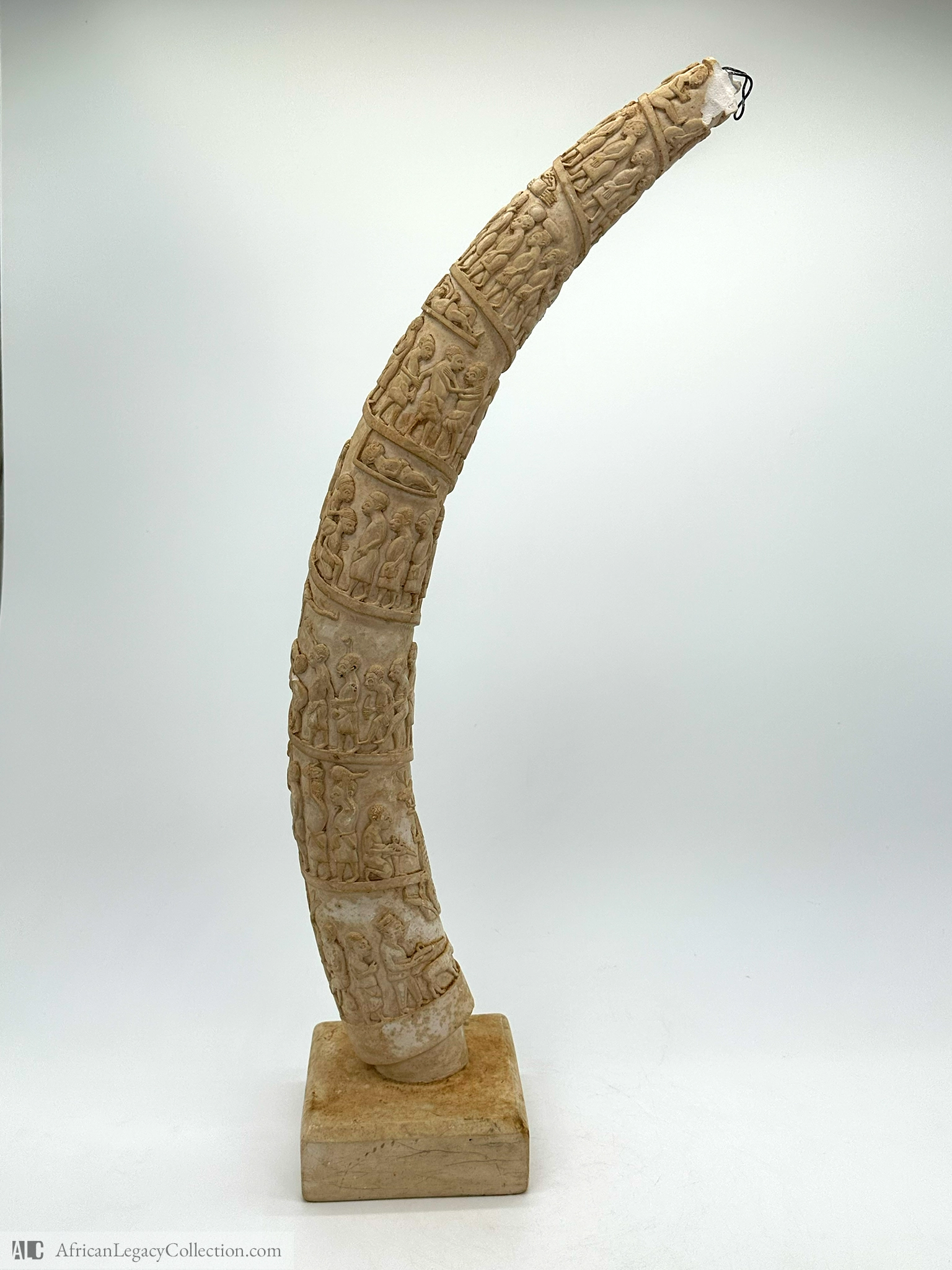 This intricately carved tusk likely originates from West Africa, serving primarily as a status symbol or gift in cultural rituals. The detailed scenes carved into the tusk depict various aspects of daily life, ceremonies, or historical events, showcasing the artistry and storytelling of the originating culture.