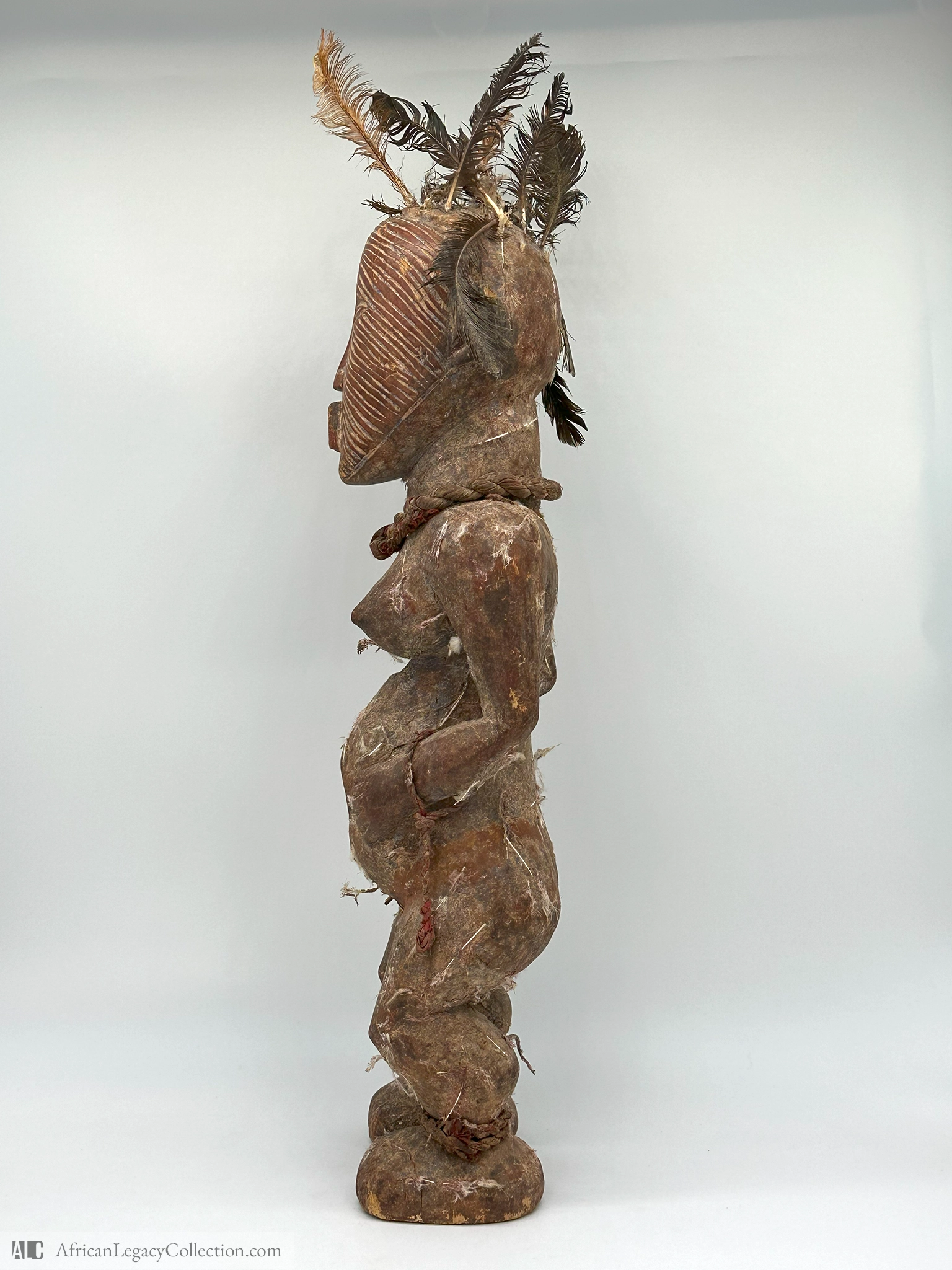 The figure is crafted from wood, adorned with feathers, and displays a rich patina indicative of its ceremonial use over time. It reflects the cultural practices of the period in which it was made, offering insights into the socio-religious life of the community. The presence of scarification motifs highlights its cultural significance.