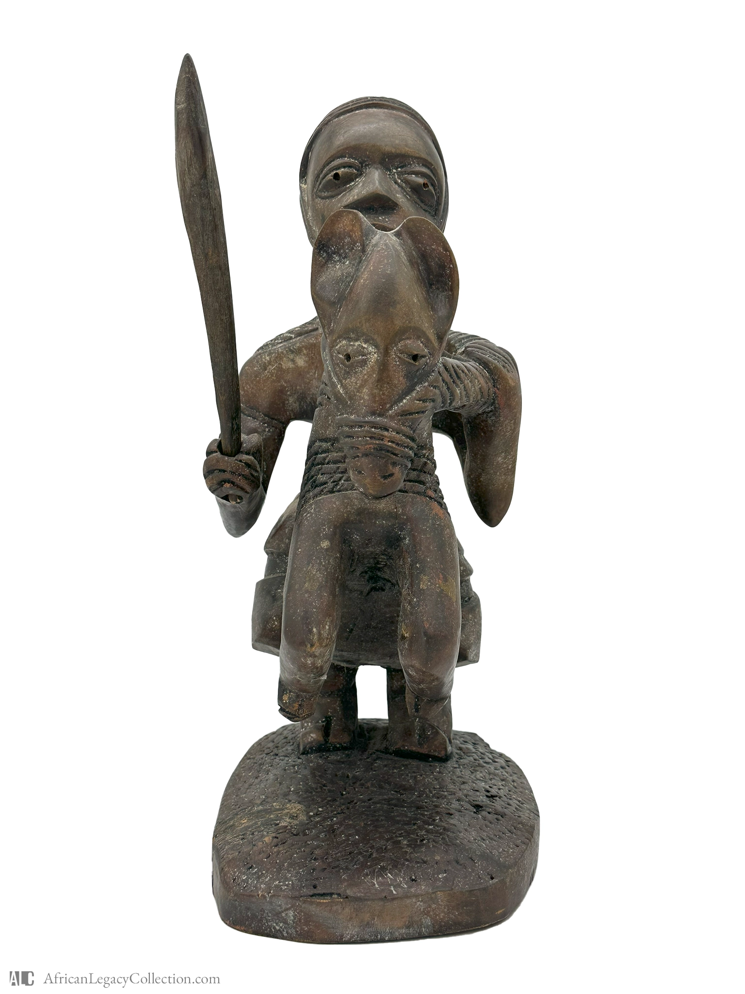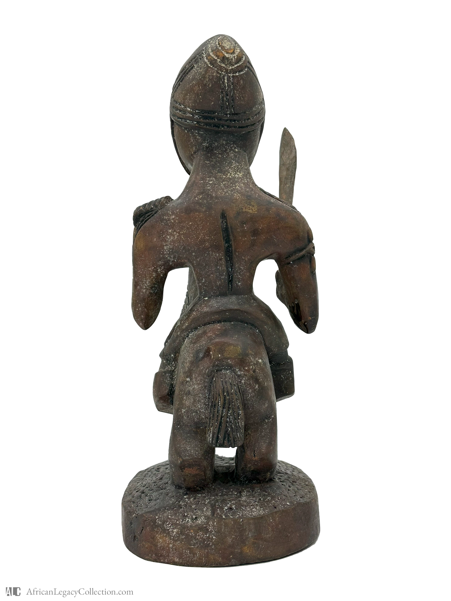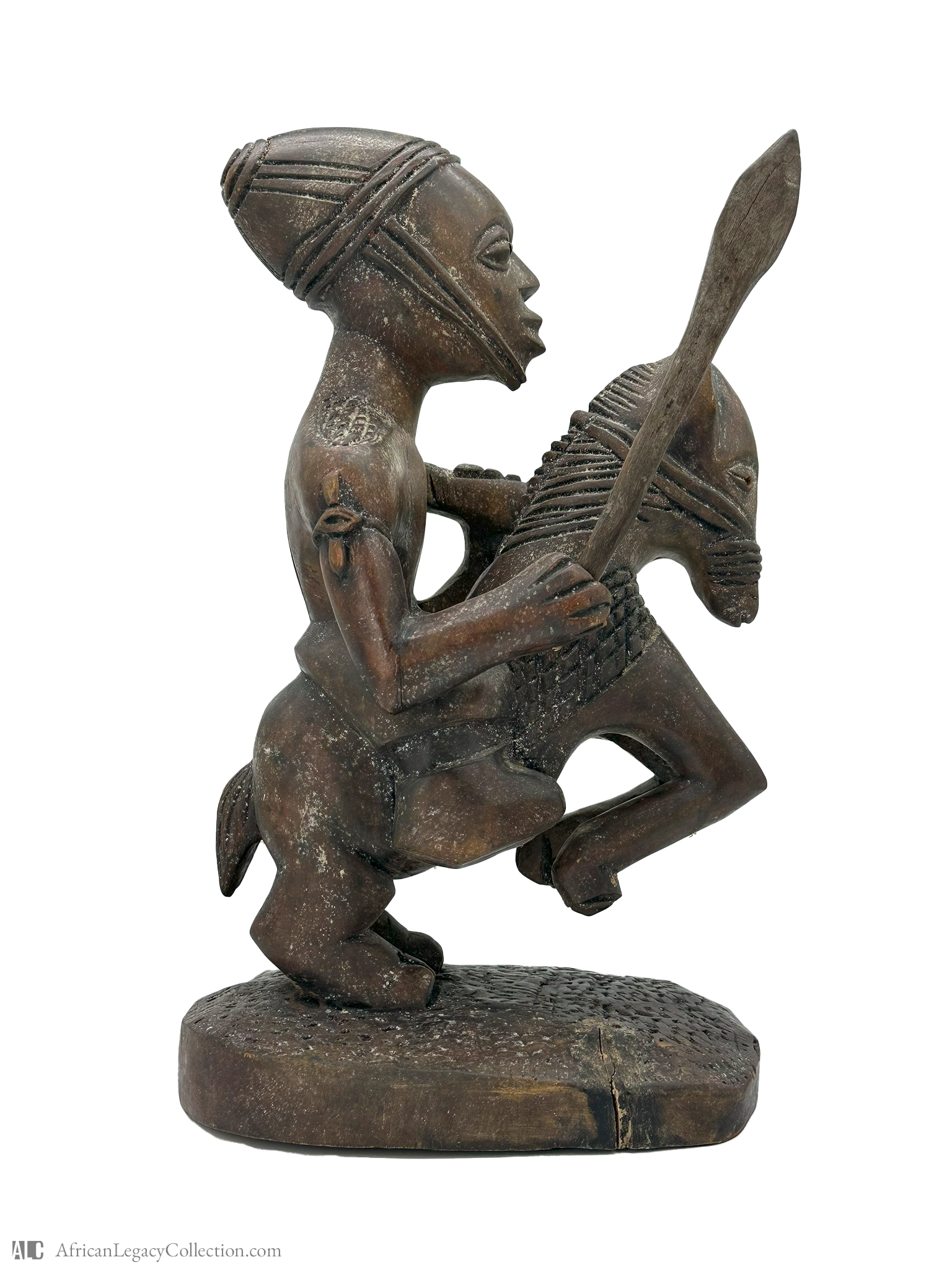 This artifact is a wooden sculpture depicting a rider on horseback, likely originating from West Africa. It serves as a cultural emblem, representing power and authority. The piece is characteristic of traditional warrior motifs, often symbolizing leadership or influence within a community.