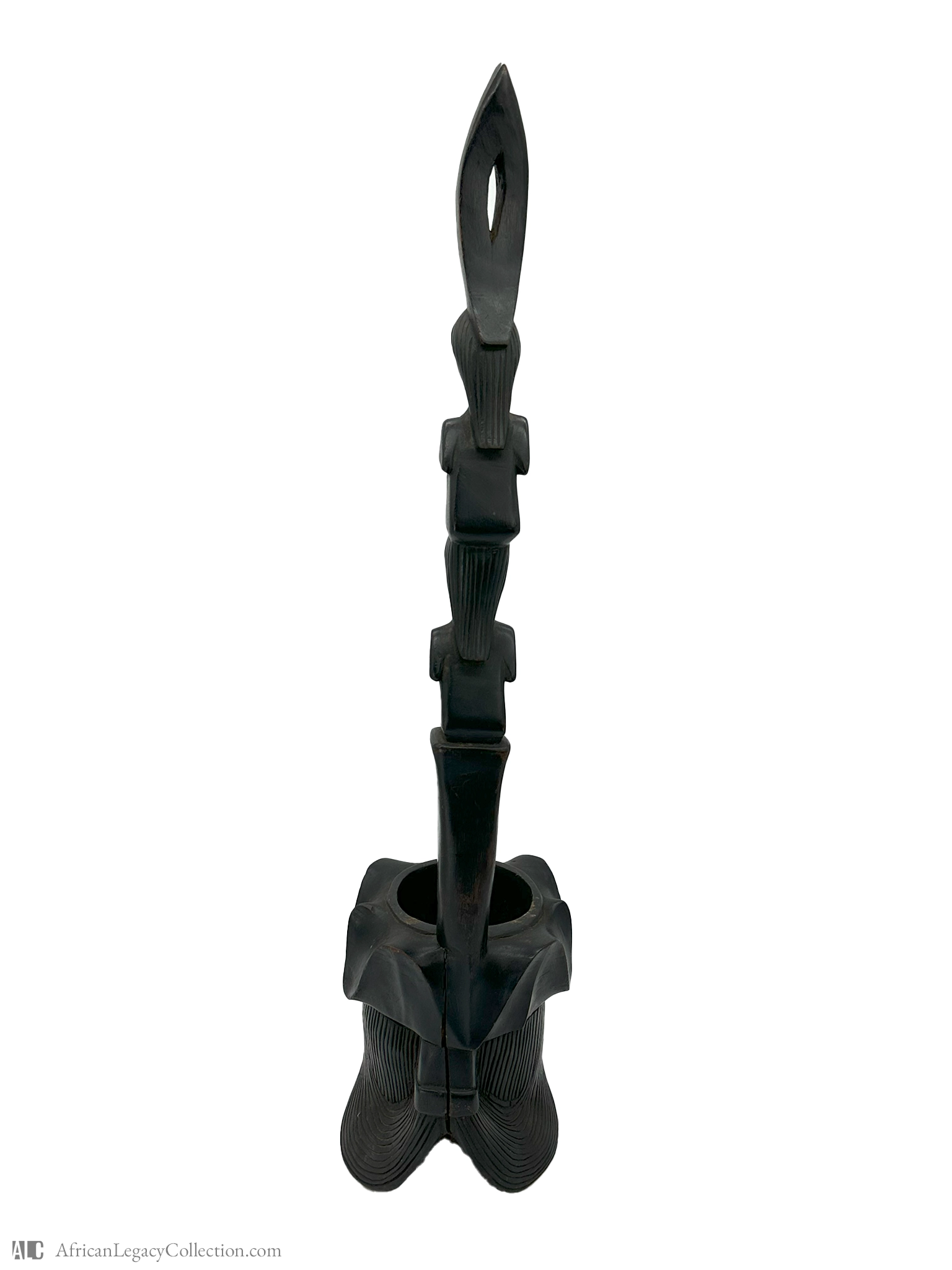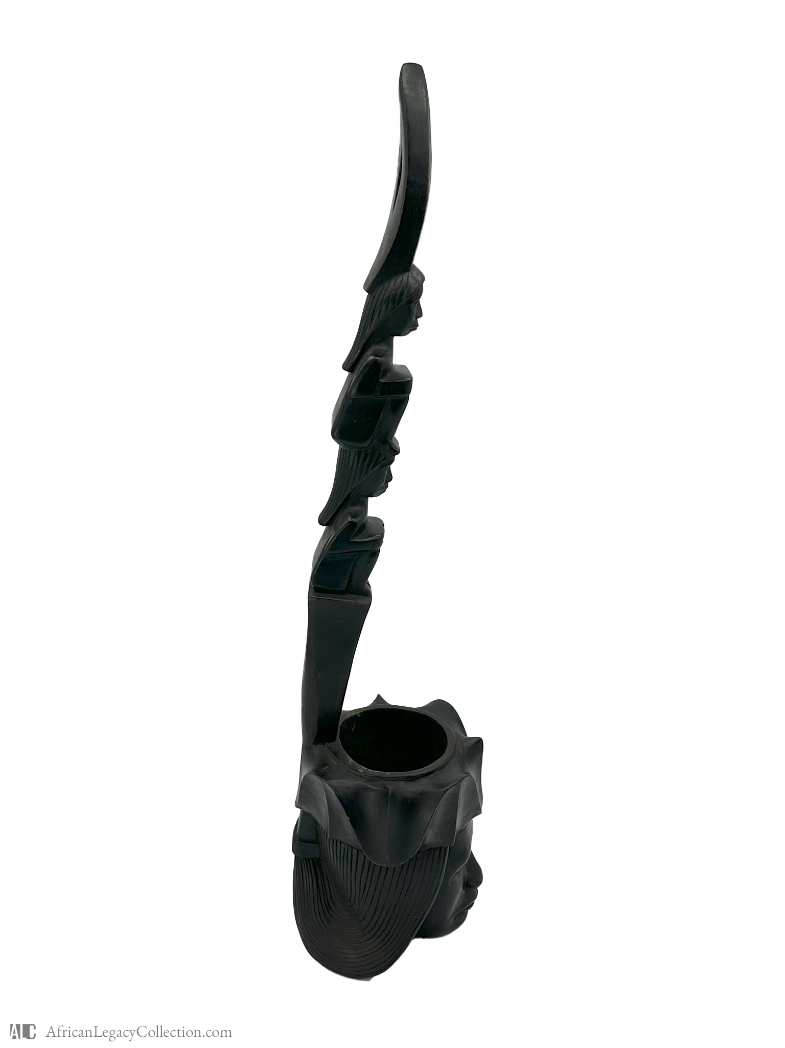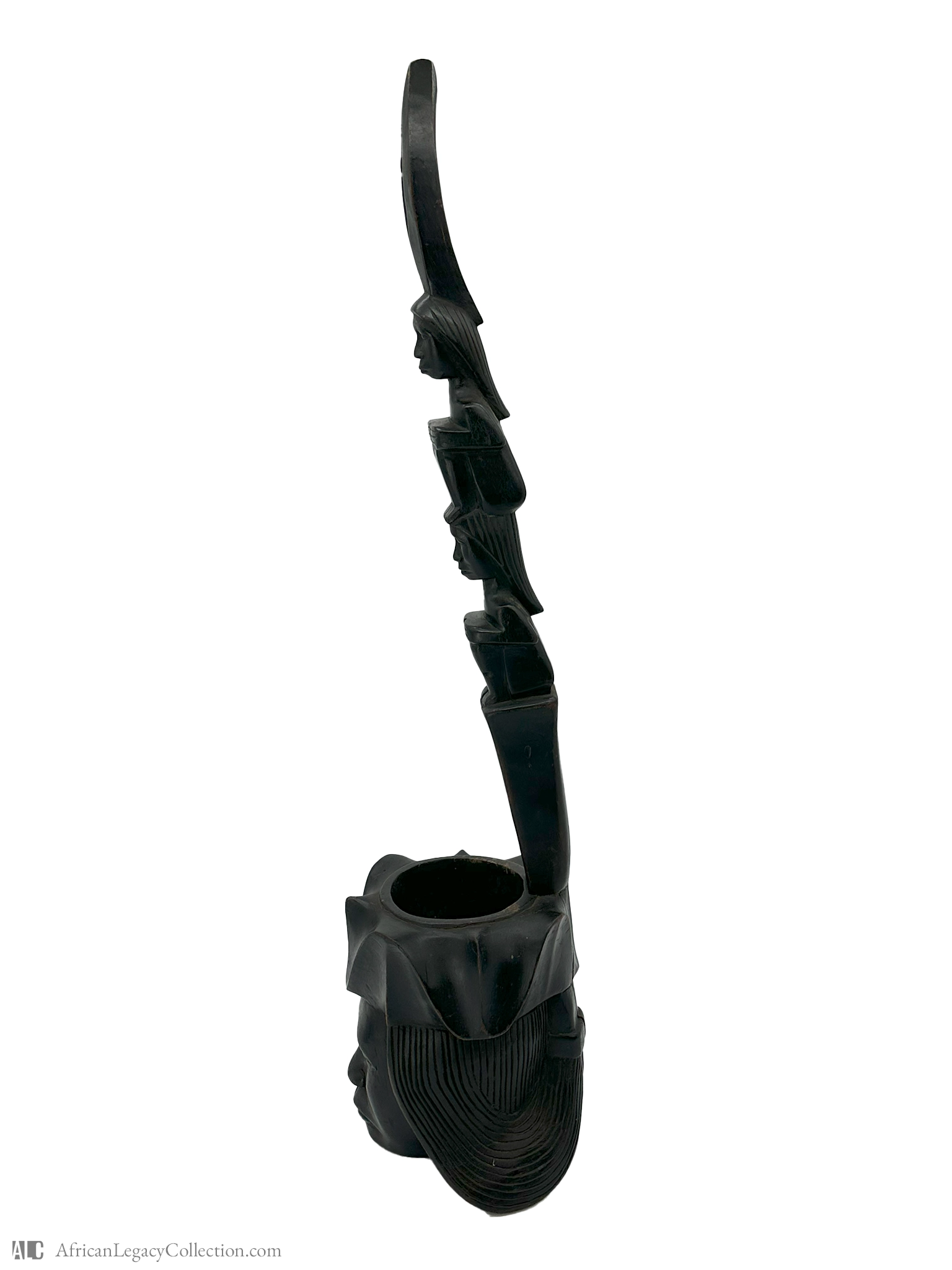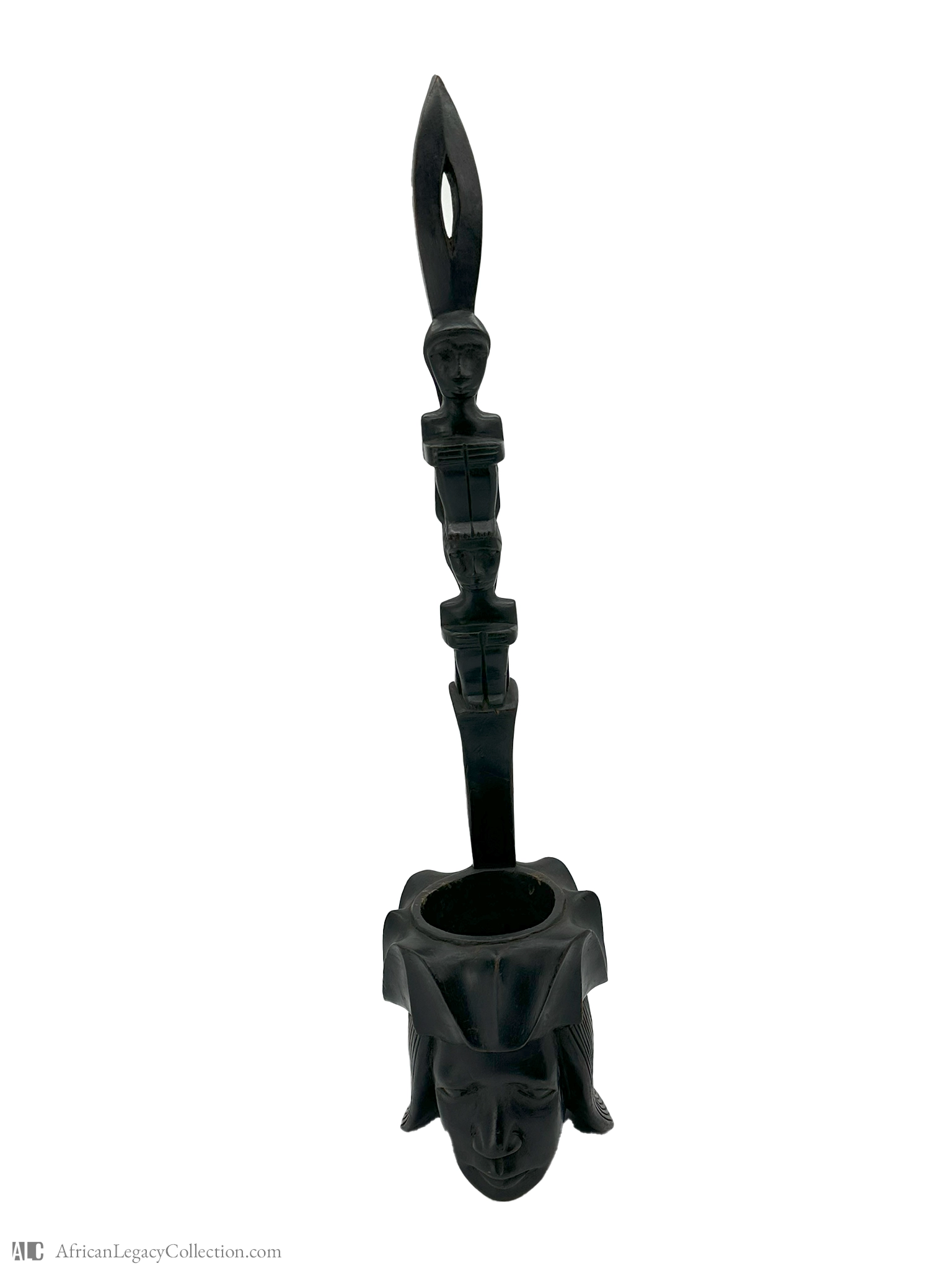 This artifact is a ceremonial African pipe, potentially originating from Central African tribes. Its distinct anthropomorphic features suggest it was used in ritualistic contexts and serves as both a social and spiritual instrument.