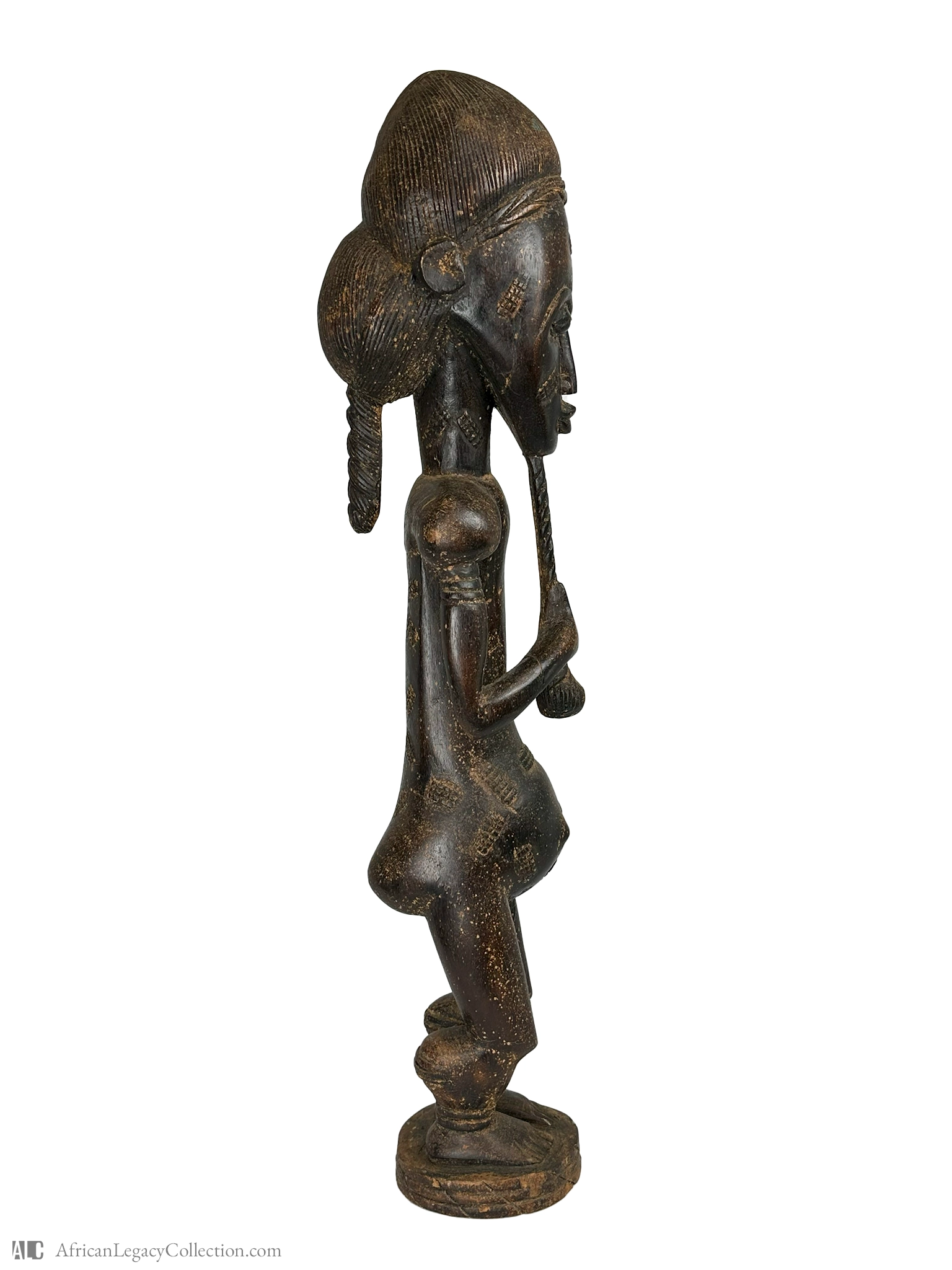 Crafted primarily from wood, this figure showcases skilled craftsmanship through incised striations and smooth patina, indicative of significant age and use. It reflects historical cultural practices where such carvings played a crucial role in religious and social contexts, highlighting the profound spiritual connections within these communities.