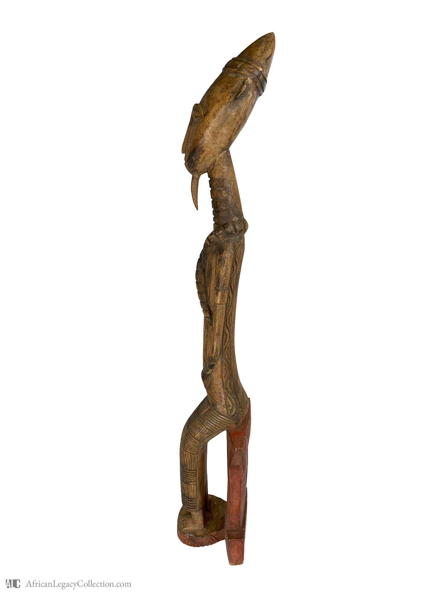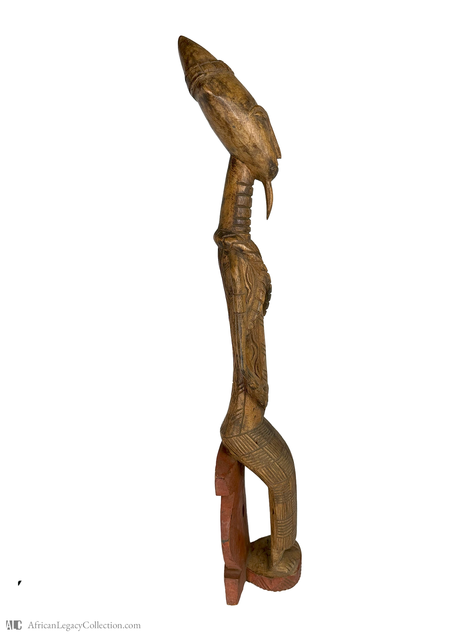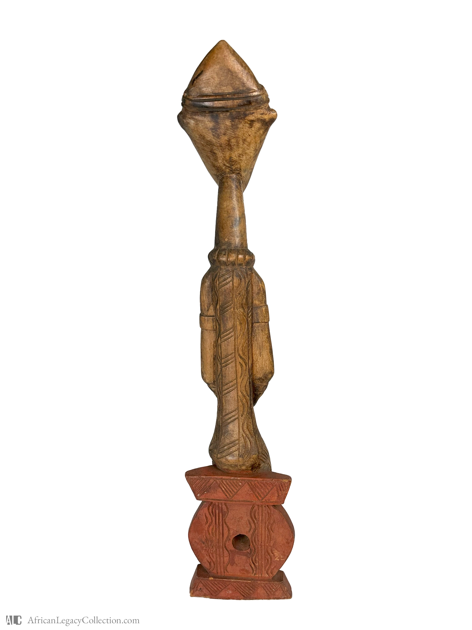 This artifact is likely a ceremonial figure from West Africa, possibly linked to spiritual or ancestral worship. Its anthropomorphic stylization suggests a human form, which may indicate its use in rituals or as a representation of a deity or ancestor.