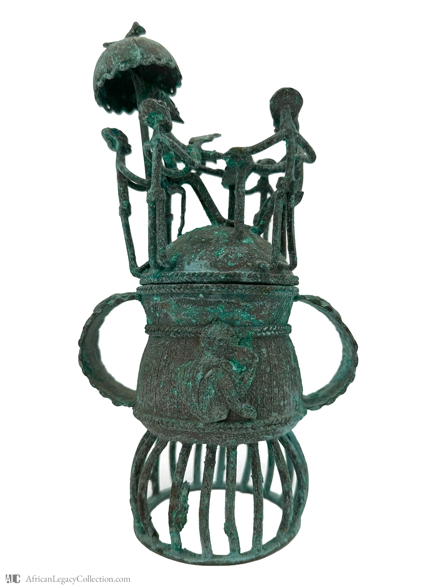 This bronze sculpture likely originates from West Africa and depicts a communal gathering, possibly representative of a ceremonial or social event. The figures and structures suggest roles interconnected with traditional storytelling or ritualistic practices.
