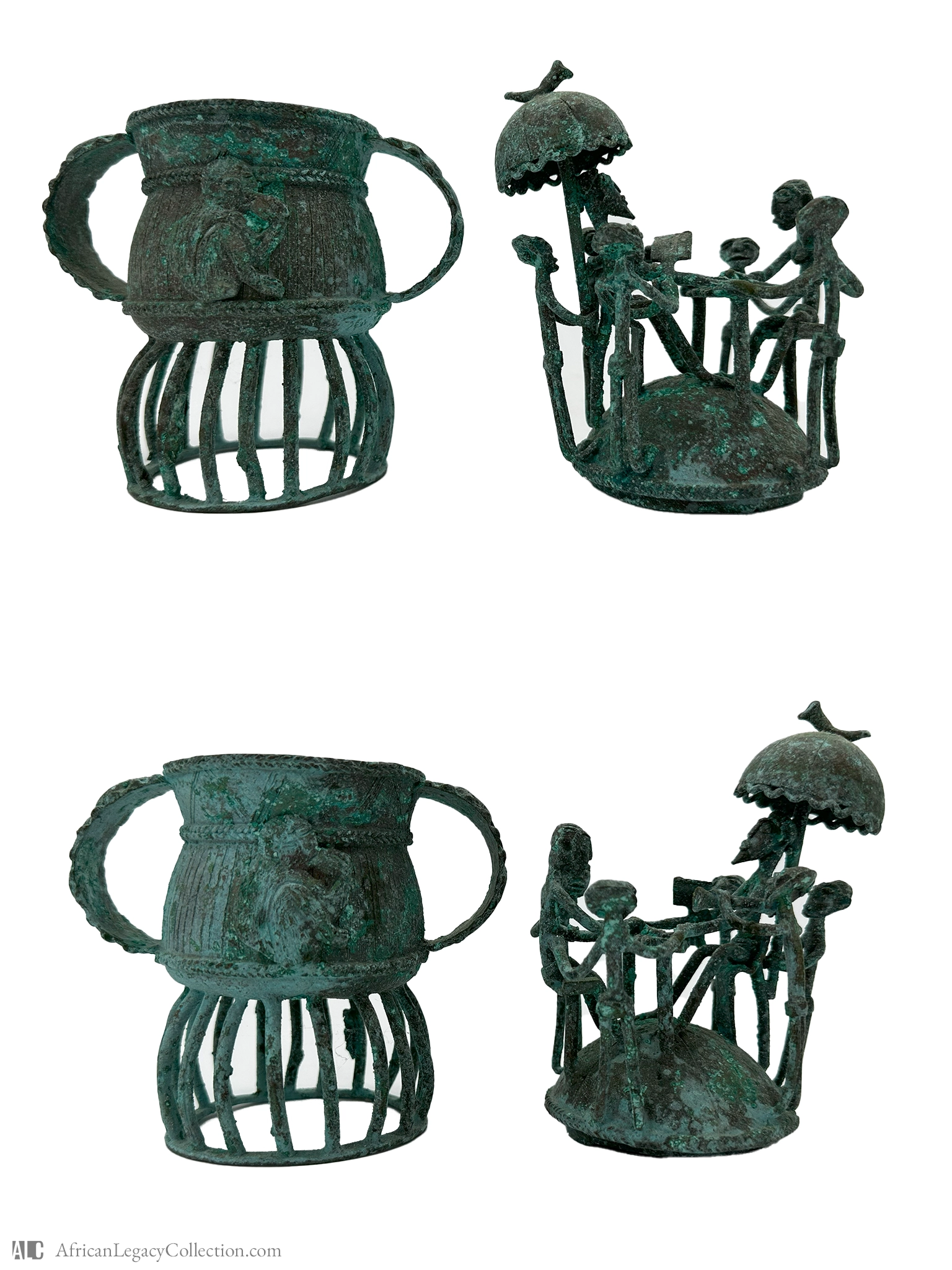 Crafted using the lost-wax casting method, this piece carries historical significance tied to traditional African artistry. The verdigris patina indicates age and exposure, adding aesthetic depth and authenticity. Such artifacts hold importance for both cultural heritage and artistry, symbolizing the intricate social structures and practices of the region.