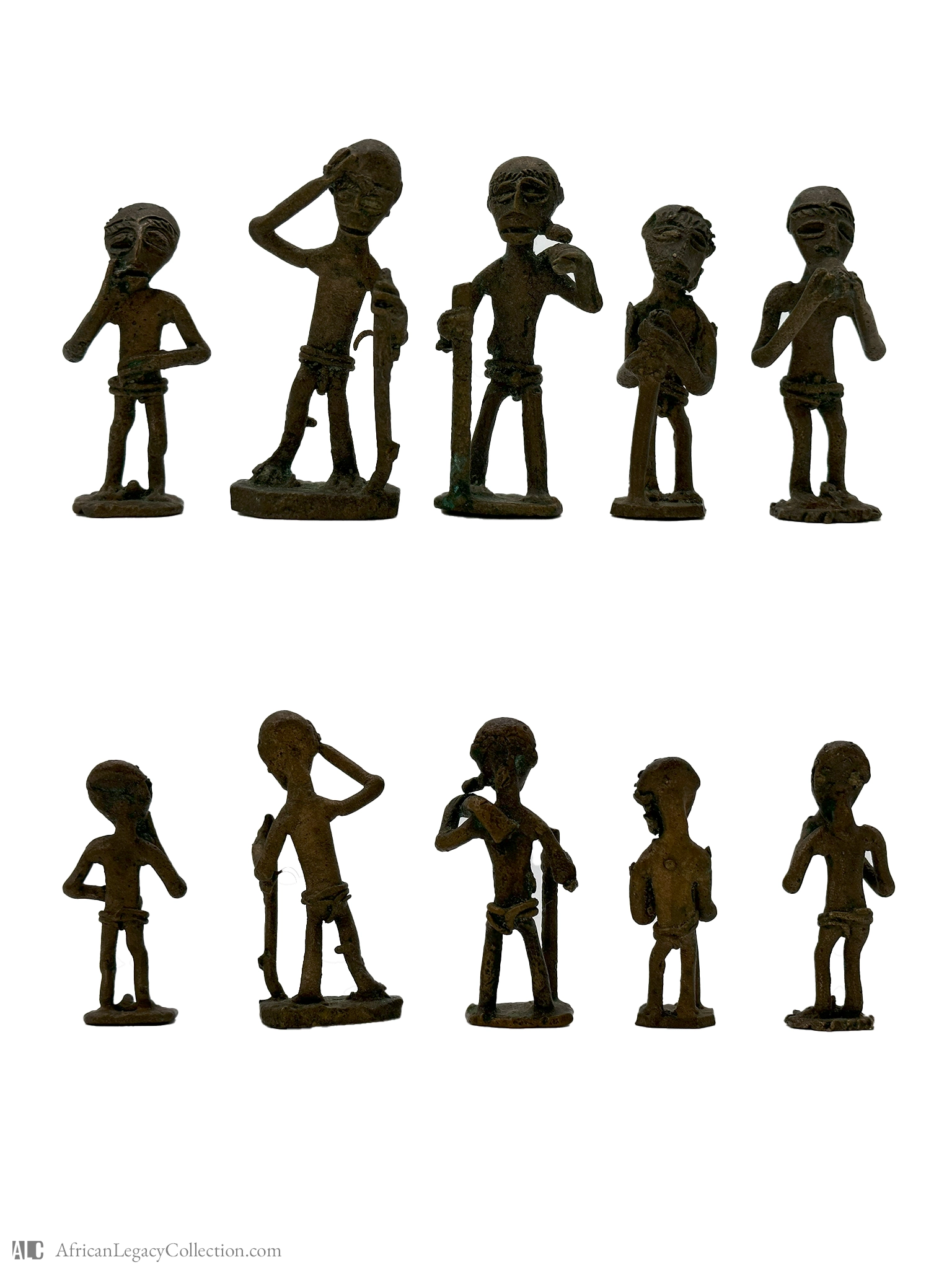 This set of miniatures is likely from the region of West Africa and represents figures in contemplative poses. The purpose of these figures could be linked to ancestral rituals or storytelling within the community, reflecting cultural values and narratives.