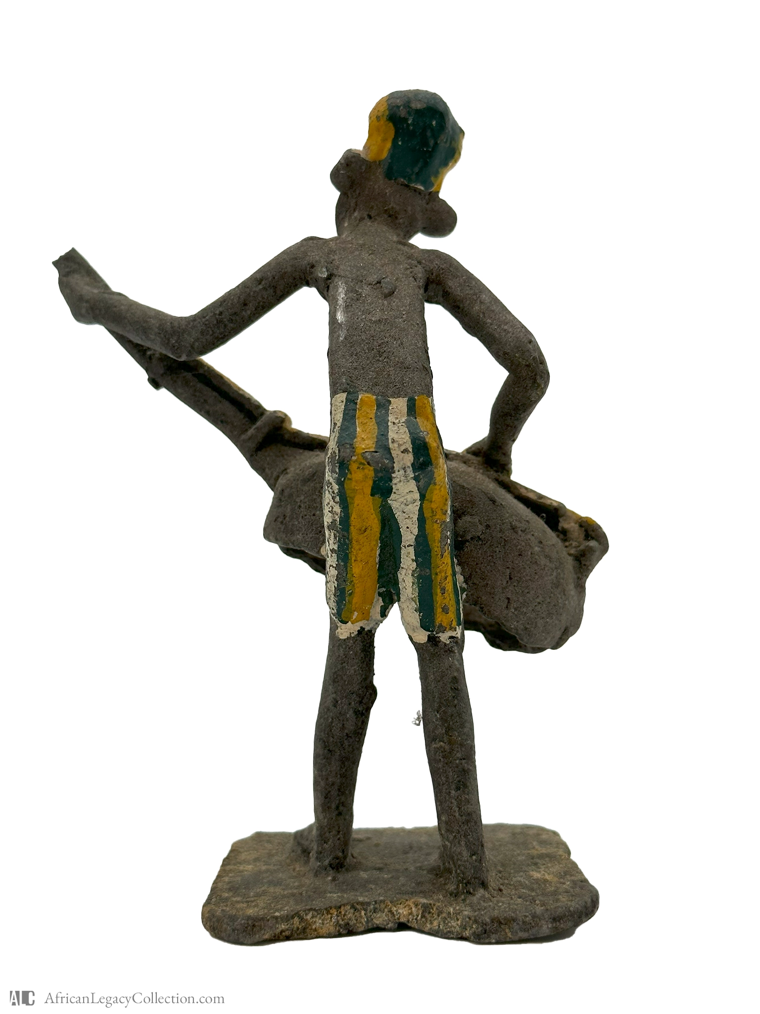 This figurine represents a musician playing a traditional stringed instrument, likely originating from West Africa. Its primary purpose is to depict cultural expressions of music, which plays a significant role in social and ceremonial activities within the region.
