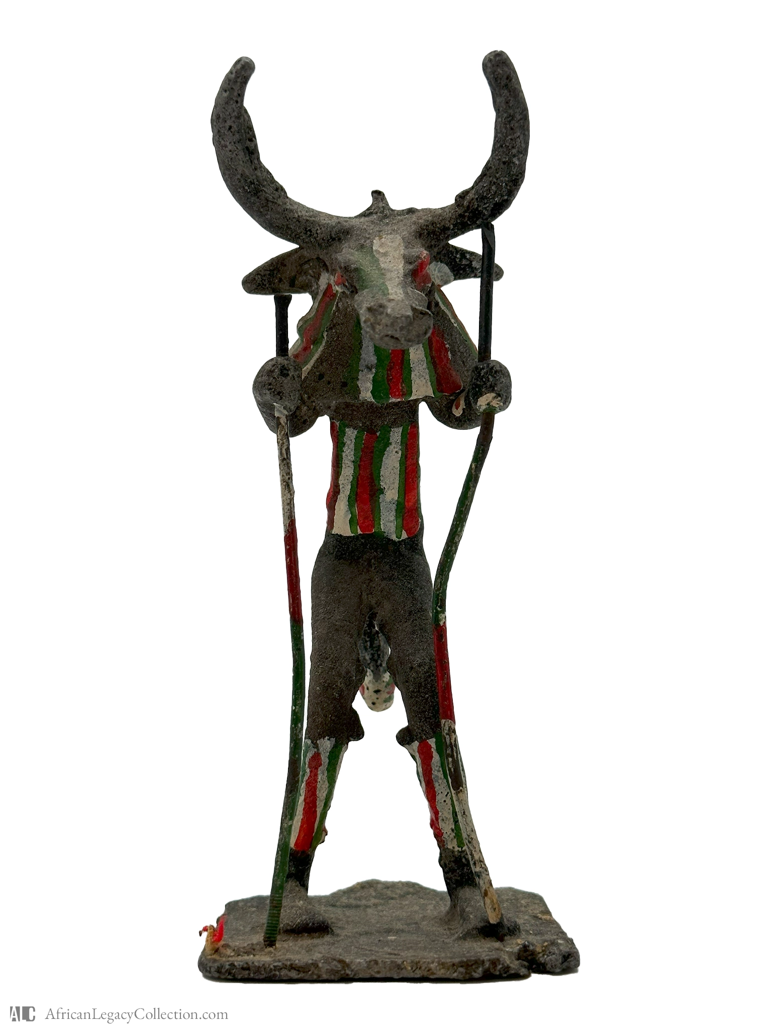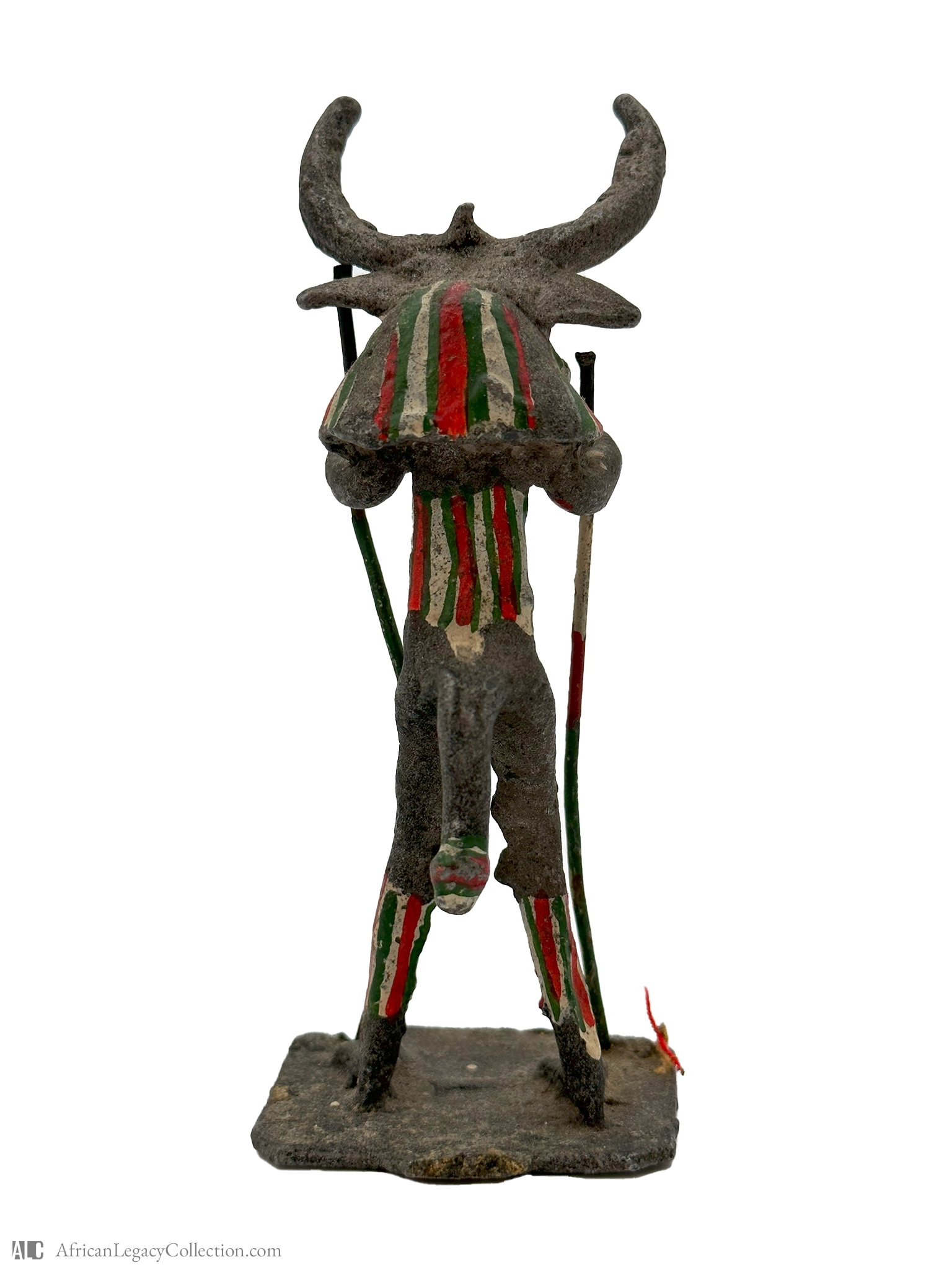 Crafted using the lost-wax casting technique—a method prevalent in African metallurgy—the sculpture showcases intricate details. The vibrant polychrome residues indicate that the artifact might have been used in festive or sacred events. This item exemplifies the skilled metalwork and cultural expression found in West African artistic traditions.