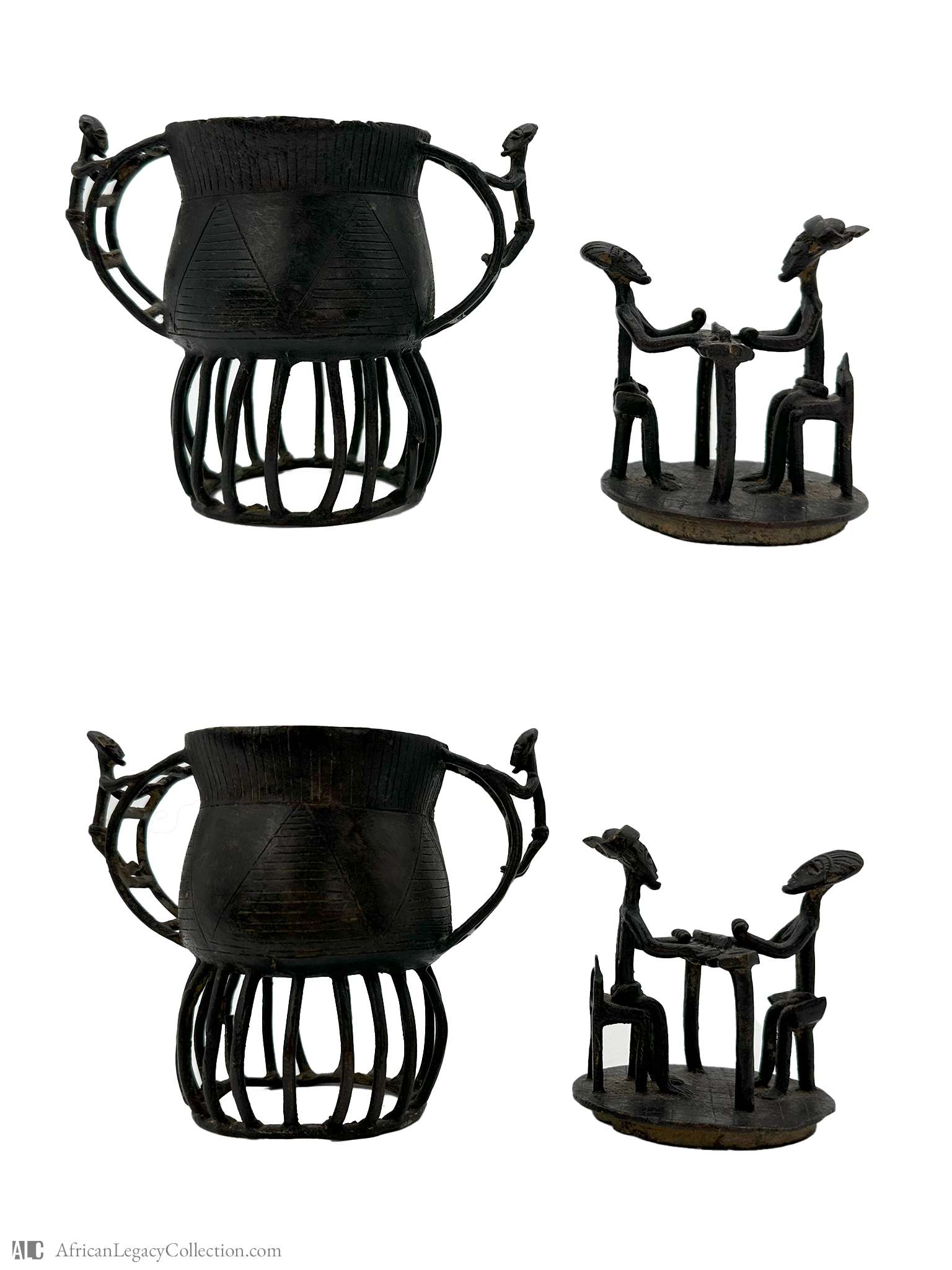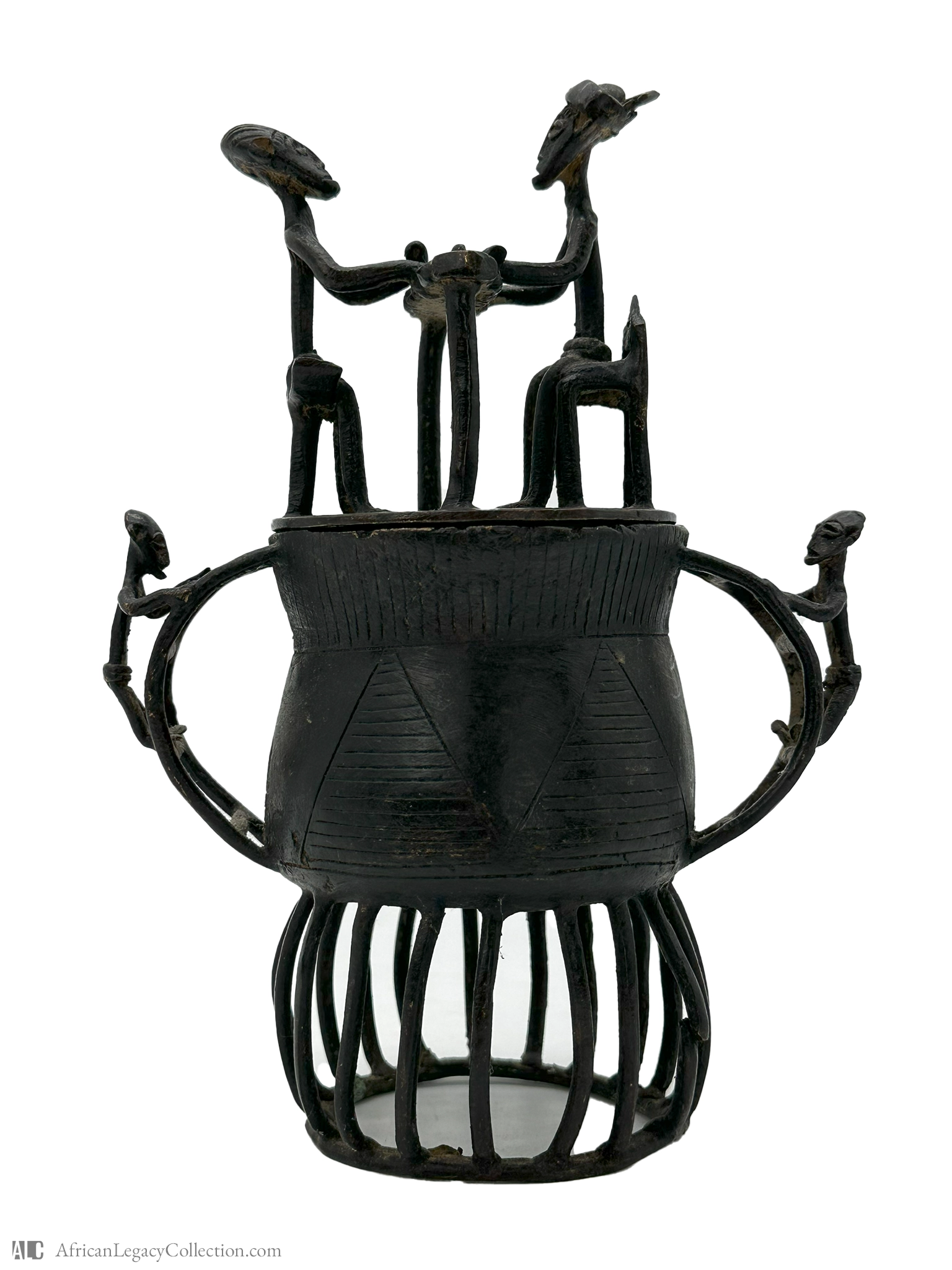 This intricate bronze artifact likely originates from the West African region, possibly linked to the cultural heritage of the Dogon people. Its design features anthropomorphic figures in a communal setting, suggesting its use as a ceremonial object or as a vessel with a symbolic purpose.