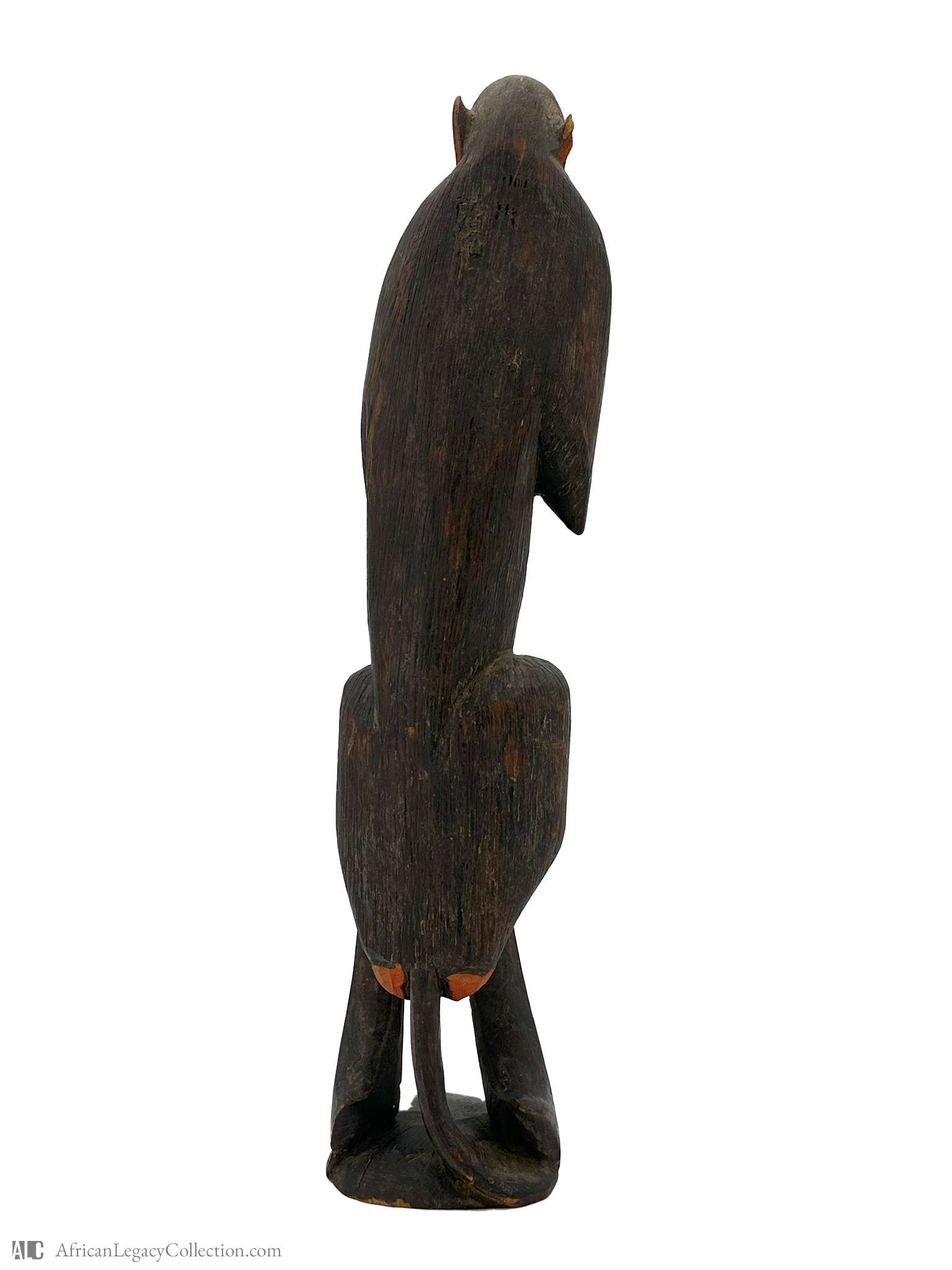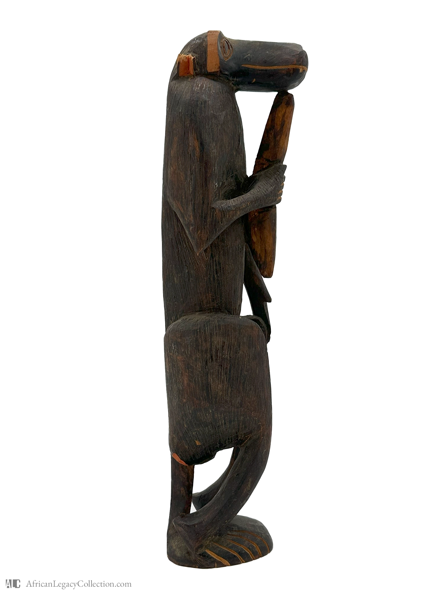 This African artifact is a carved wooden figure, likely representing an animal form with anthropomorphic features, characteristic of ritualistic or ceremonial objects. It is probable that this piece originates from West Africa, where such sculptures often serve symbolic purposes in local traditions.