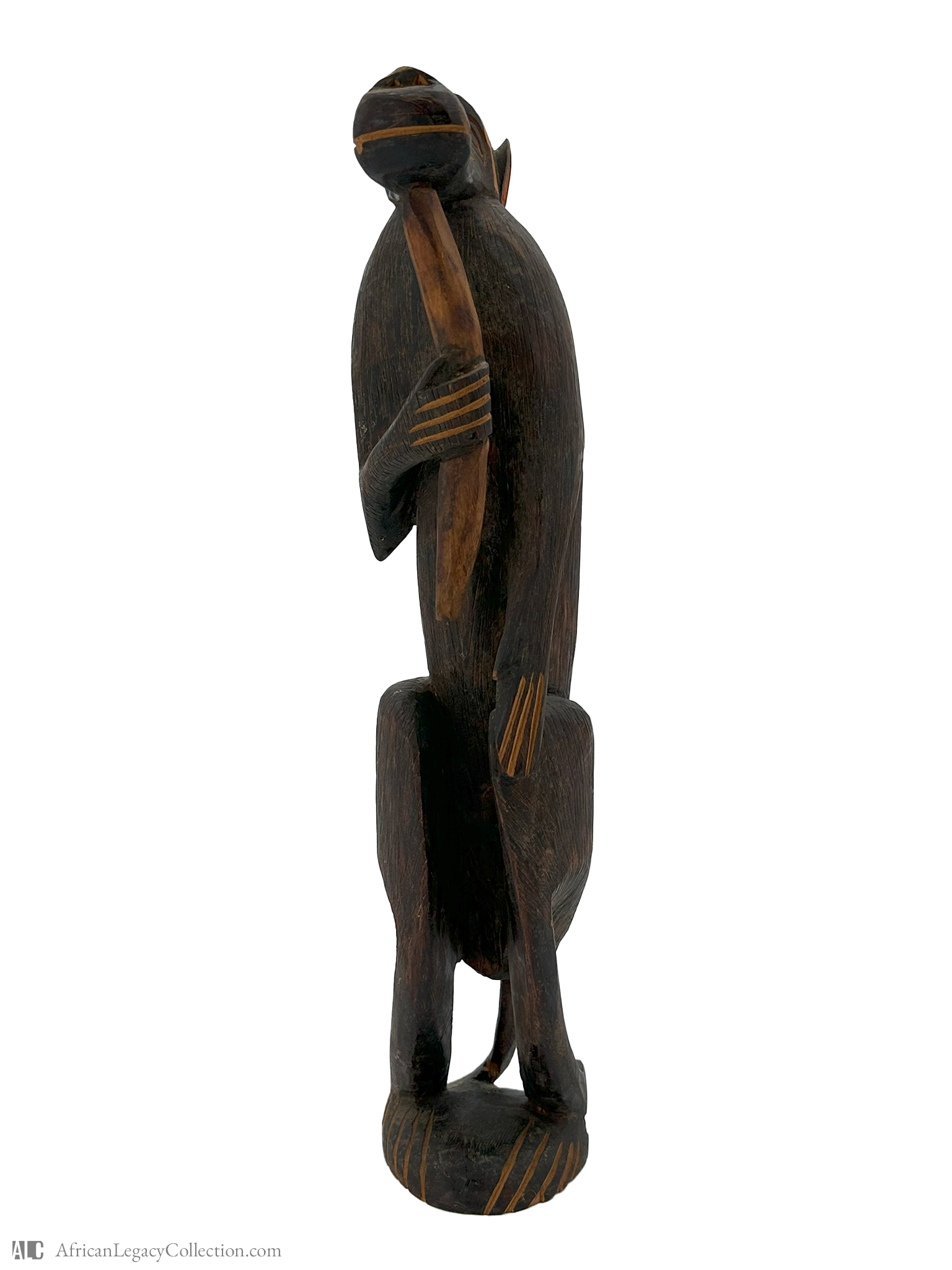 The figure is carved from wood, displaying fine incised striations that highlight the artisanal skill involved in its creation. Such artifacts typically date back to the early to mid-20th century, embodying cultural significance possibly related to storytelling or spiritual practices.