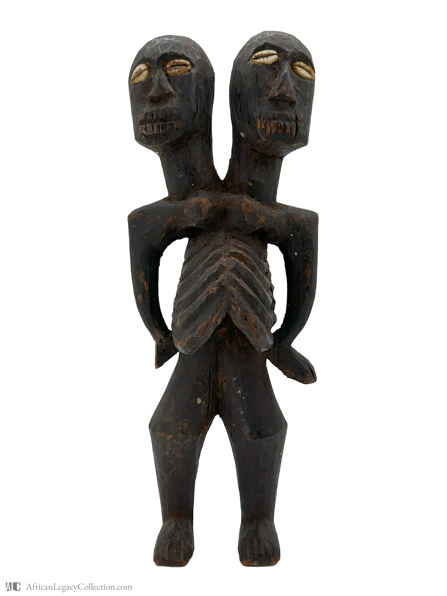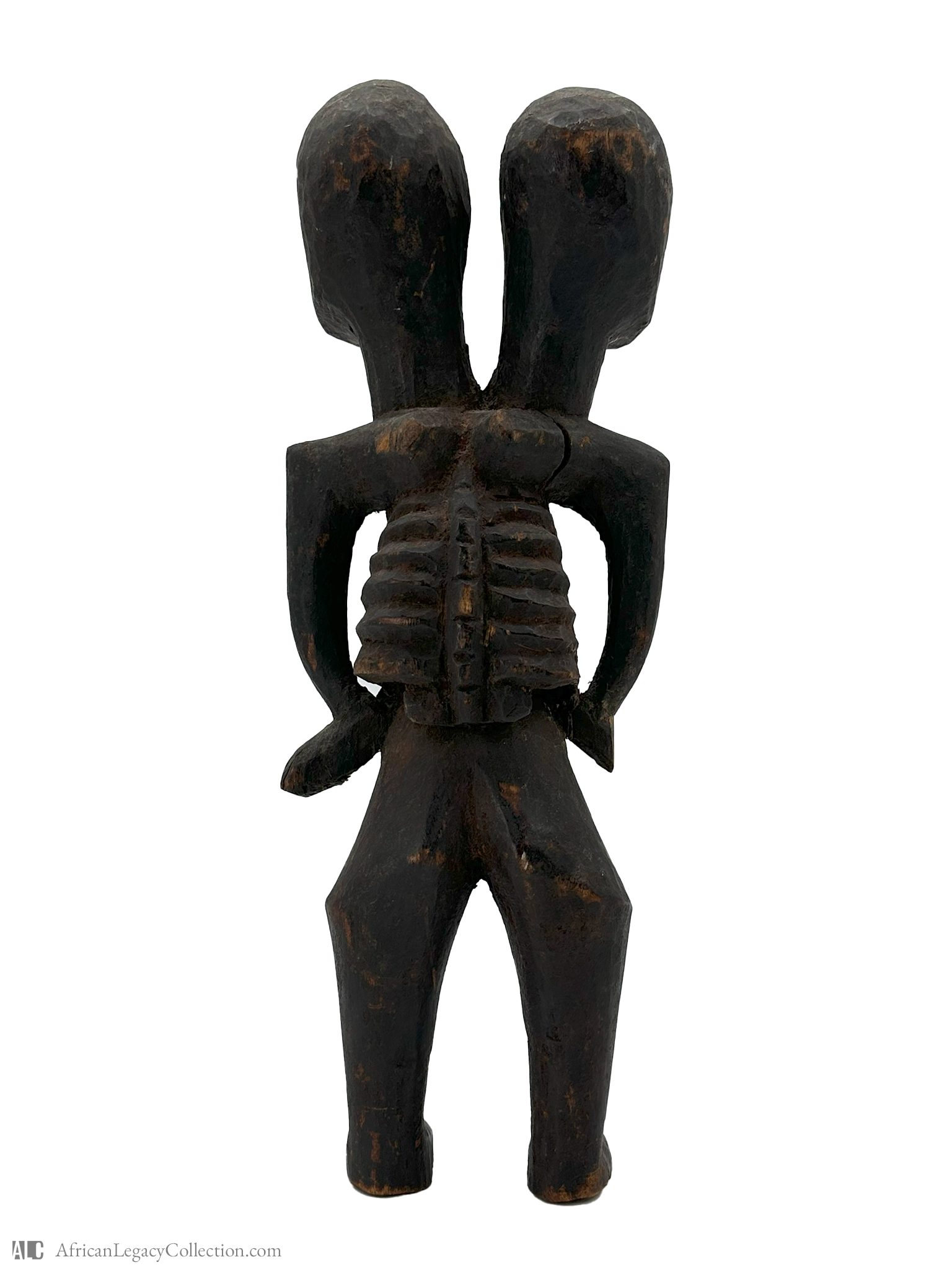 This carved wooden figure likely originates from Central Africa, and represents a symbolic or ritualistic artifact. The dual heads and ribbed body may indicate a connection to spiritual beliefs or cultural narratives involving duality and protection.