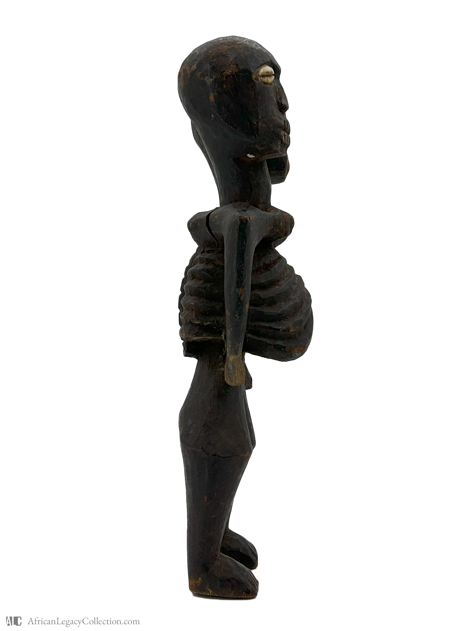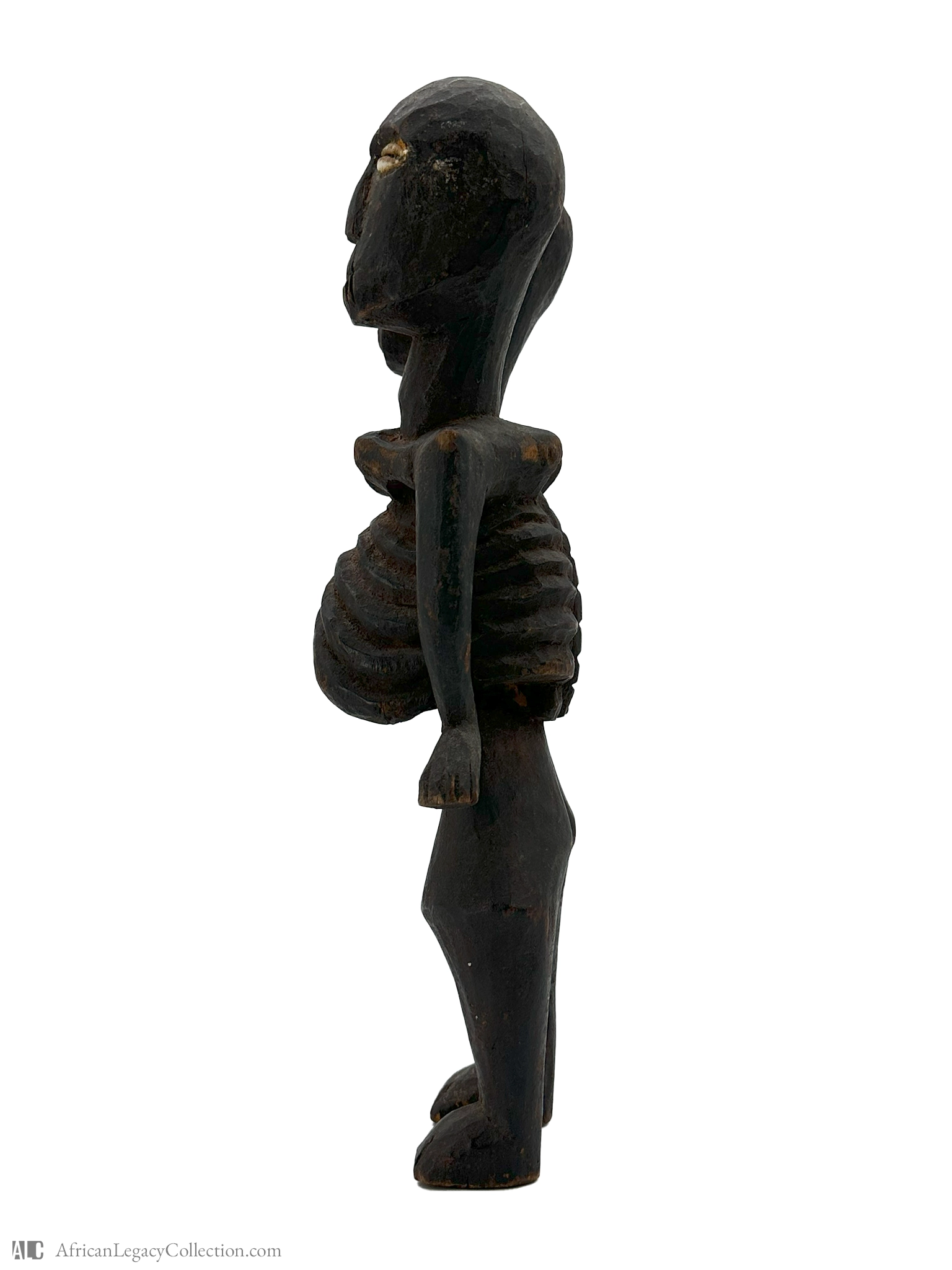The artifact is crafted from wood, a common material in African art, possibly employing incised striations and scarification motifs. It may date to the late 19th or early 20th century. Such figures often held cultural significance, possibly serving roles in community rituals or as protective symbols.