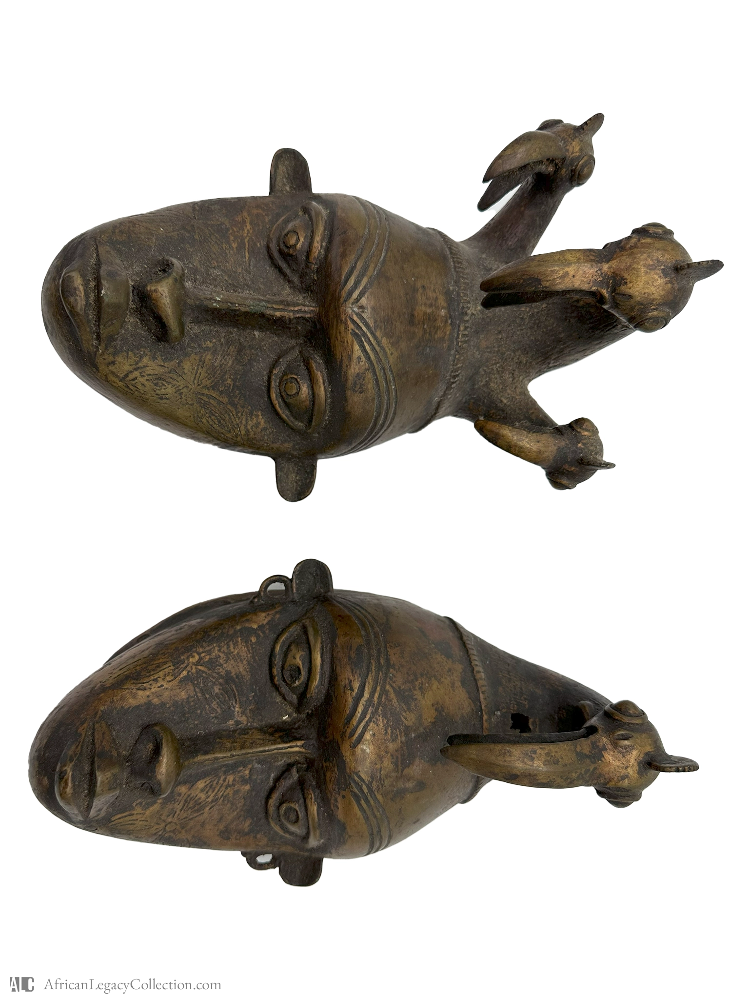 This artifact is a bronze vessel likely originating from West Africa, characterized by an anthropomorphic design that suggests cultural or ritual significance. The form and motifs point to its use in ceremonial or symbolic contexts, possibly as a container for ritual offerings or sacred substances.