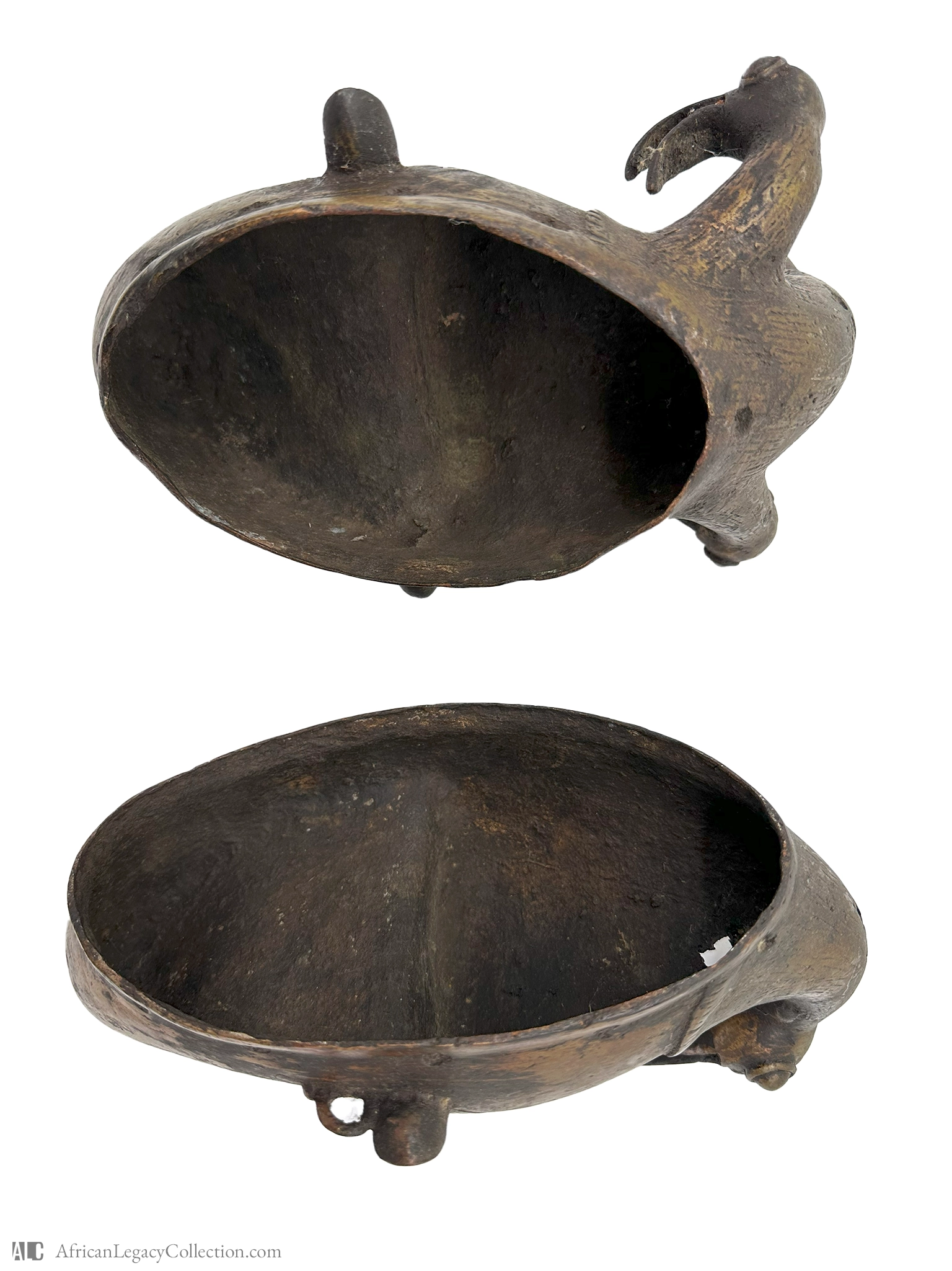 The vessel is crafted using the lost-wax casting technique, a traditional method in African bronze work. Its historical context ties to a period when such artifacts played a central role in representing authority and spiritual beliefs. The craftsmanship and enduring material highlight its cultural and historical value.