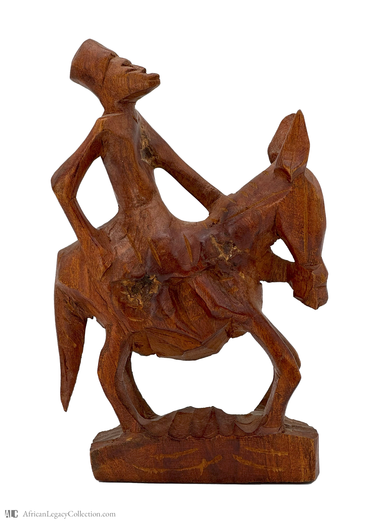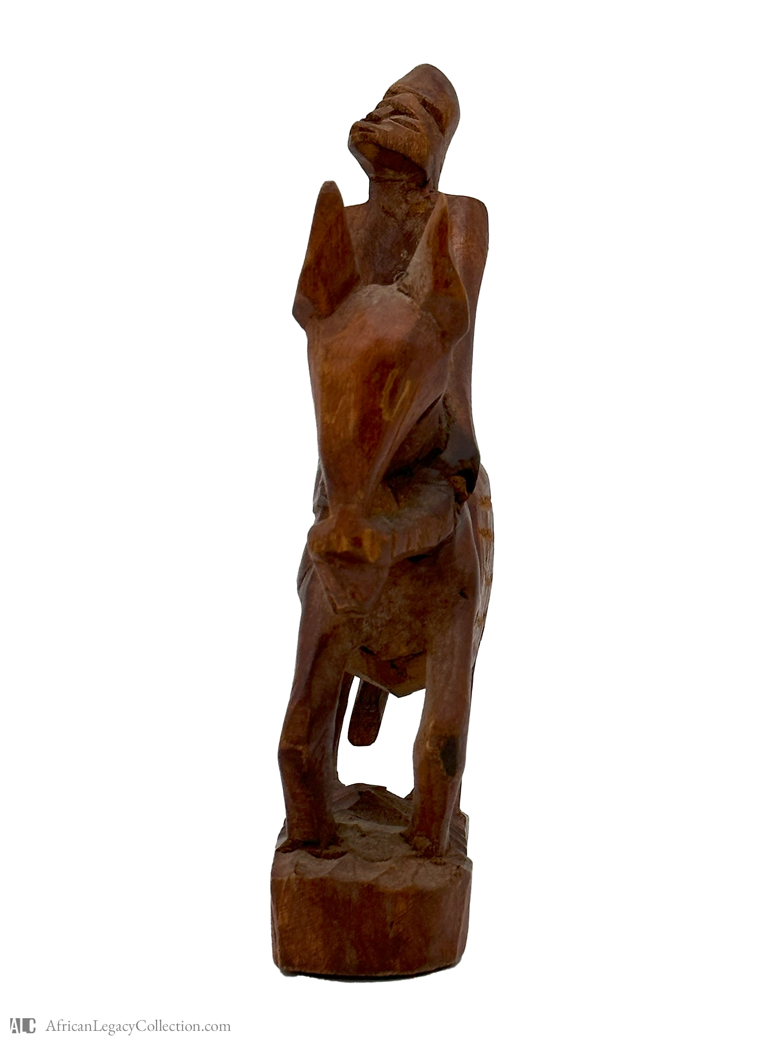 This wooden sculpture likely represents a figure riding an animal, possibly showcasing a cultural narrative or status symbol. The style suggests it could be from West Africa, serving as a piece of traditional art used in rituals or as a decorative item to signify social or spiritual status within a community.