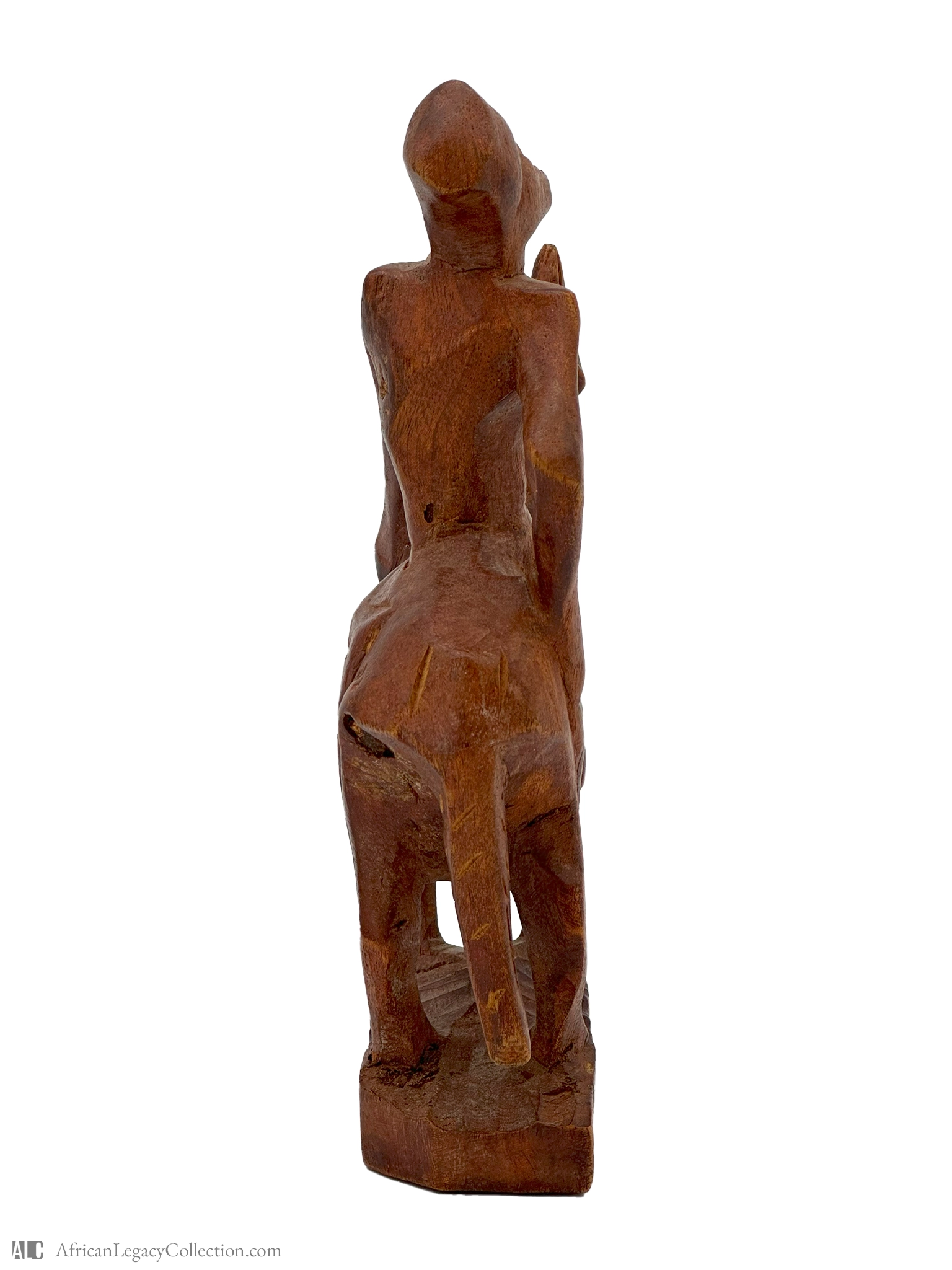 The sculpture is crafted from a single piece of wood, employing techniques such as incised striations to add detail to the figure’s body and the animal. The historical context points to a tradition of storytelling and symbolism in African art, highlighting the significance of the rider-animal motif in conveying power and prestige.