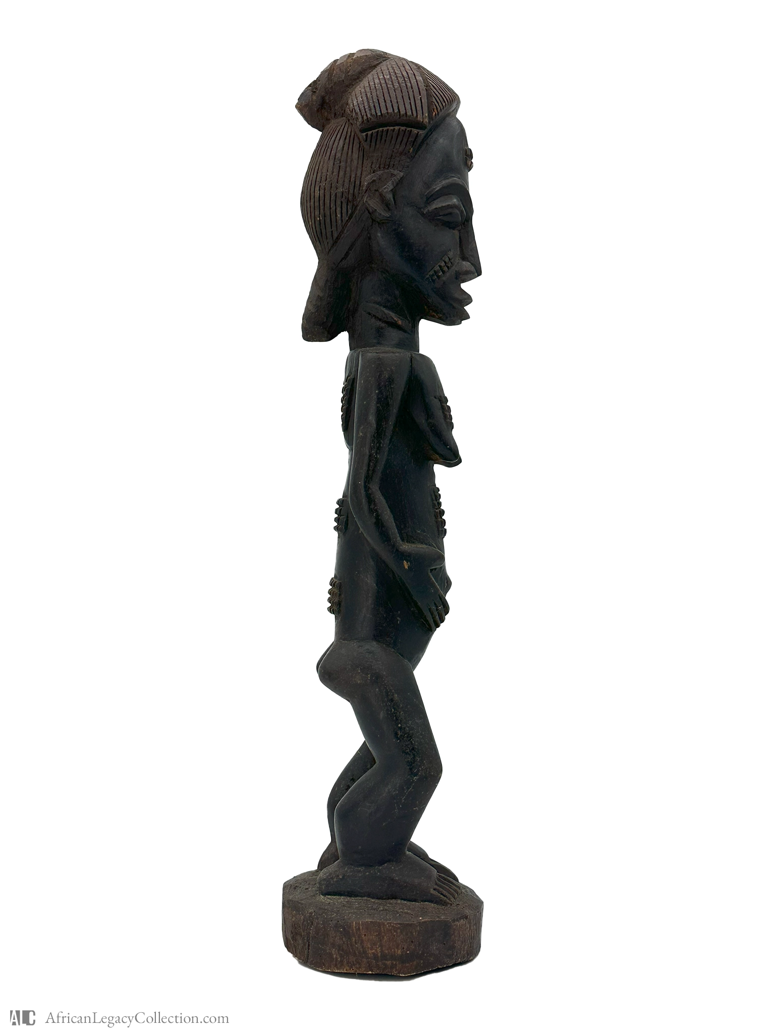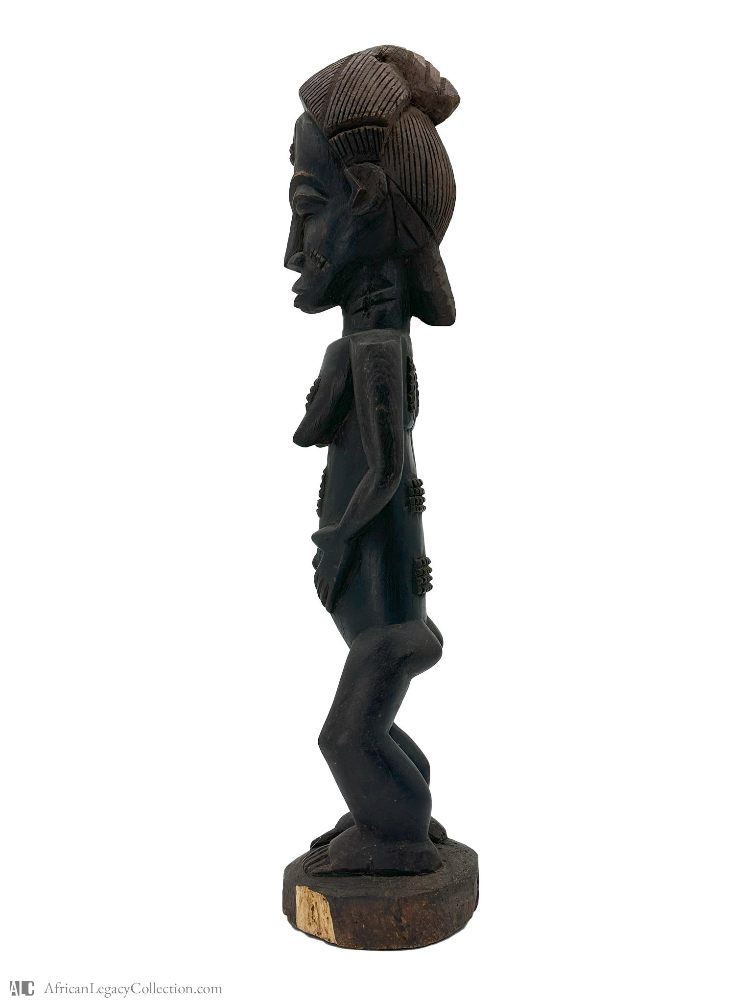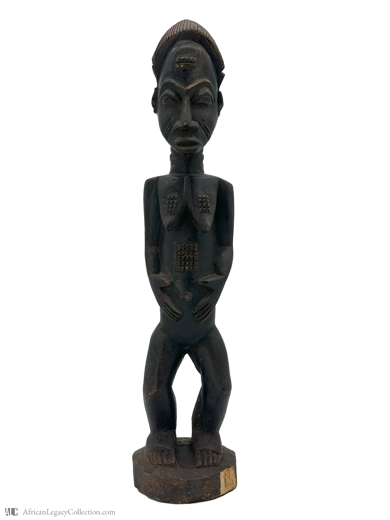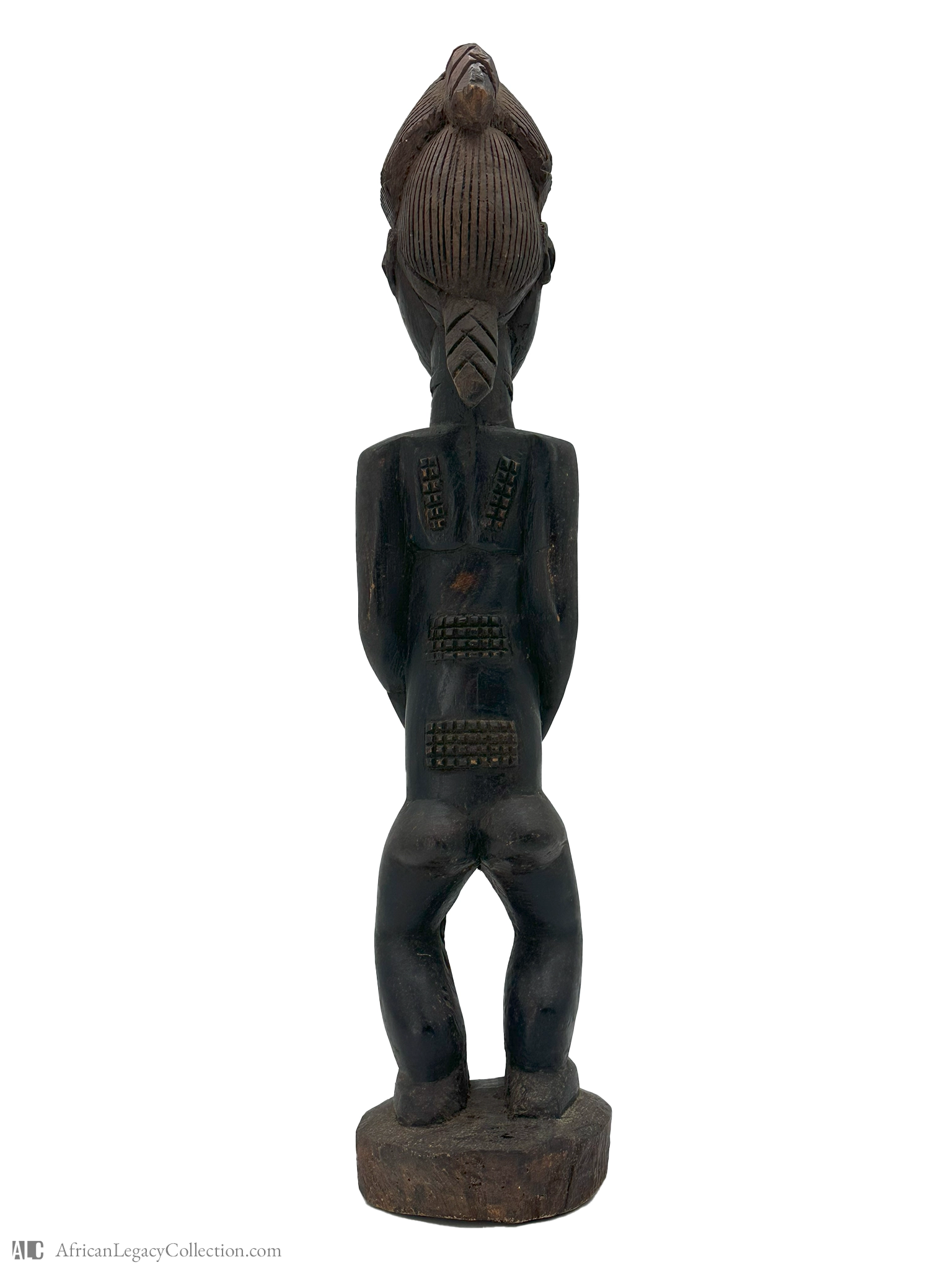 The sculpture is crafted from a single piece of wood, using traditional carving techniques. The historical context of such figures is deeply rooted in communal rituals and the honoring of ancestors, reflecting the rich spiritual traditions of Central African societies. The presence of incised patterns and stylization underscores its cultural importance.