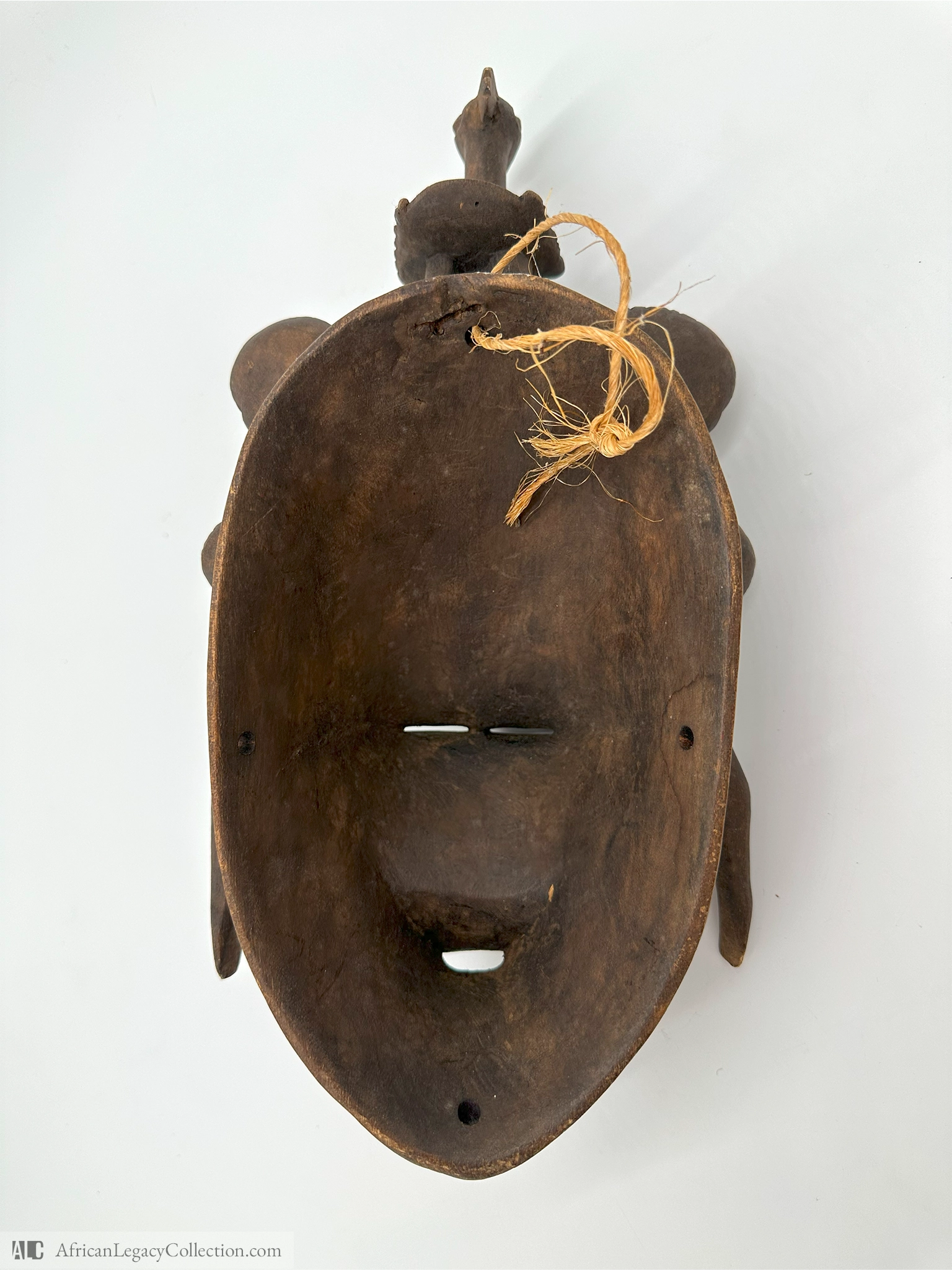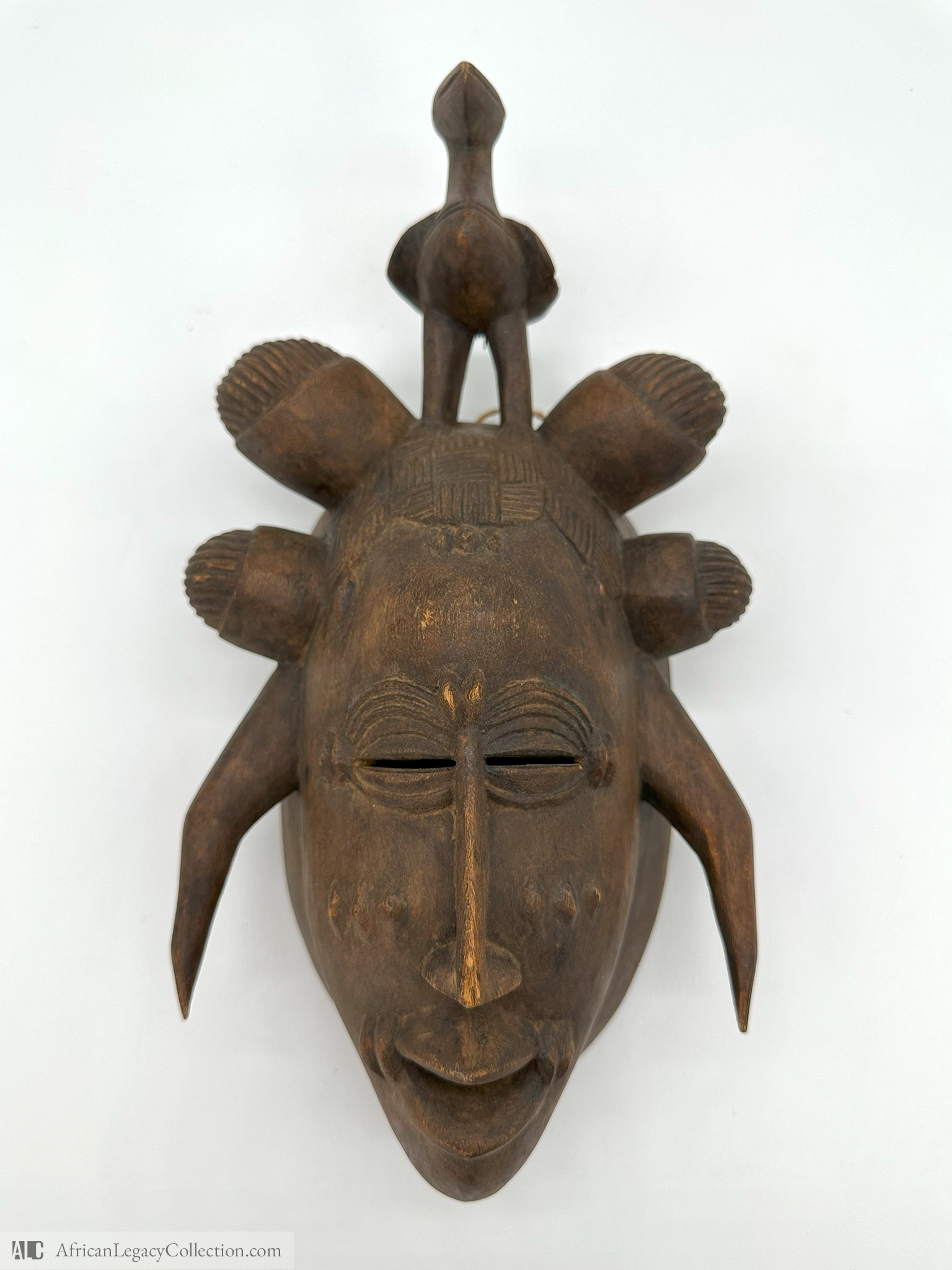 This wooden mask likely originates from the Baule people of West Africa. Used predominantly in ceremonial dances, masks like this embody spirits or ancestors, playing an integral role in societal and religious functions. The design suggests it may represent a spiritual entity or convey cultural narratives unique to the Baule.
