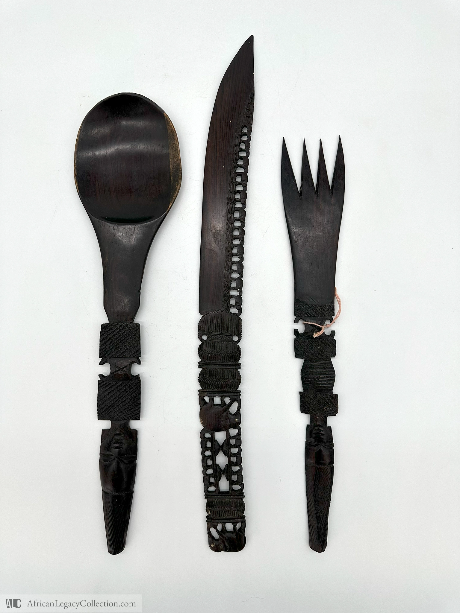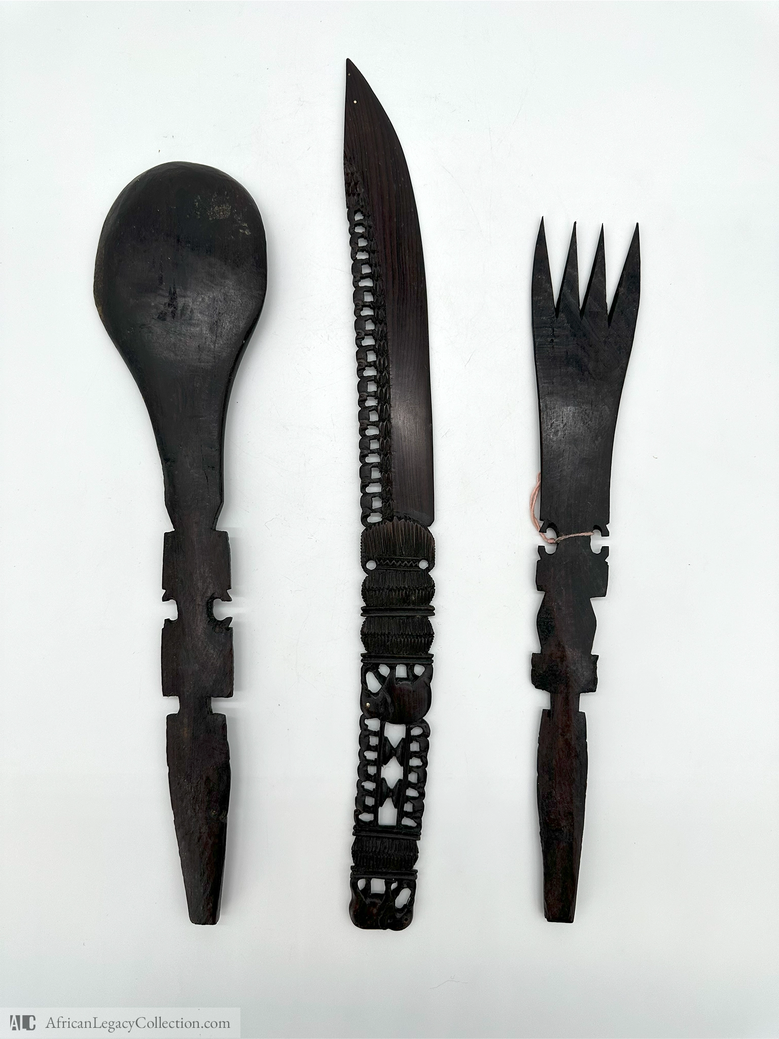 This set of wooden utensils, likely originating from West Africa, comprises a spoon, a knife, and a fork. These items are often used for ceremonial or decorative purposes rather than practical dining. The intricate carvings and design suggest cultural importance, possibly related to communal feasting or ritualistic events.