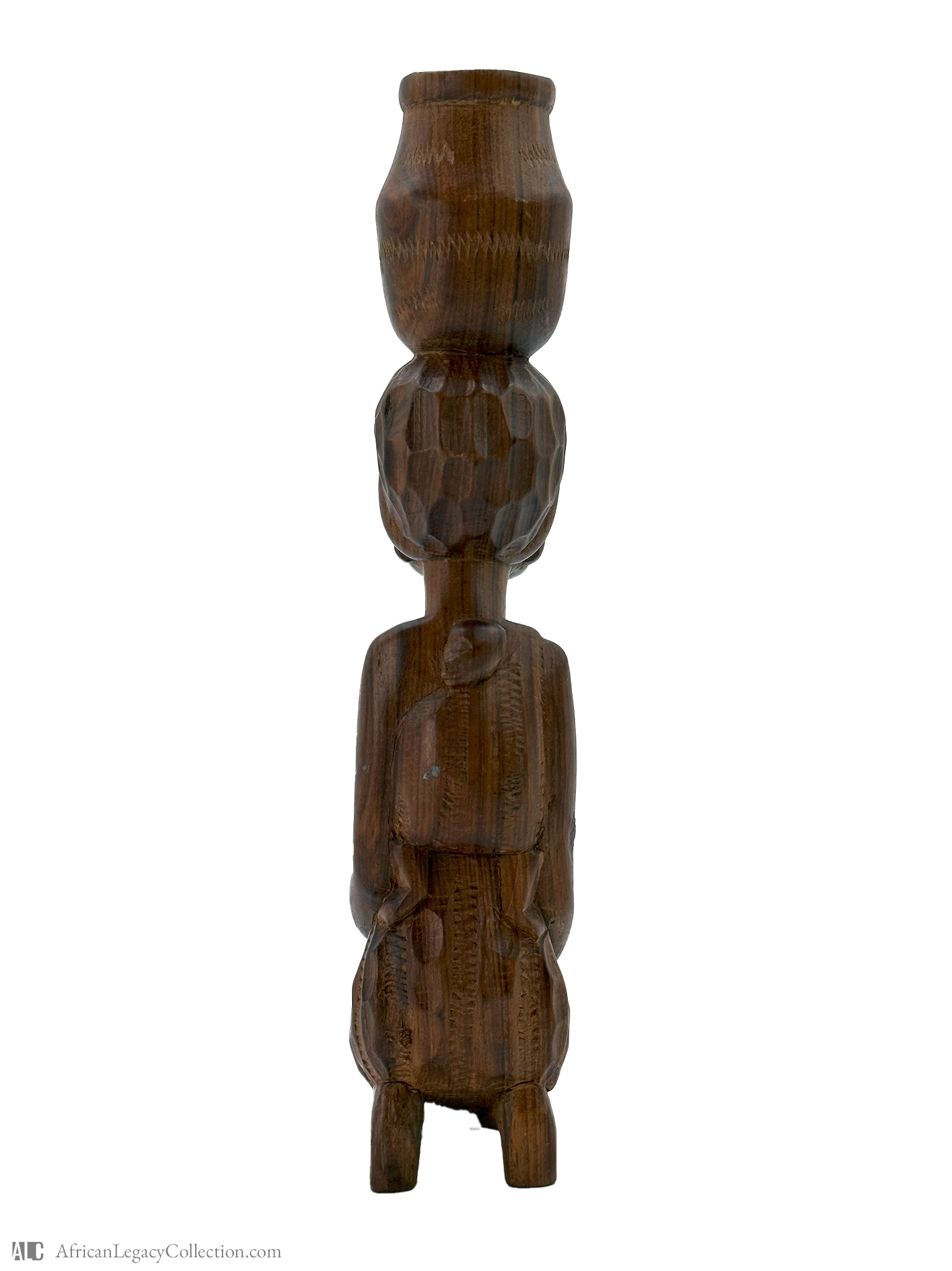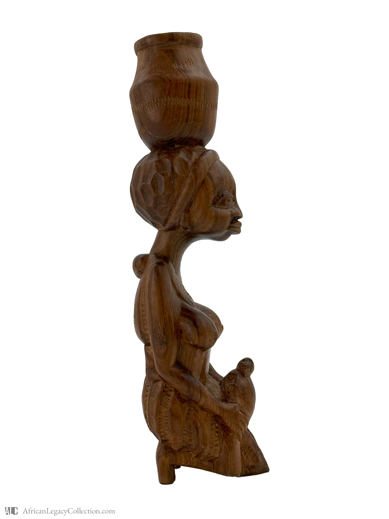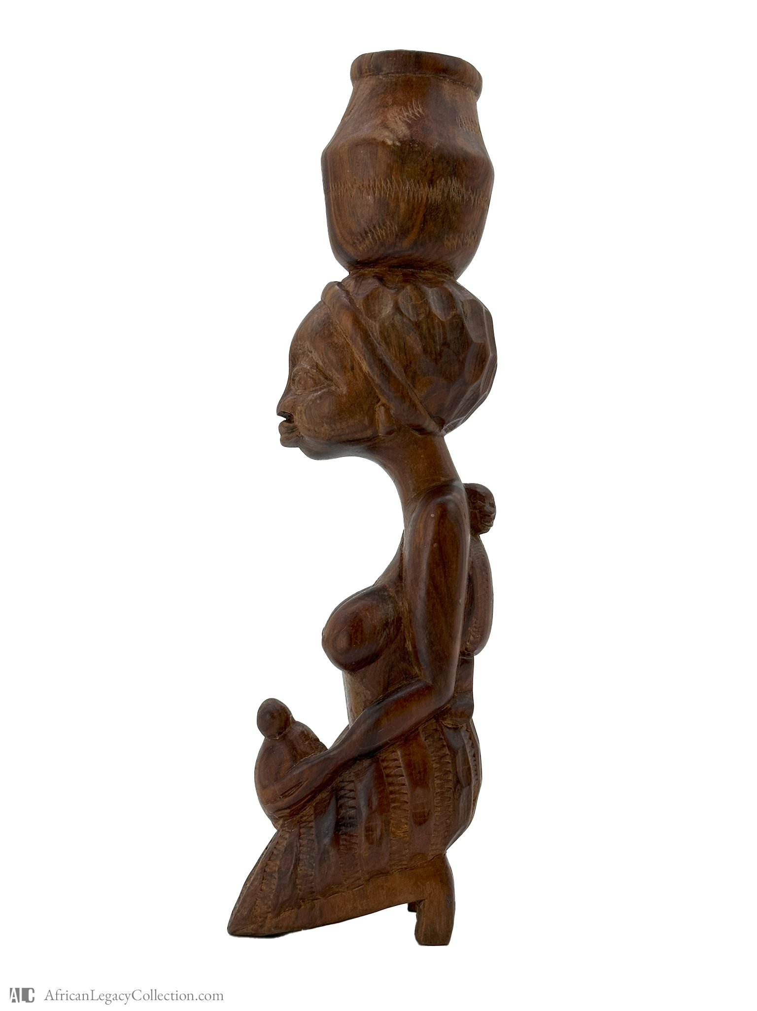 This wooden sculpture likely originates from West Africa, portraying a woman carrying a vessel on her head while holding a child. It may have served a ceremonial or functional purpose, representing familial roles and responsibilities within the community.