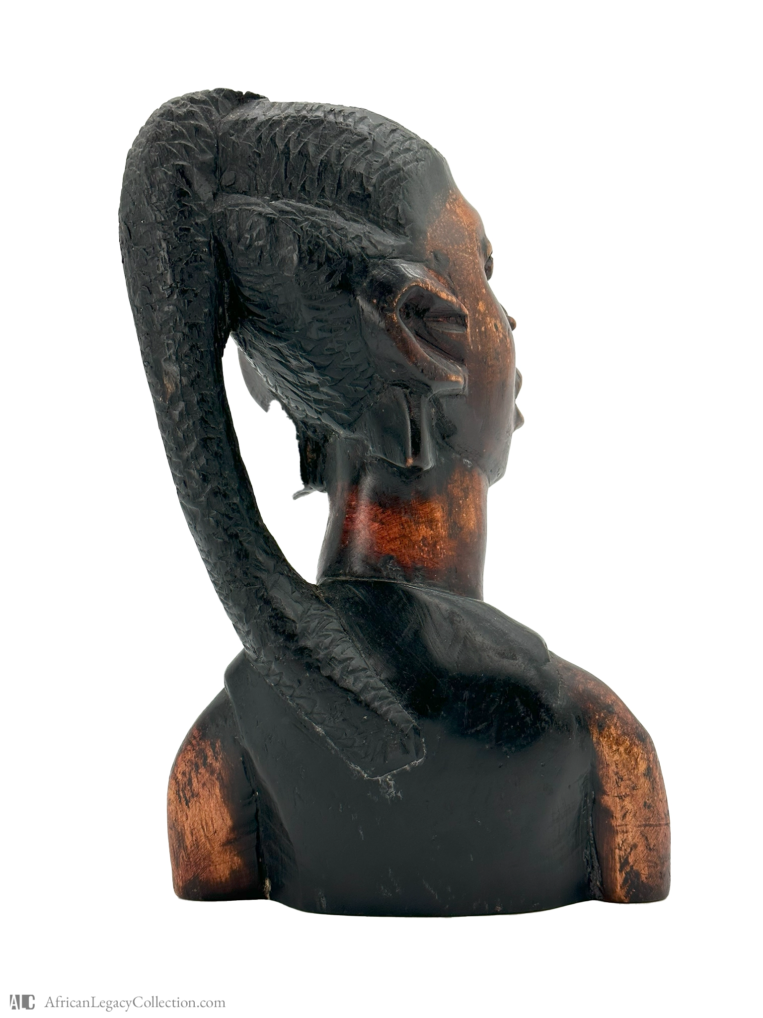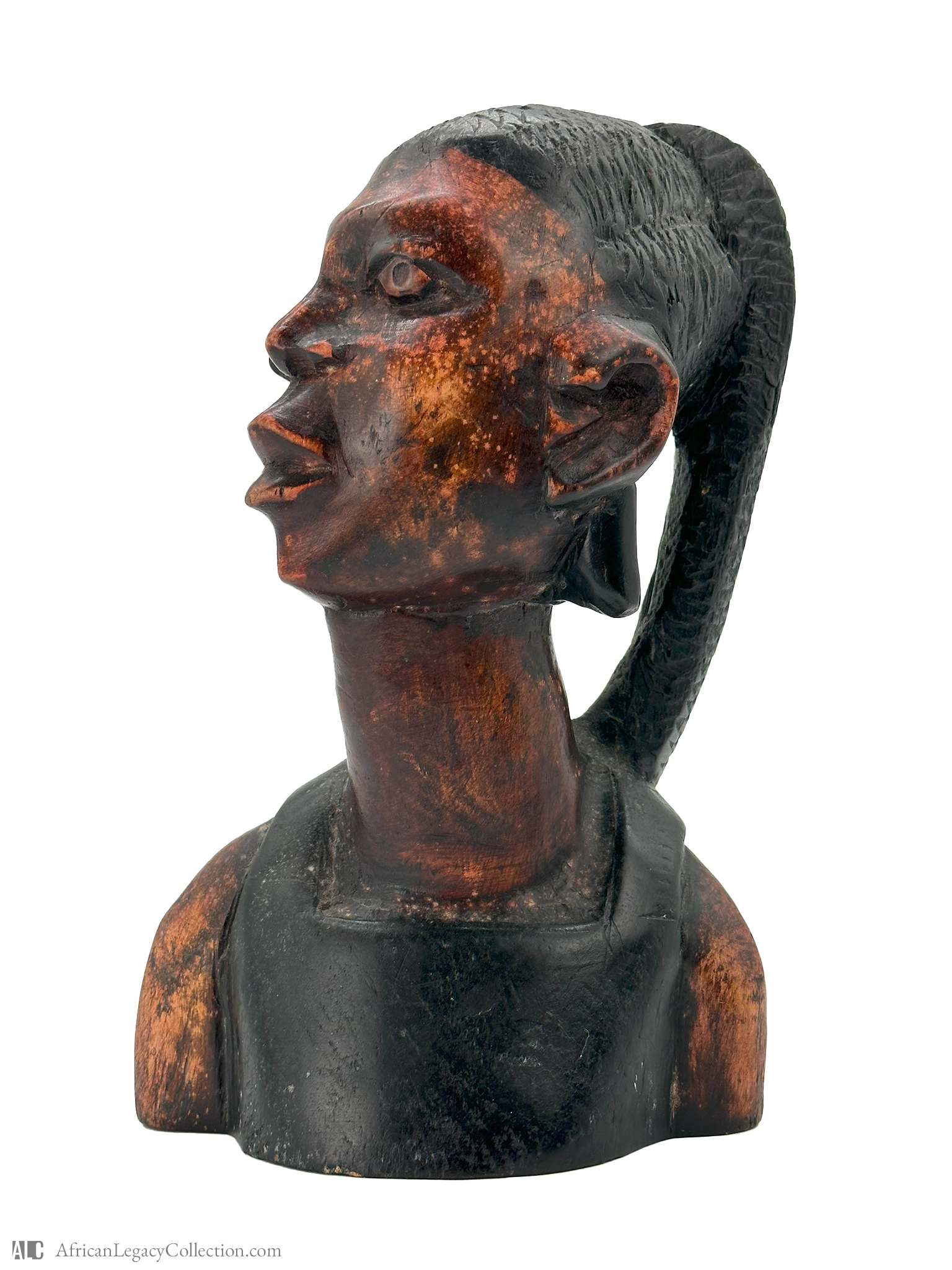 The sculpture is crafted from wood, showcasing skillful carving techniques, evident in the detailed facial features and hairstyle. The patina indicates age and use, suggesting a historical period of notable importance. Such artifacts are significant in understanding cultural identities and practices, capturing artistic expression and historical relevance.