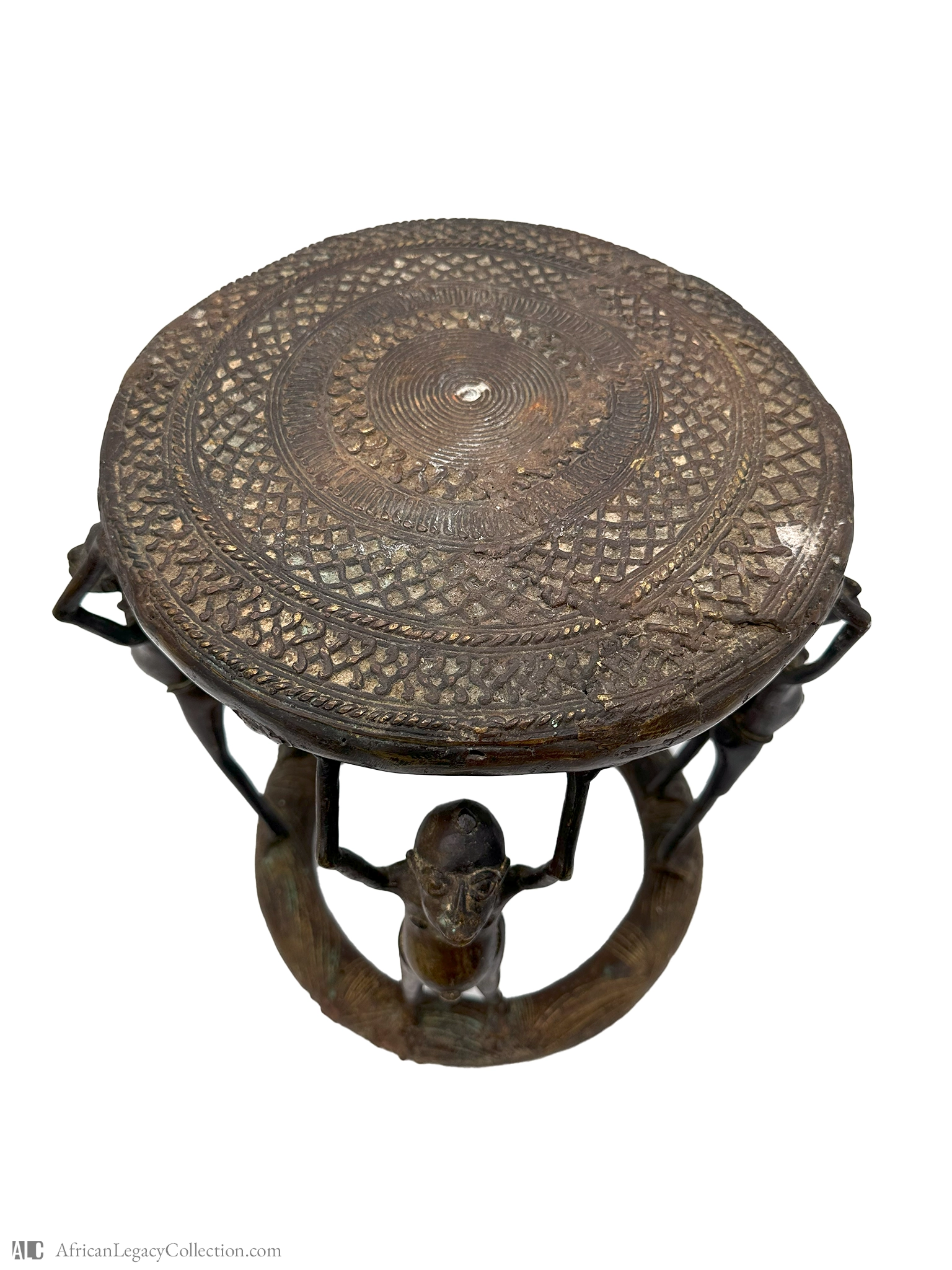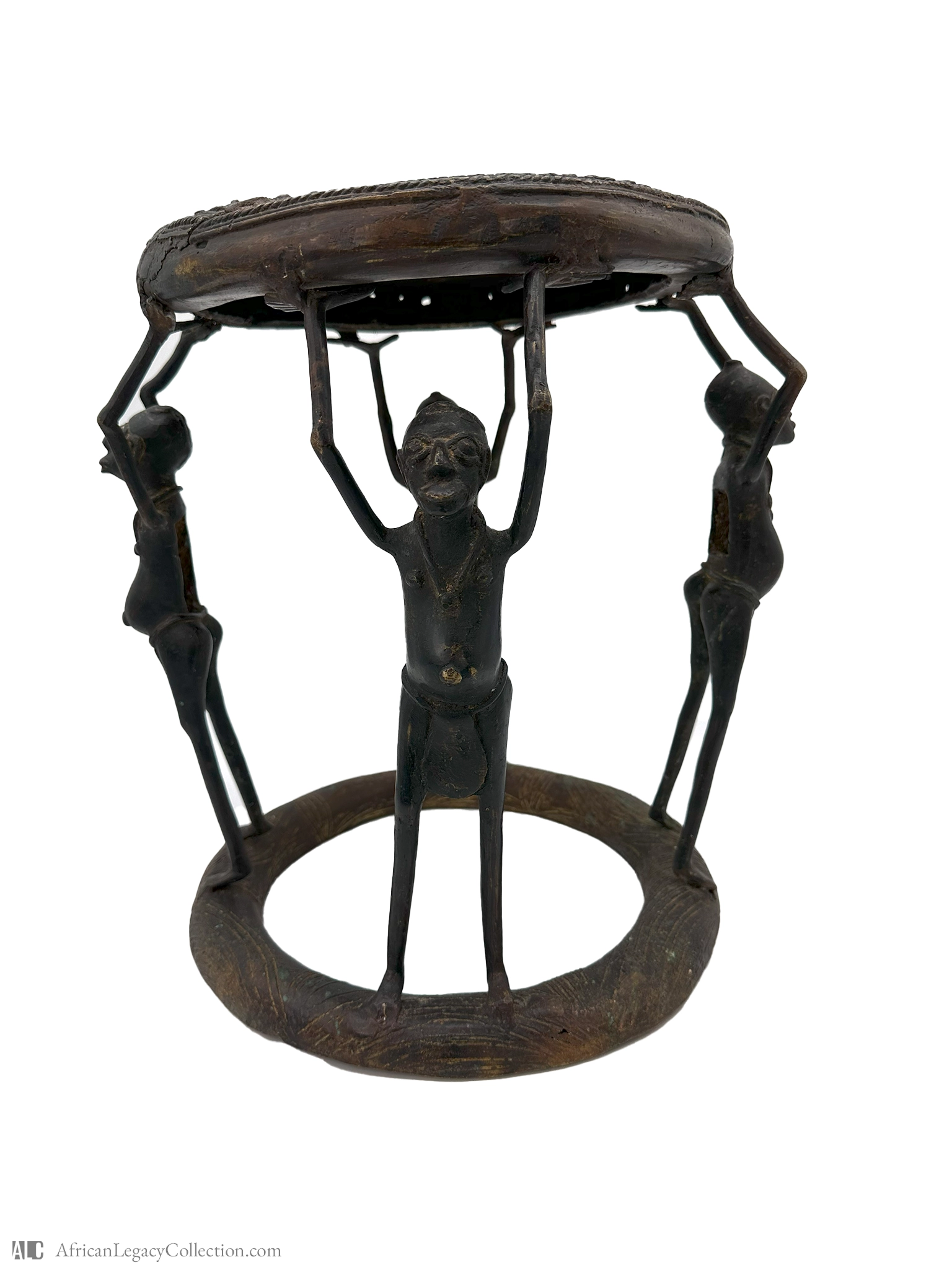 This artifact, likely a ceremonial stool, originates from West Africa and serves a significant cultural role in ritual settings. The anthropomorphic figures supporting the seat suggest a symbolic function, possibly representing ancestral spirits or communal support.