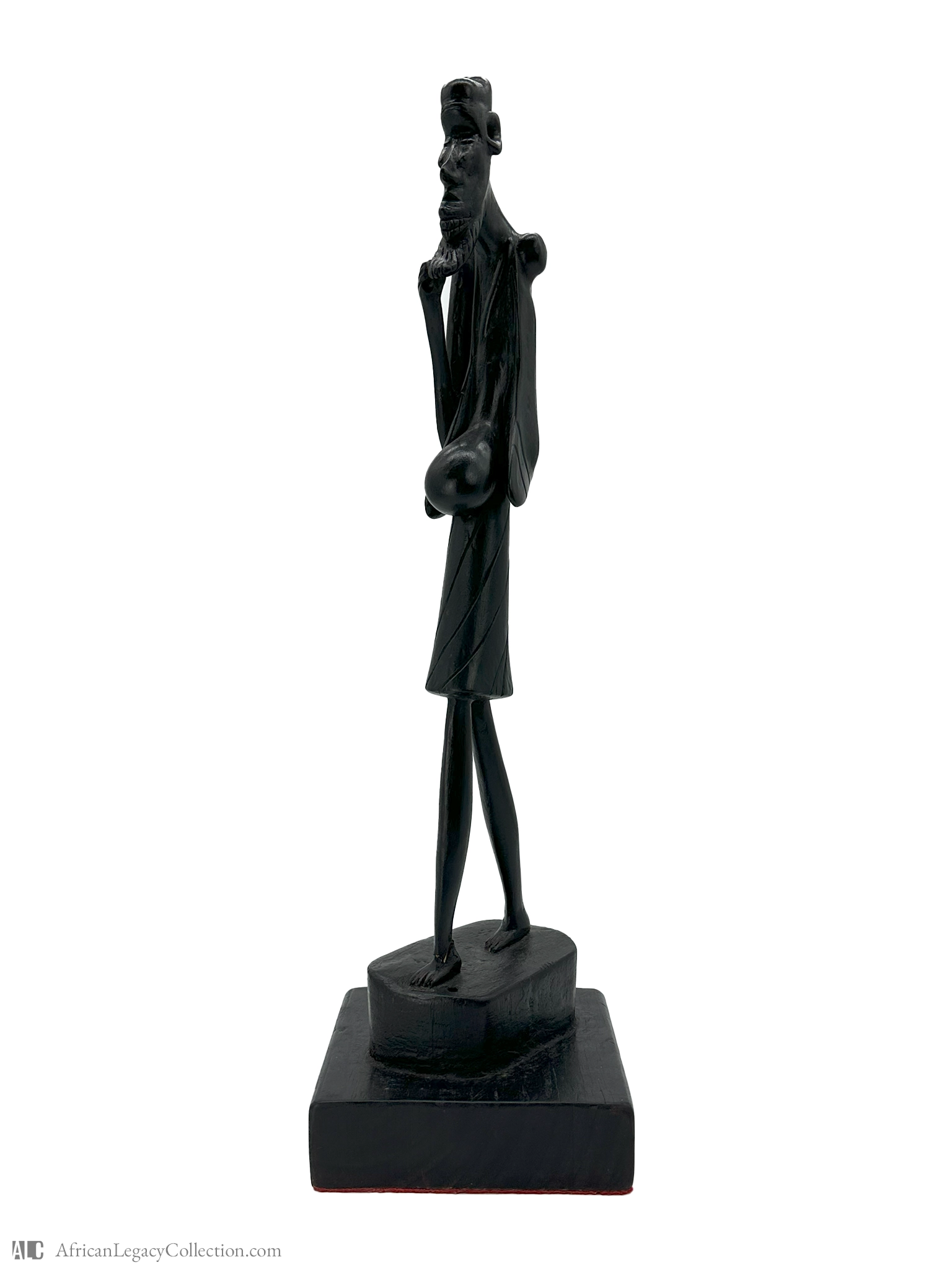 The sculpture is crafted from wood, a typical medium in African art known for its versatility and cultural richness. This piece likely reflects mid-20th century artistry, when there was a focus on elongated forms and expressive features. Its significance lies in showcasing the skill and creativity prevalent in traditional East African communities.
