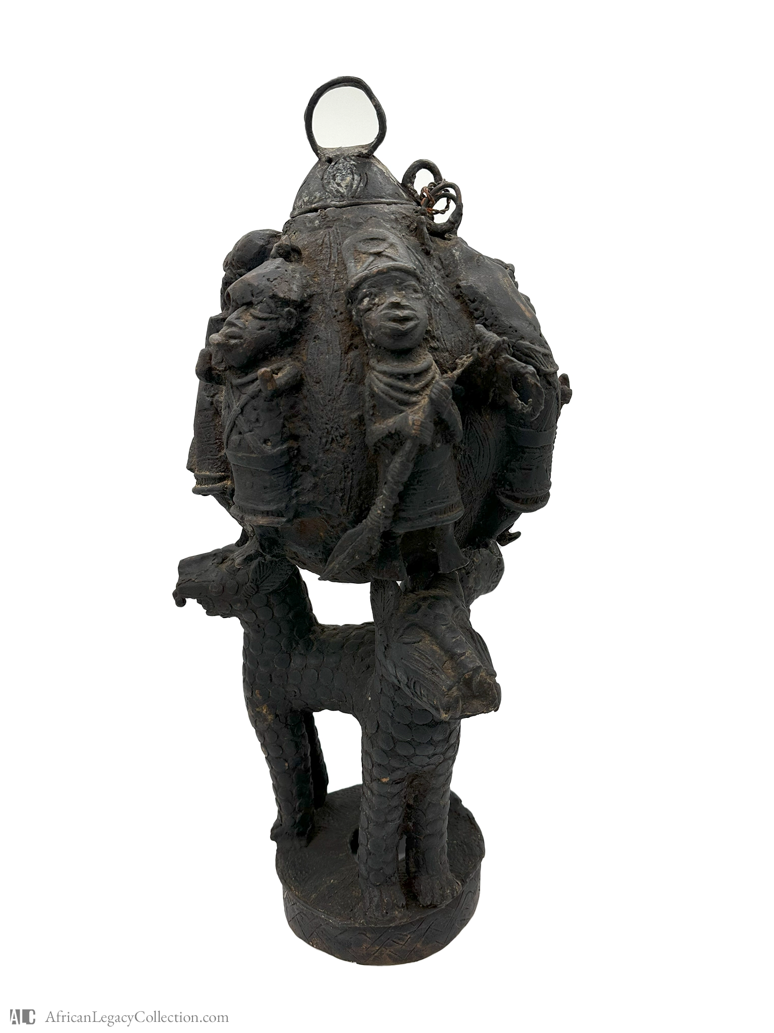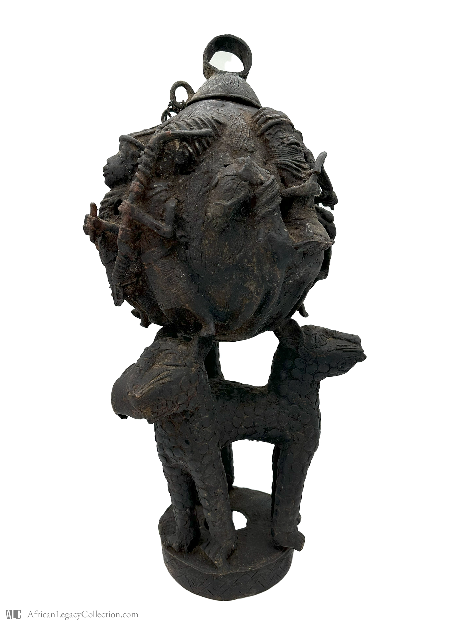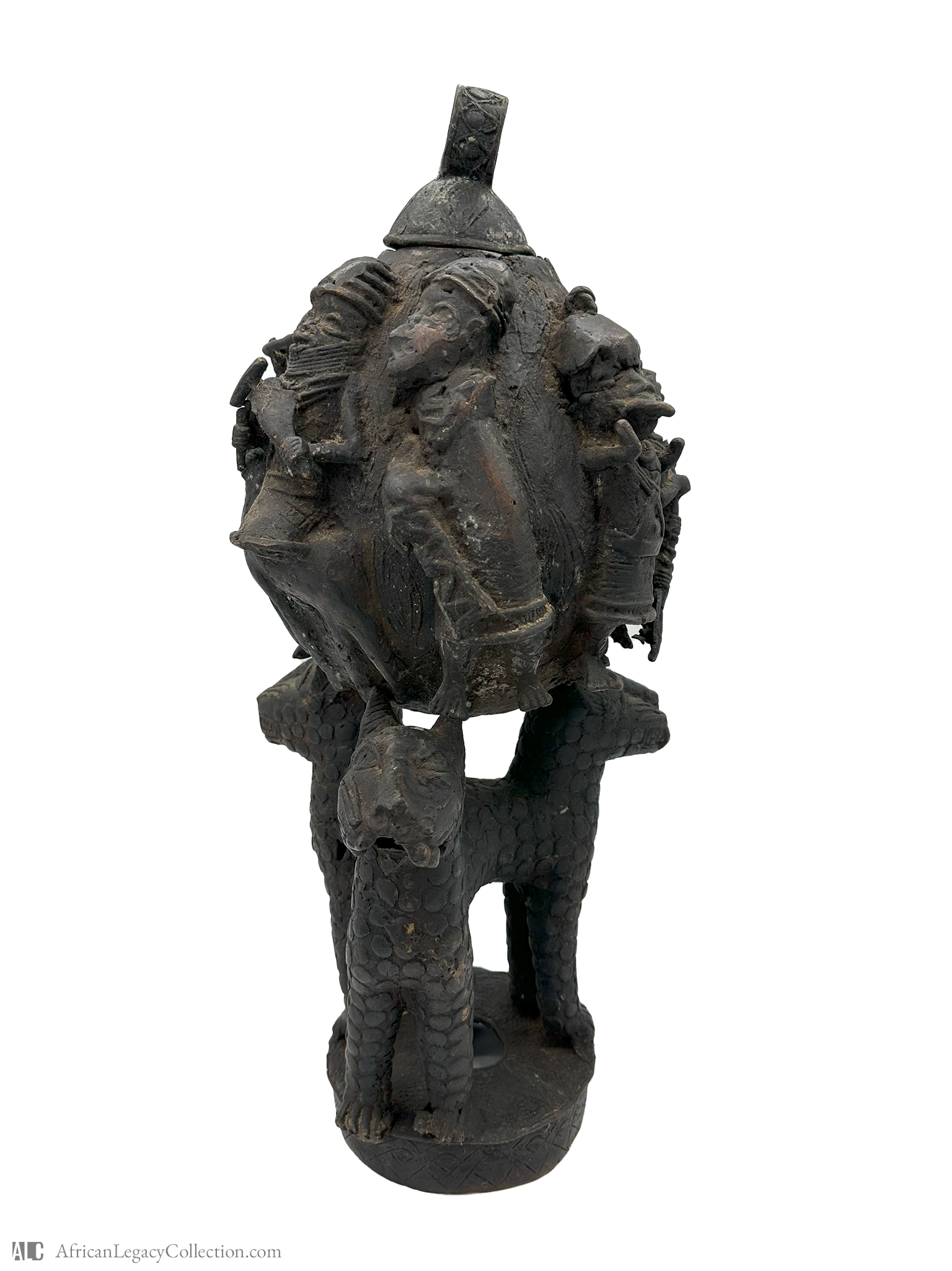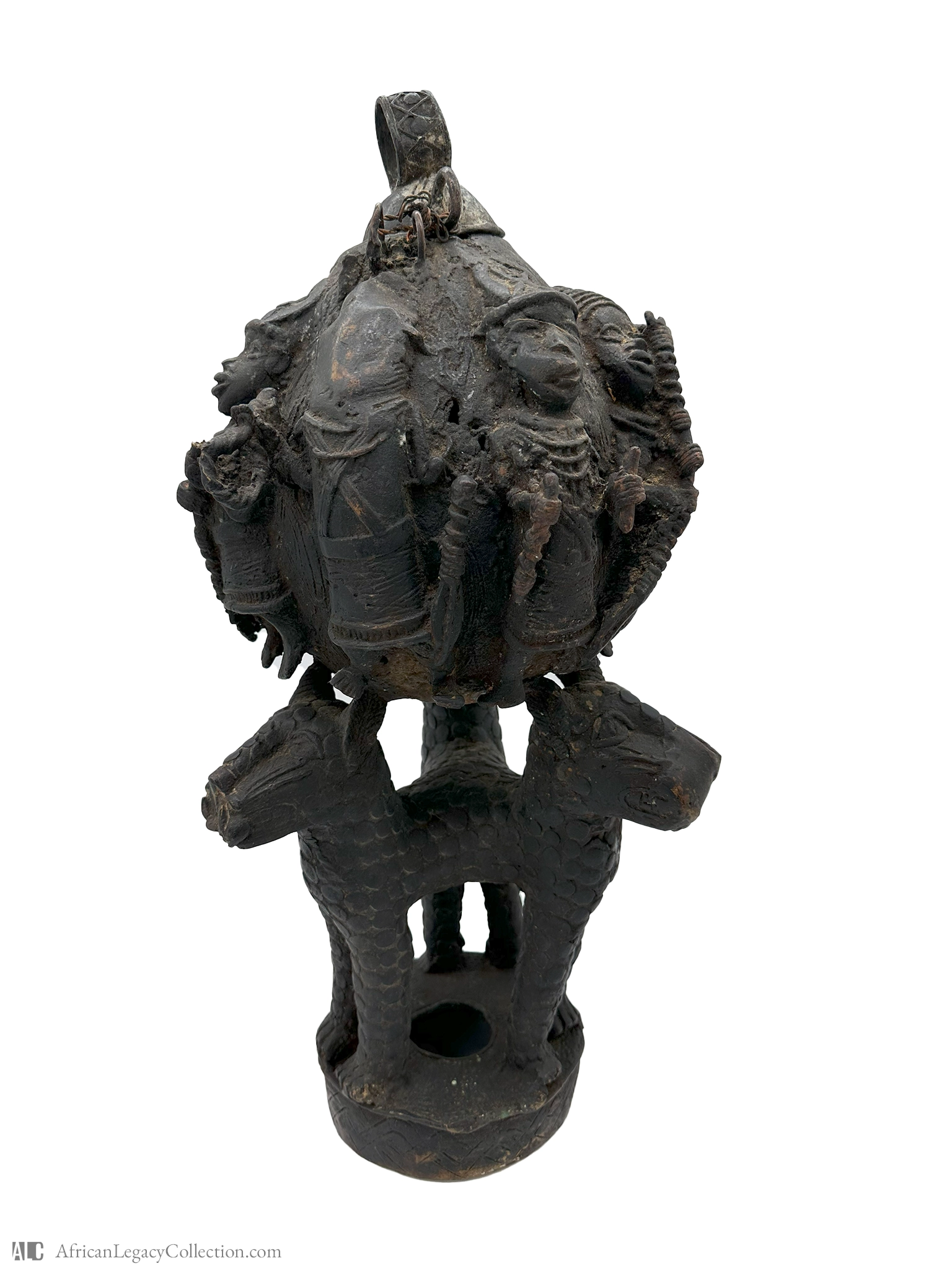 This ceremonial artifact likely originates from West Africa and serves both a decorative and symbolic purpose. Its intricate design features anthropomorphic figures, which are commonly used in African art to convey cultural stories and traditions.