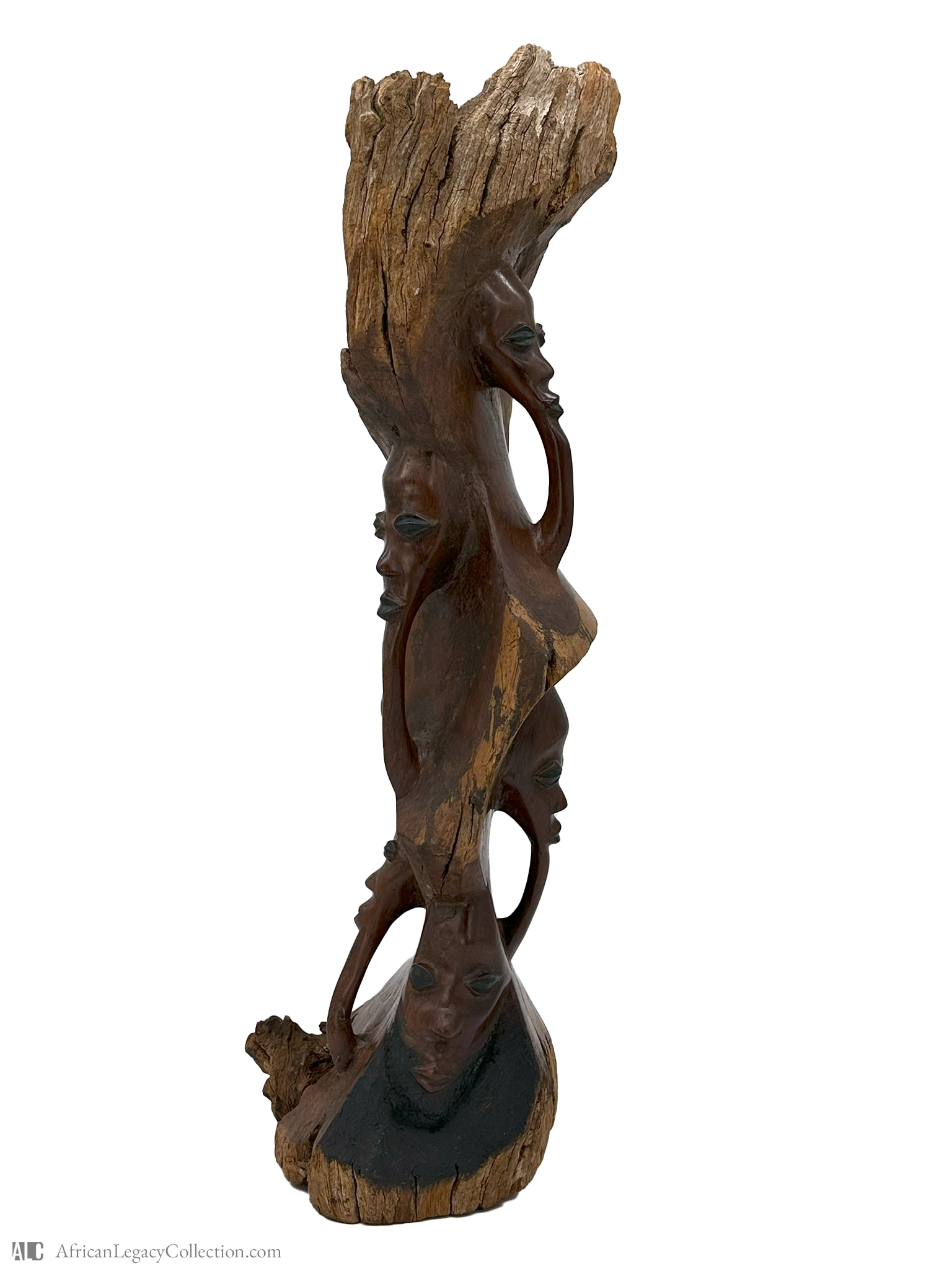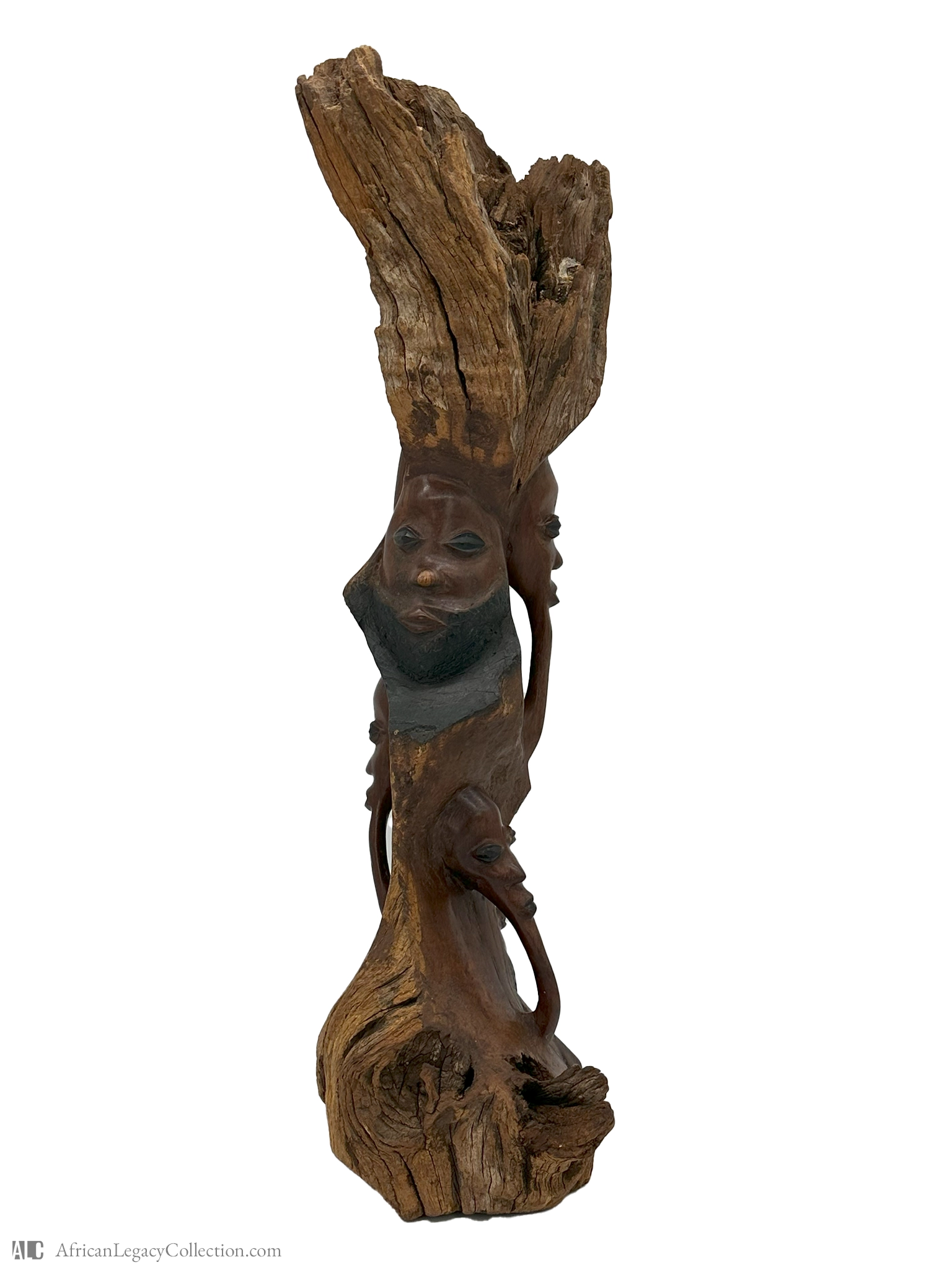 This sculpture likely originates from West Africa and serves a decorative or ritualistic purpose. The multiple carved faces suggest it represents ancestral or spiritual figures, a common theme in African art that reflects community values and traditions.