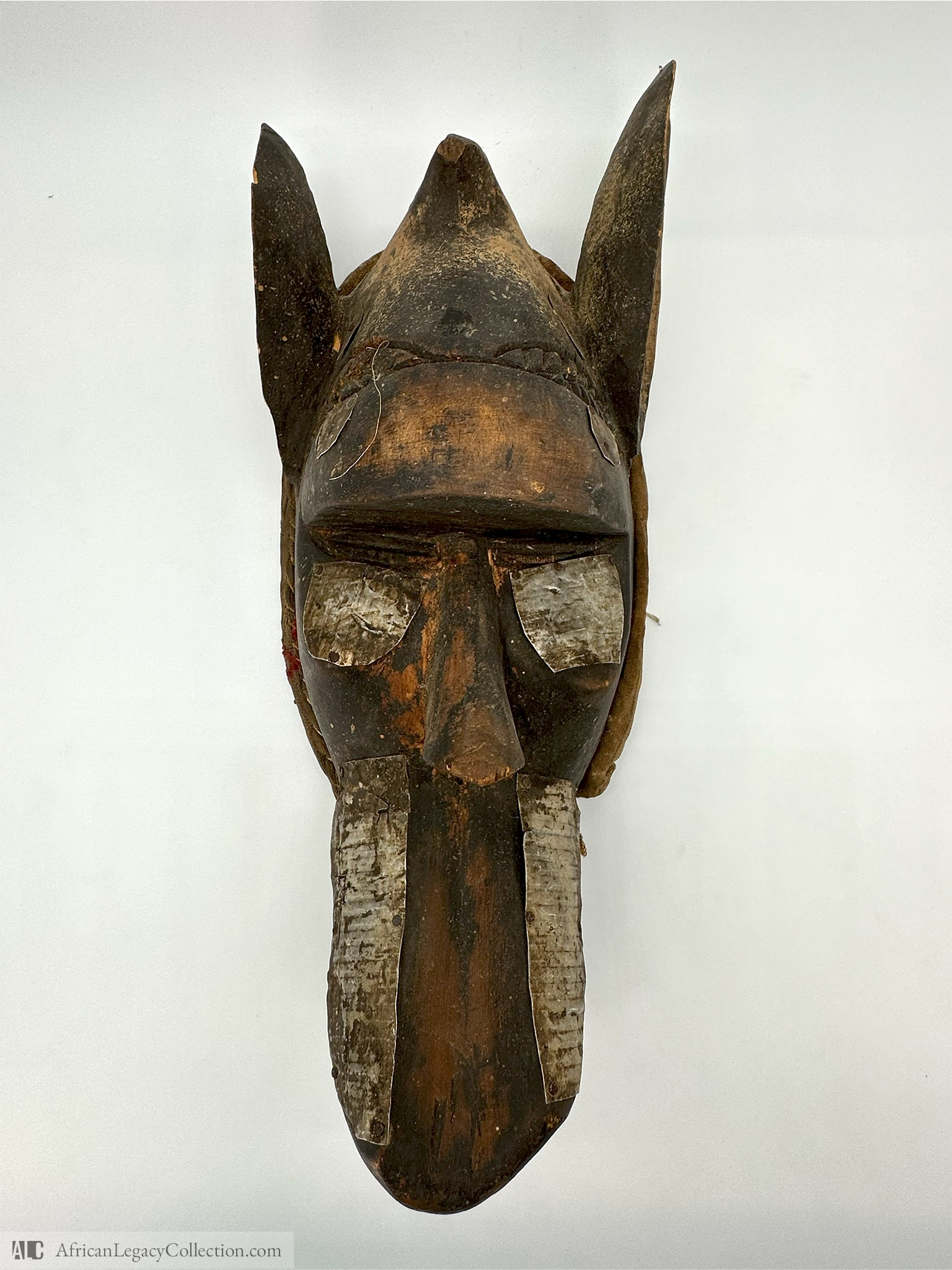 This mask, likely originating from the West African region, is characterized by its elongated features and anthropomorphic stylization. It may have been used in ritualistic ceremonies, symbolizing spiritual entities or ancestors. Such masks often play a central role in various cultural rites, including initiation and funerals, serving as a bridge between the physical and spiritual worlds.