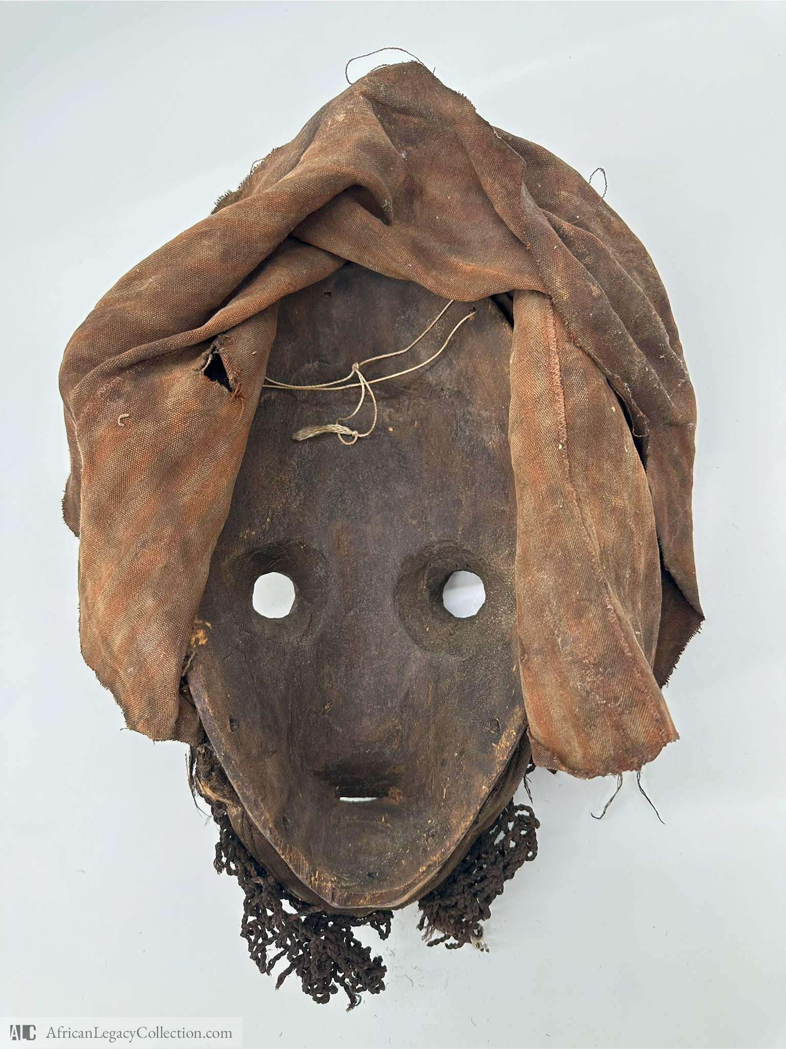 Crafted primarily from wood and adorned with natural fibers and cowrie shells, this mask reflects traditional materials and techniques. The use of patina stratigraphy on the wood indicates its age and historical use in rituals. This artifact highlights the cultural significance of ancestral veneration within West African societies.