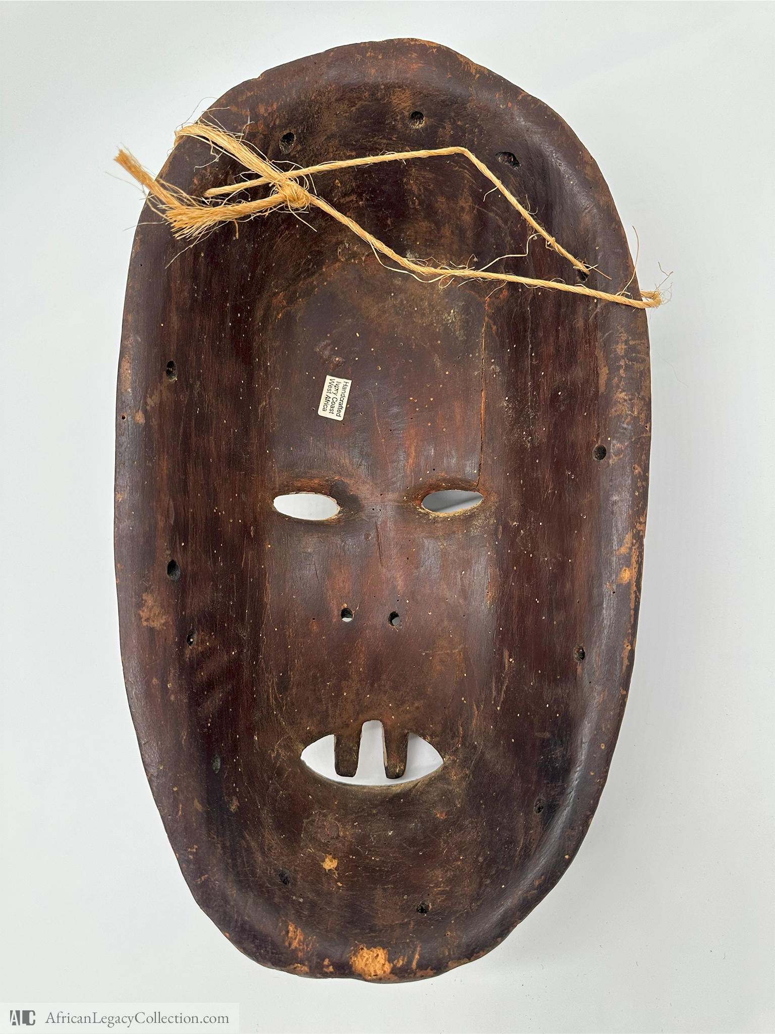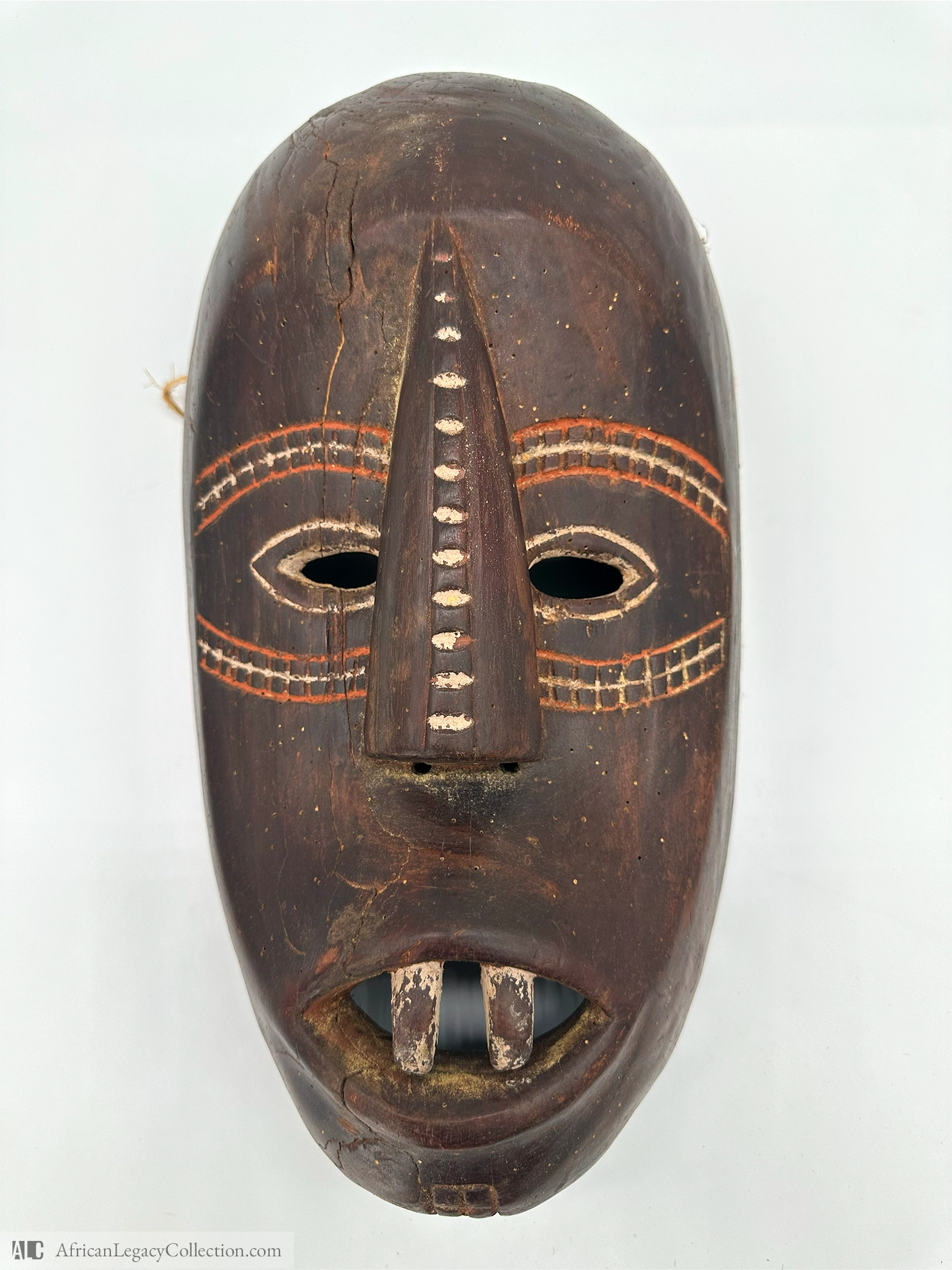 This African mask likely originates from Central Africa and serves a ritualistic purpose. Its design suggests it was used in ceremonies or dances to embody spiritual or ancestral forces.