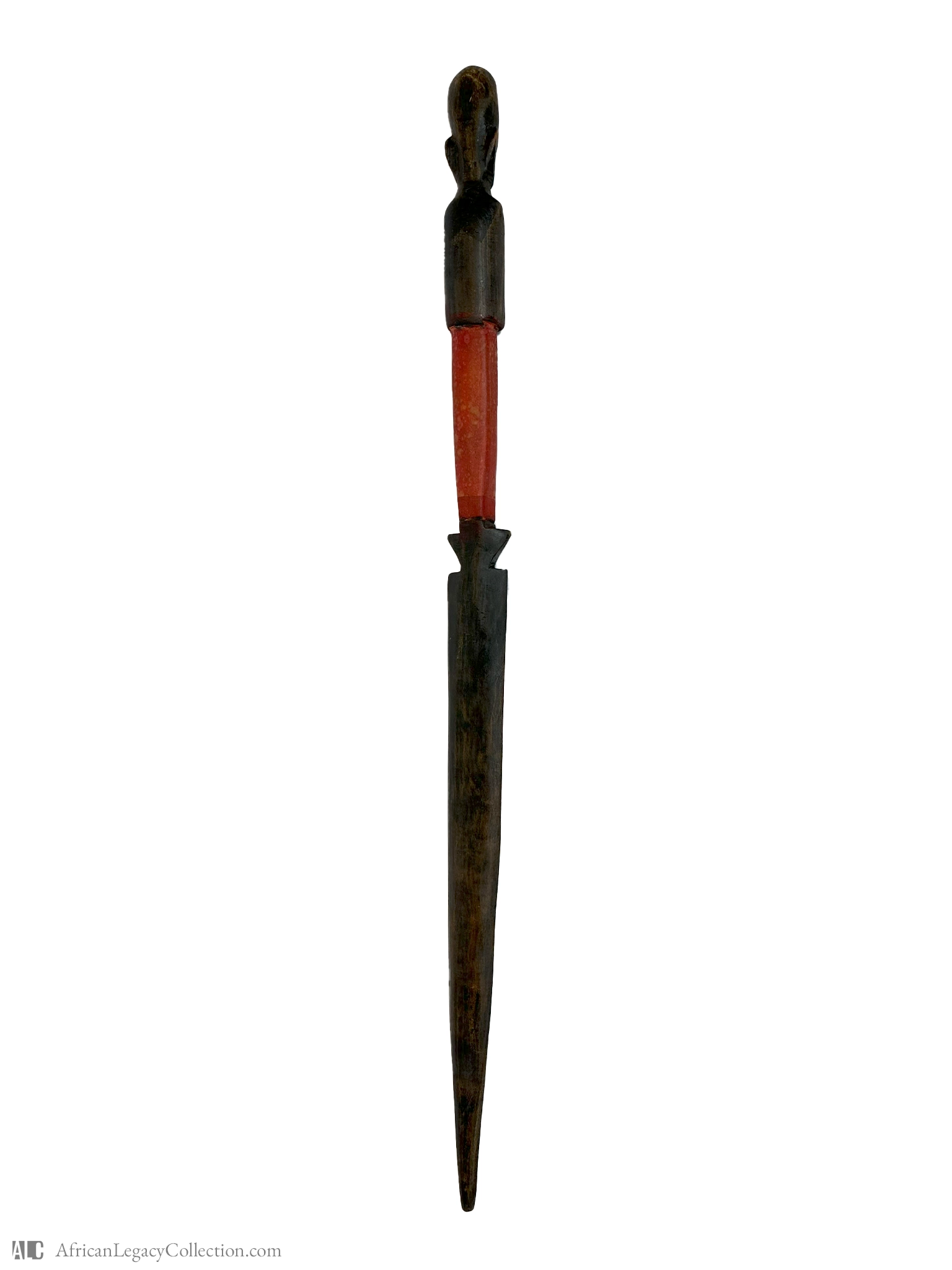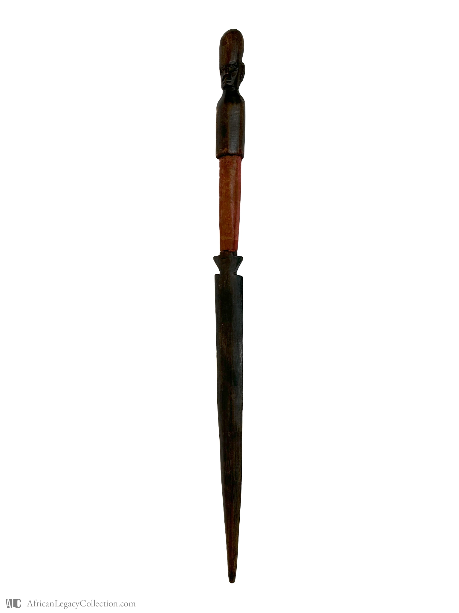 This artifact is a carved staff, likely used as a symbolic or ceremonial object. It is possibly of Central African origin, serving a role in the cultural practices or hierarchy of its people. The staff’s anthropomorphic stylization suggests it may represent a figure of authority or spiritual significance.