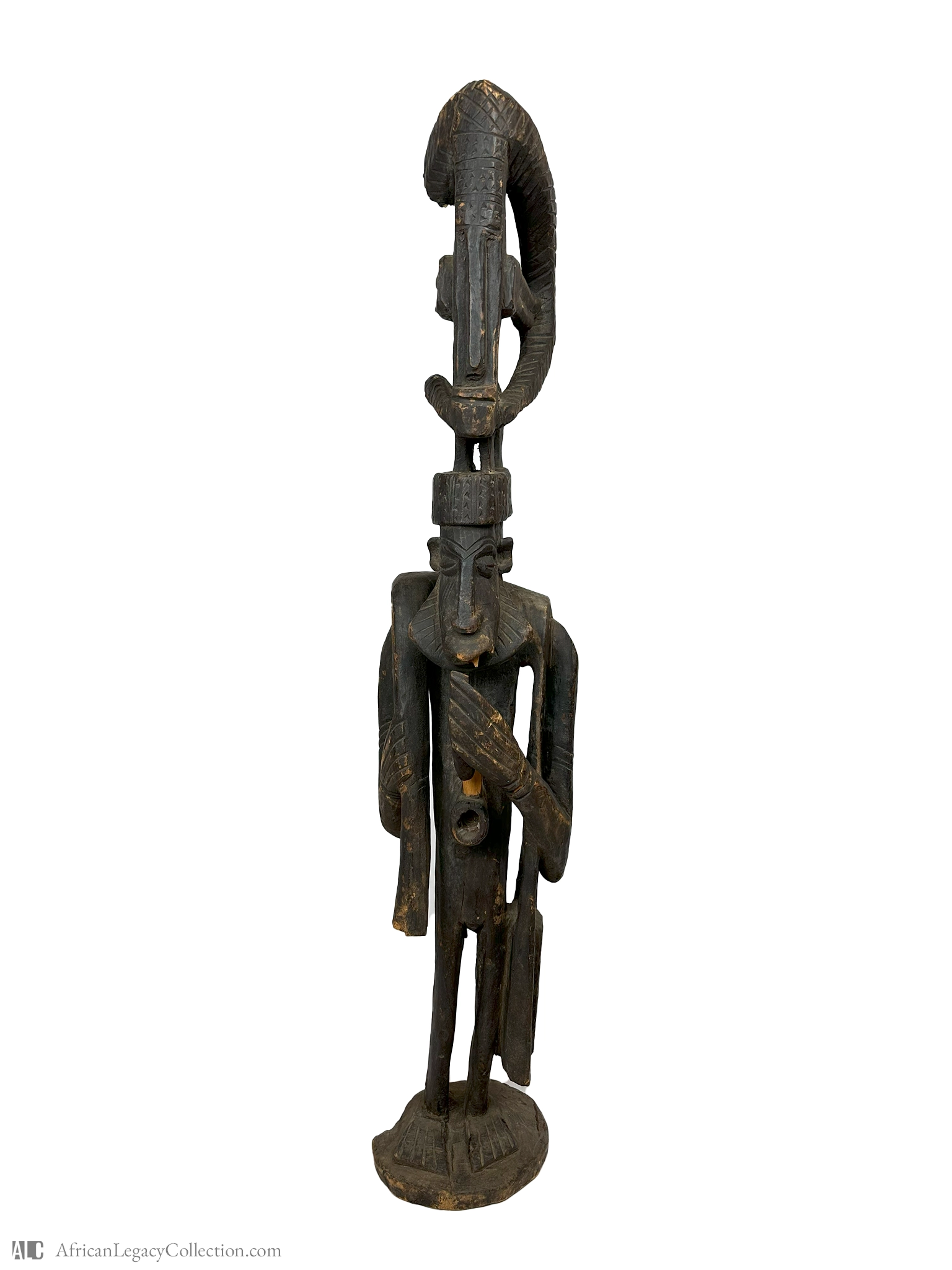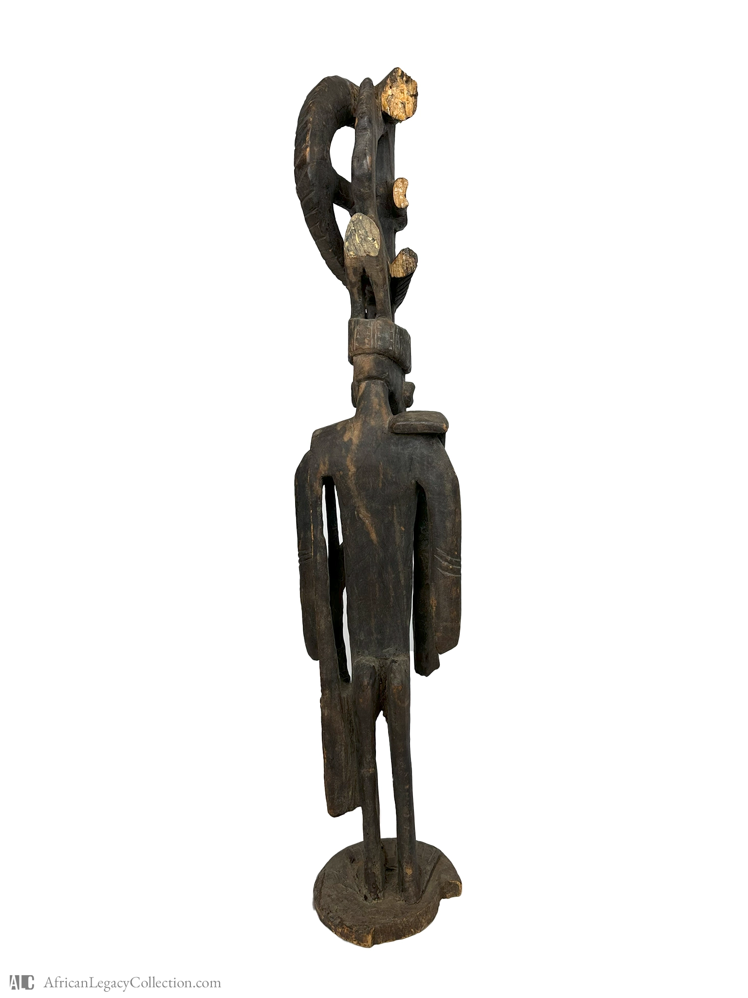 This carved wooden figure is likely a representation of an ancestral spirit, traditionally used by cultures in West Africa for ceremonial purposes. Its anthropomorphic features suggest it may have served a ritualistic role, perhaps as a guardian or a symbol of protection for communities.
