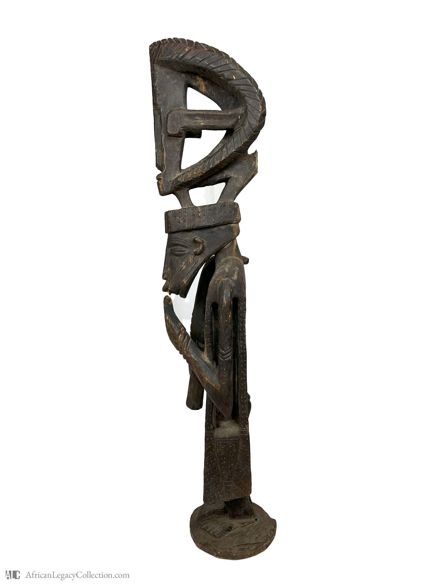 The figure is crafted from wood using detailed carving techniques, evident in the intricate incised striations and scarification motifs. These features are characteristic of art from the region, offering insight into the cultural significance and artistic traditions of the period.