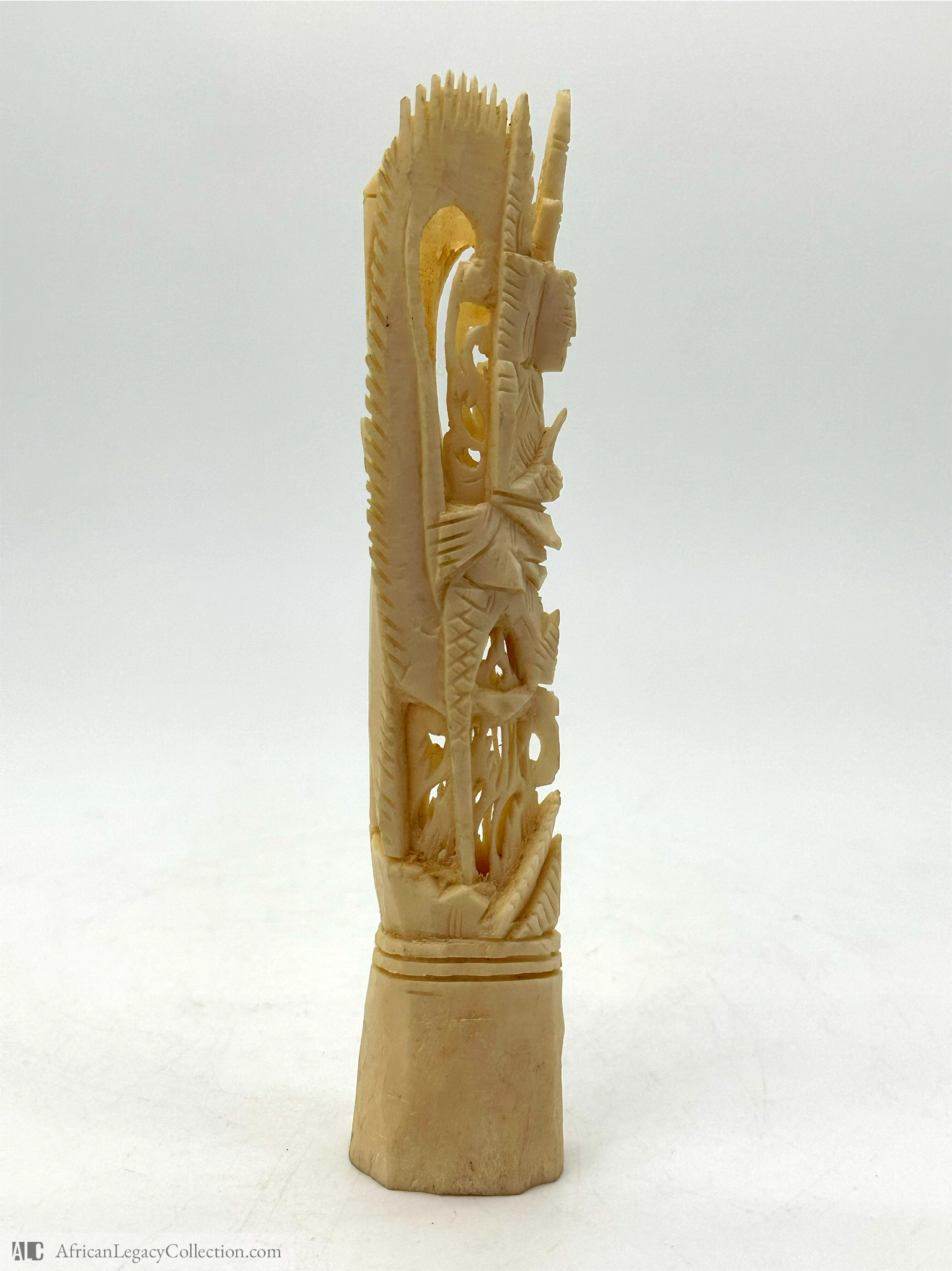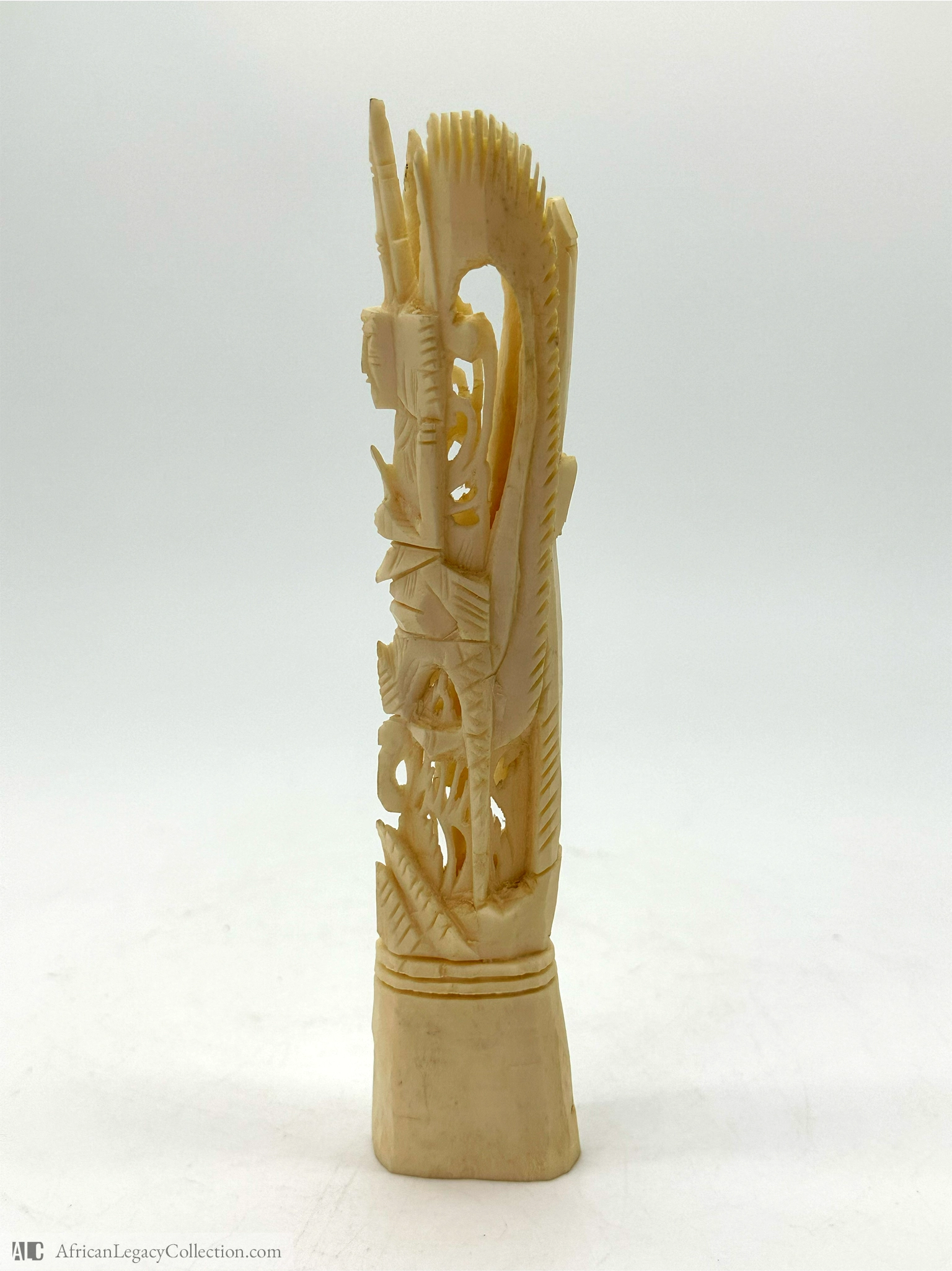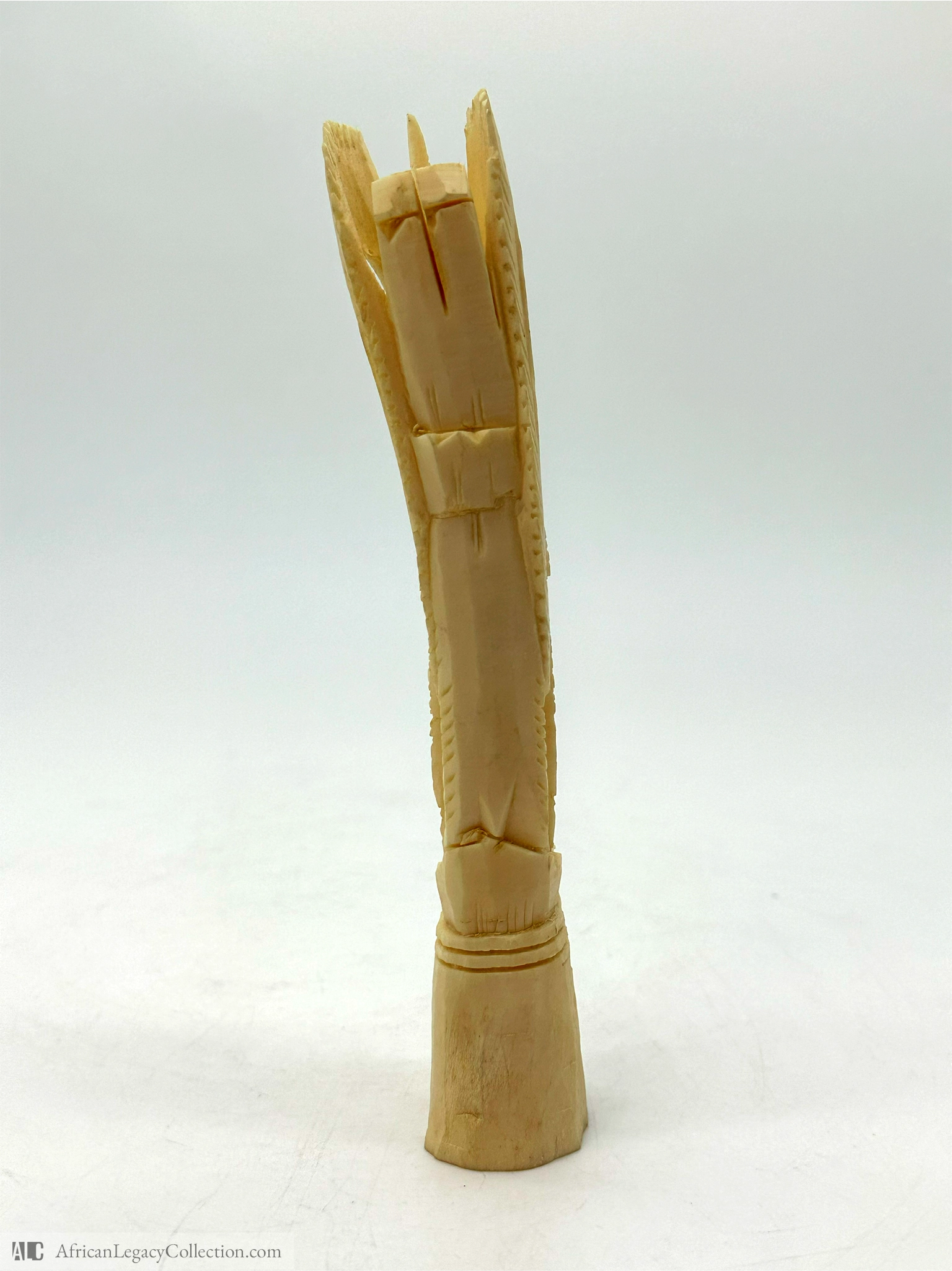 The piece is crafted from ivory, utilizing skilled techniques such as incised striations and intricate detailing. Historically, ivory carving has held significant cultural and economic importance in many African communities, symbolizing status and artistry. This object showcases the traditional craftsmanship and aesthetic values passed down through generations.