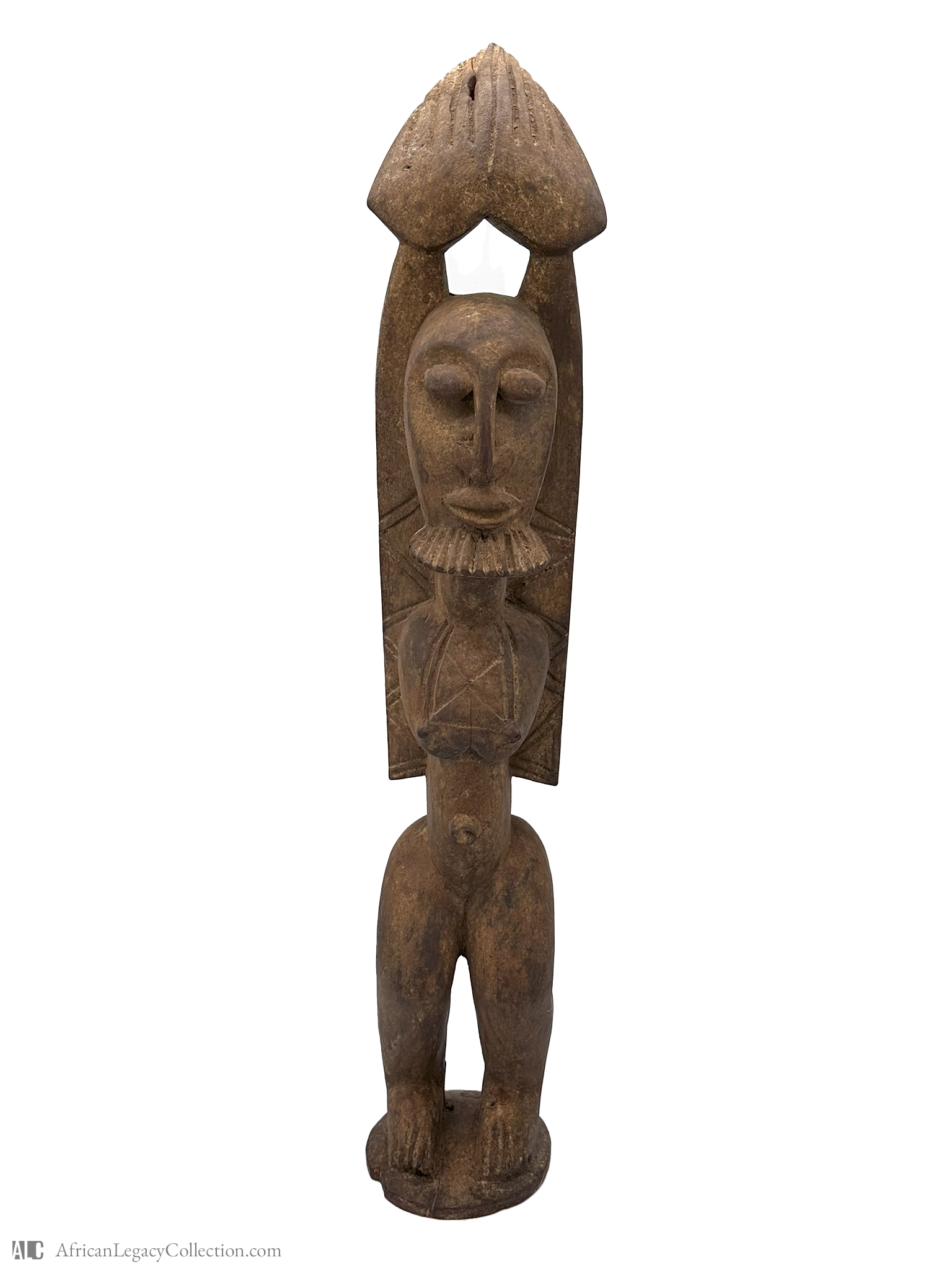 The artifact depicted is likely a traditional ancestral figure, originating from the cultural regions of West Africa. Such figures are typically used in ritualistic ceremonies, playing a vital role in connecting the living with ancestral spirits. This piece’s posture and facial features suggest its purpose is to embody spiritual presence.