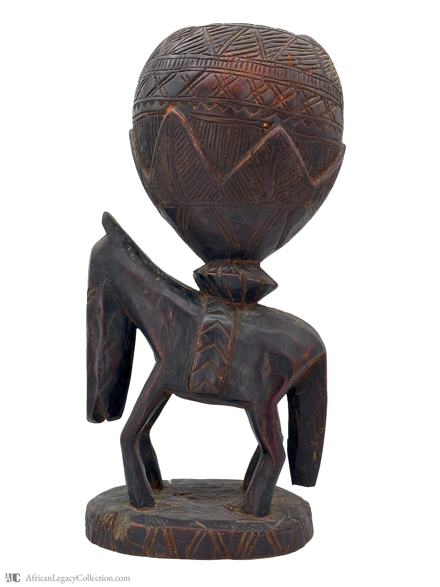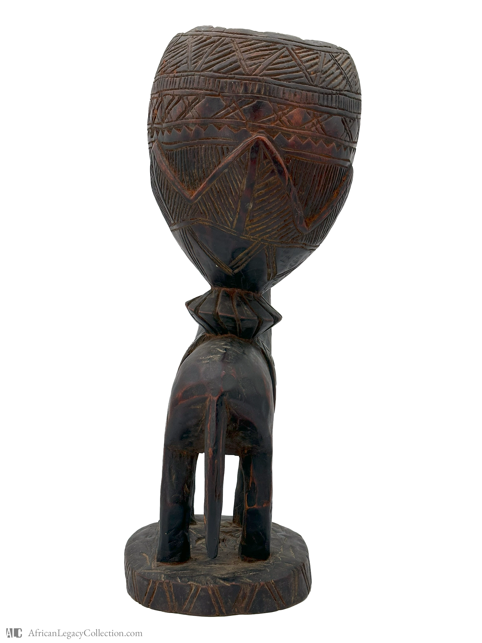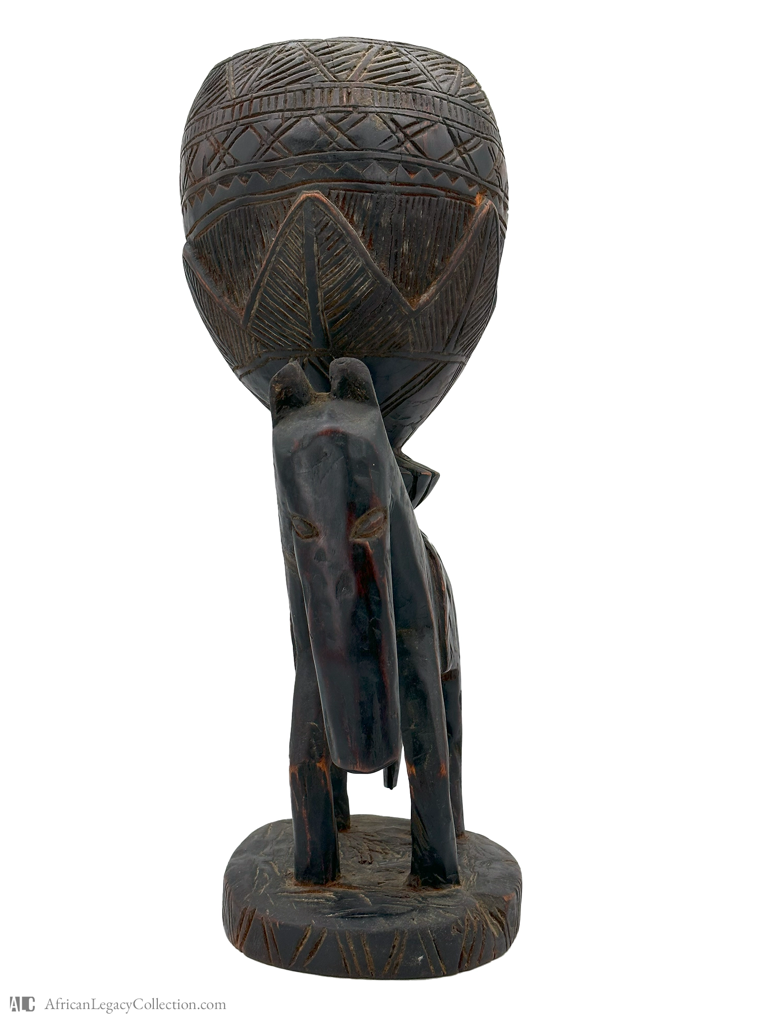 This carved wooden artifact likely originates from West Africa and represents a traditional vessel or ceremonial object. The anthropomorphic and zoomorphic elements suggest it was used for ritualistic or ceremonial purposes within the community, possibly serving as a container for offerings or a symbolic representation of wealth and status.