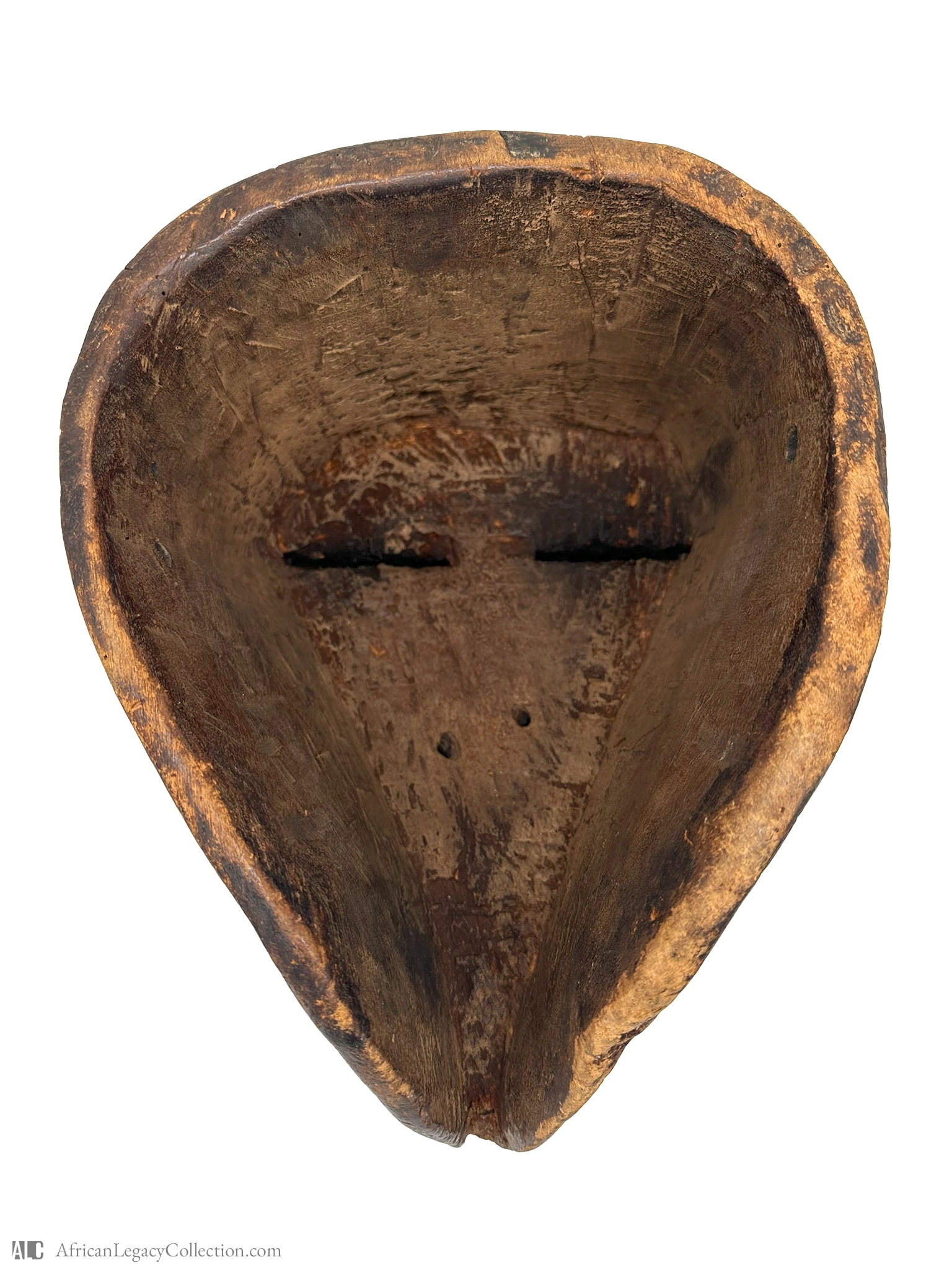 Crafted from wood, this mask displays clear incised striations and scarification motifs indicative of its cultural significance. Such artifacts typically originate from the late 19th to early 20th century and highlight the mastery of African artisanship in wood carving techniques, serving as vital cultural expressions and chronicles of sociocultural practices.