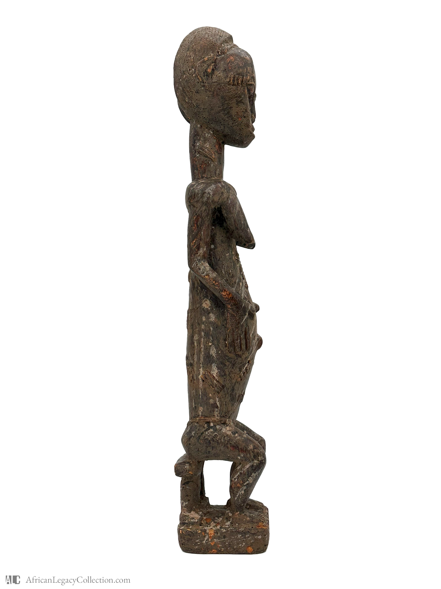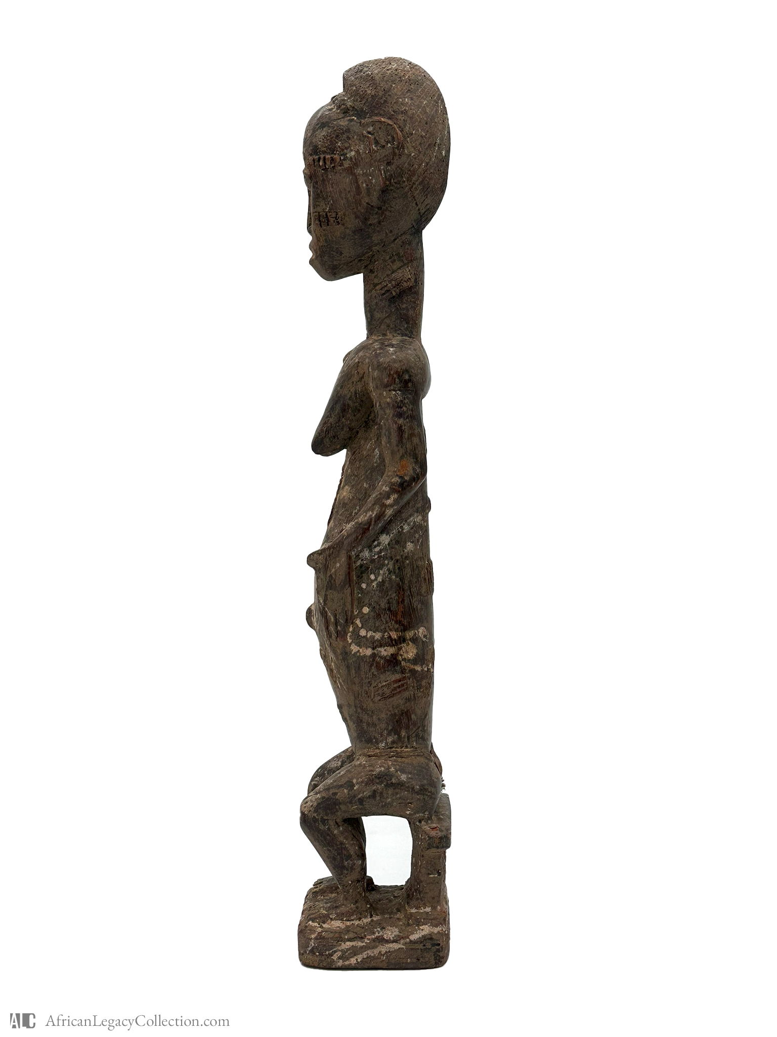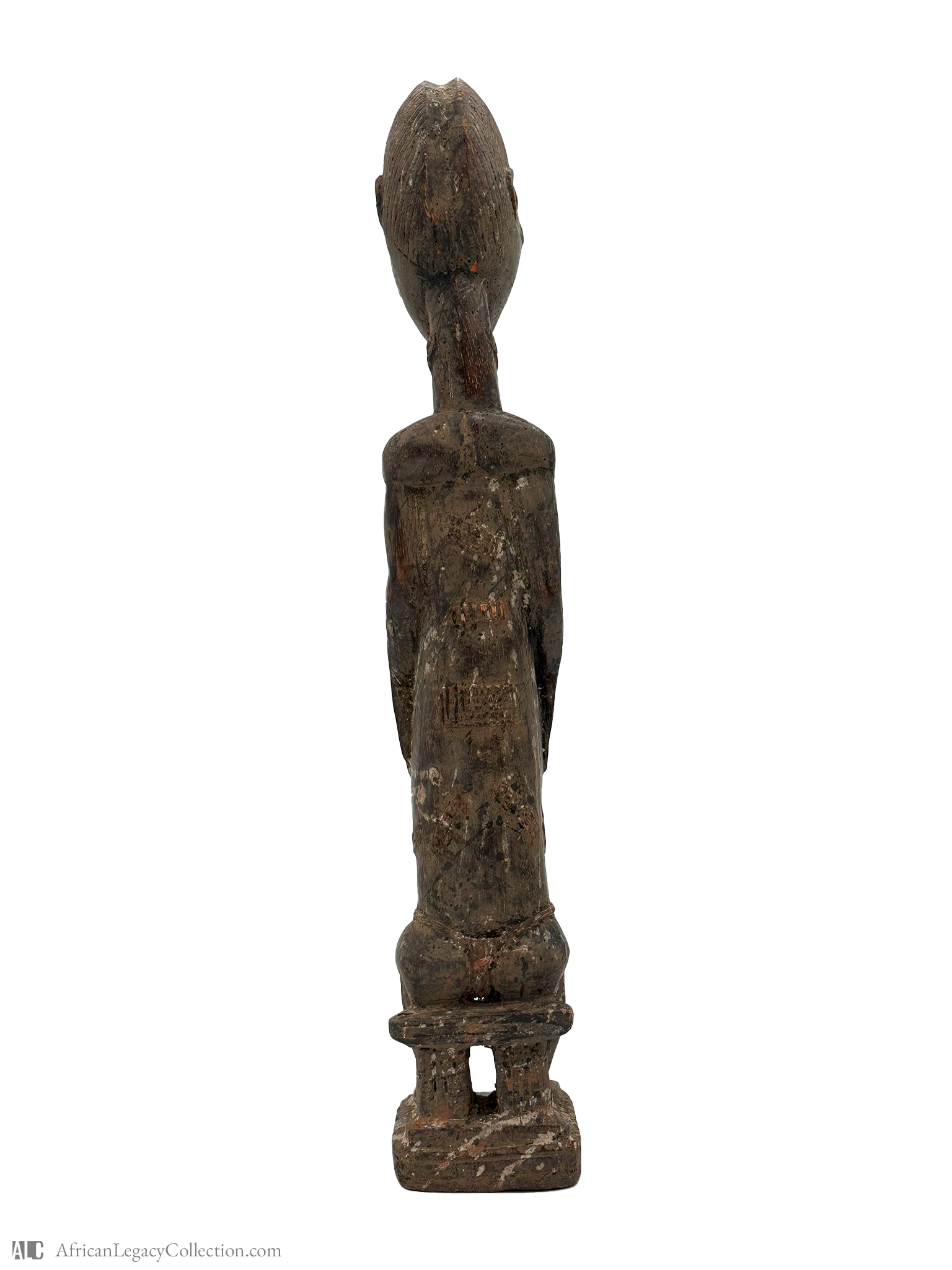 This wooden figure likely originates from West Africa and is an example of a cultural artifact used to represent ancestral or spiritual connections. The figure’s design indicates it may have served in rituals or as a protective talisman.