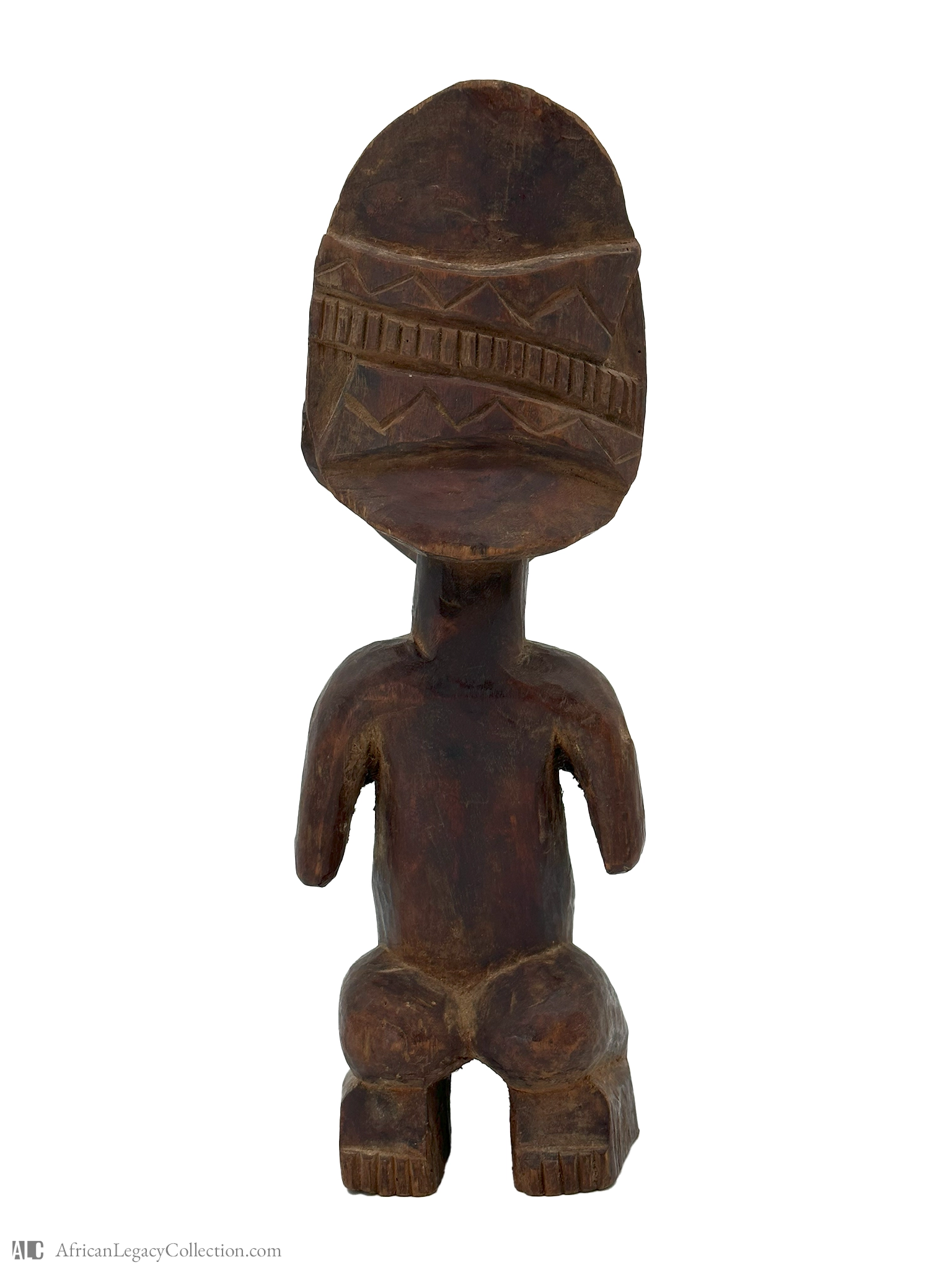 This wooden figure likely originates from West Africa and represents a depiction of a female figure, possibly used in fertility rituals or as a protective emblem within the community. The anthropomorphic stylization and scarification motifs suggest its cultural significance and ceremonial purpose.