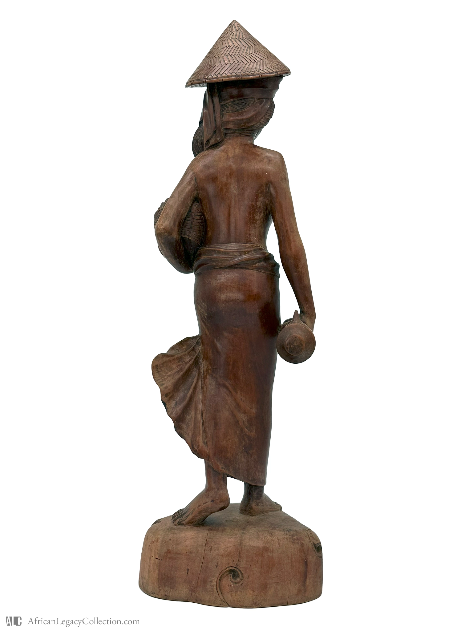 This wooden sculpture likely originates from Southeast Asia and depicts a female figure, possibly representing a cultural or daily life scene. The figure is crafted with a serene expression and modest attire, indicating its purpose as a decorative or cultural artifact, reflecting everyday life or traditional roles.