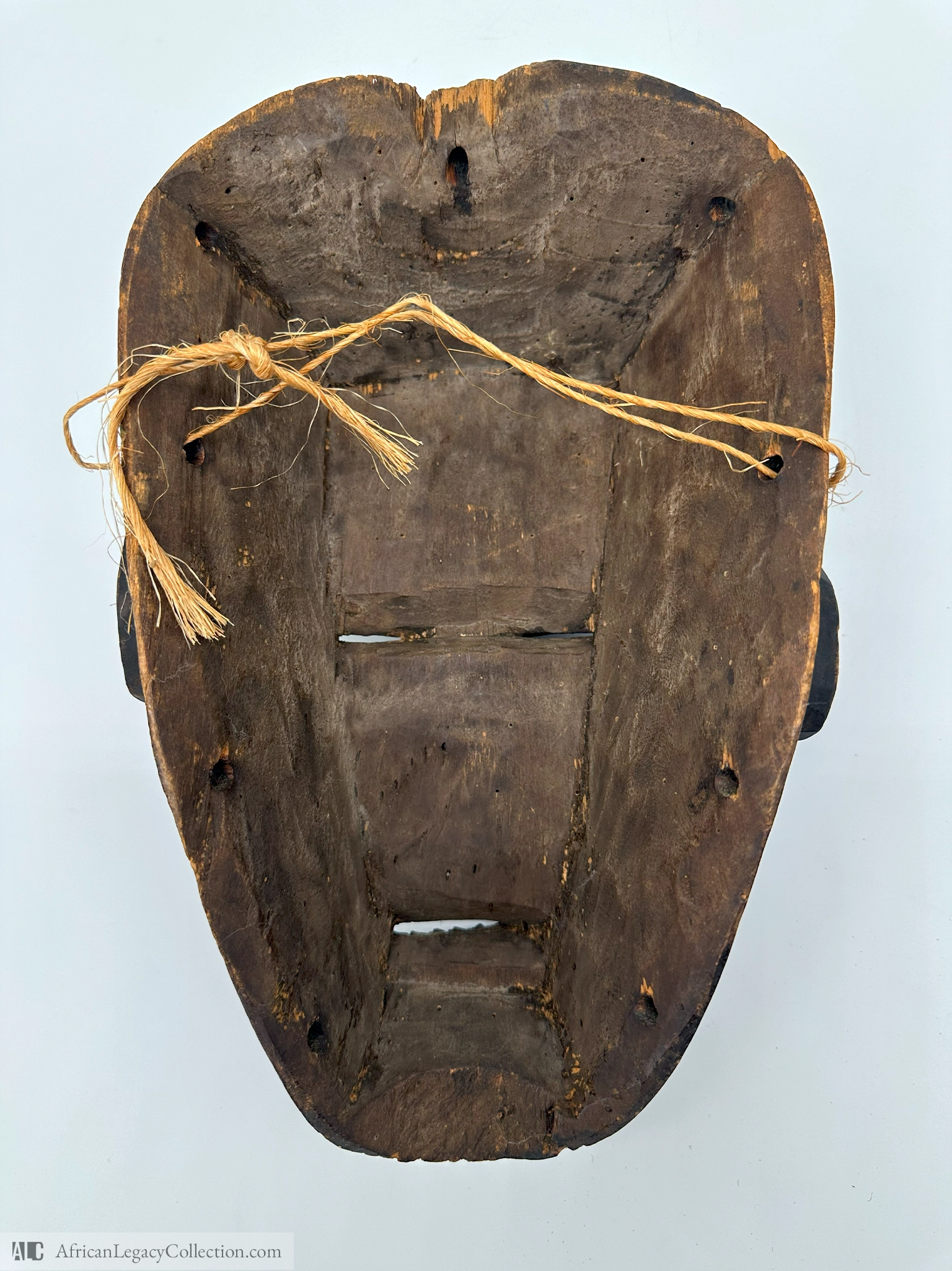 This ceremonial mask, likely originating from West Africa, was traditionally used in ritualistic practices and cultural ceremonies. Its distinct carving style and motifs suggest it served a significant role in spiritual or communal gatherings.