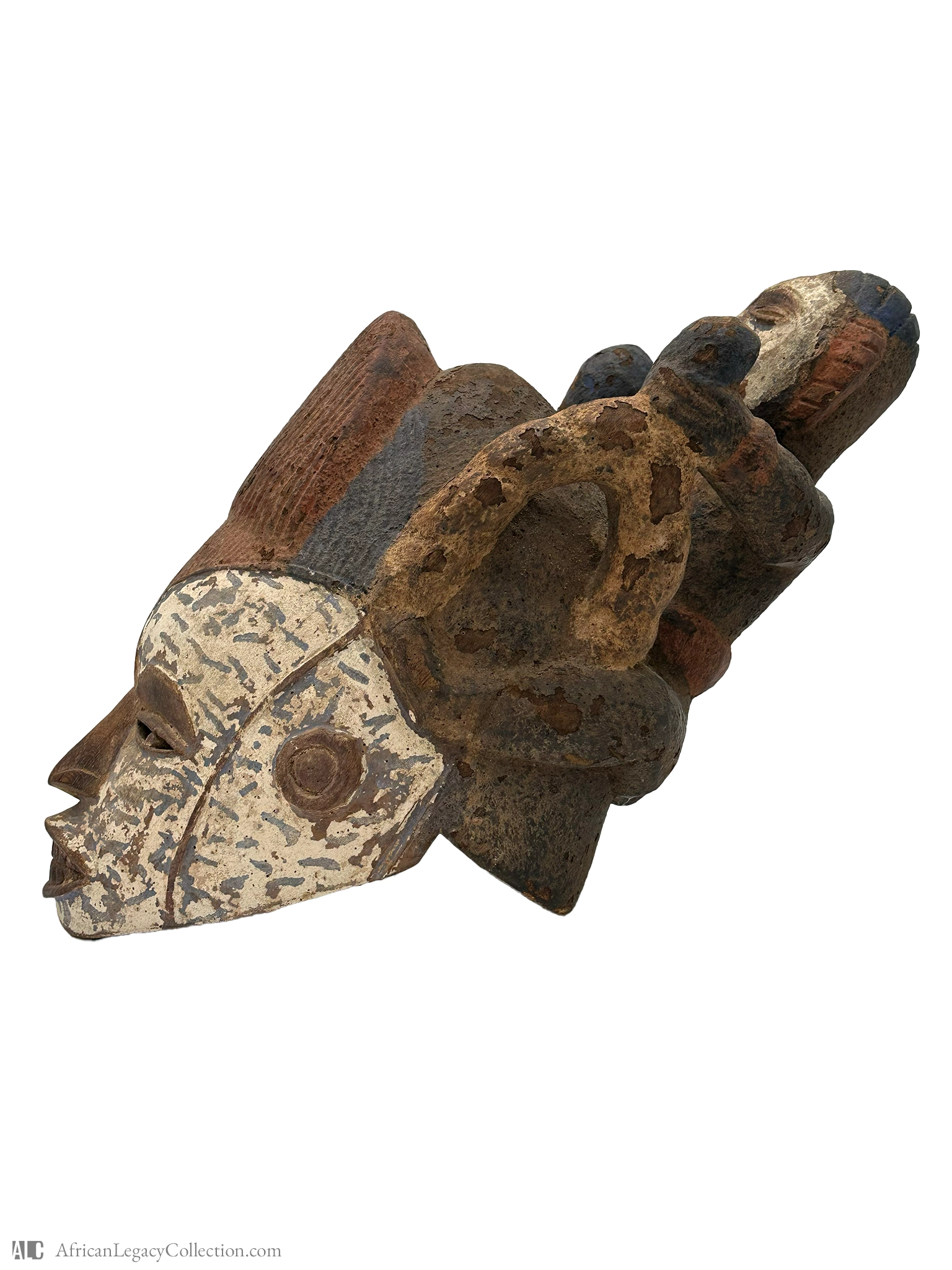 The mask is primarily crafted from wood, a common medium for African masks, with colored pigments applied for artistic and symbolic expression. The use of pigment indicates a cultural emphasis on the visual impact during performances. Masks like this hold historical significance, reflecting the rich cultural traditions and spiritual beliefs of the people who created them.