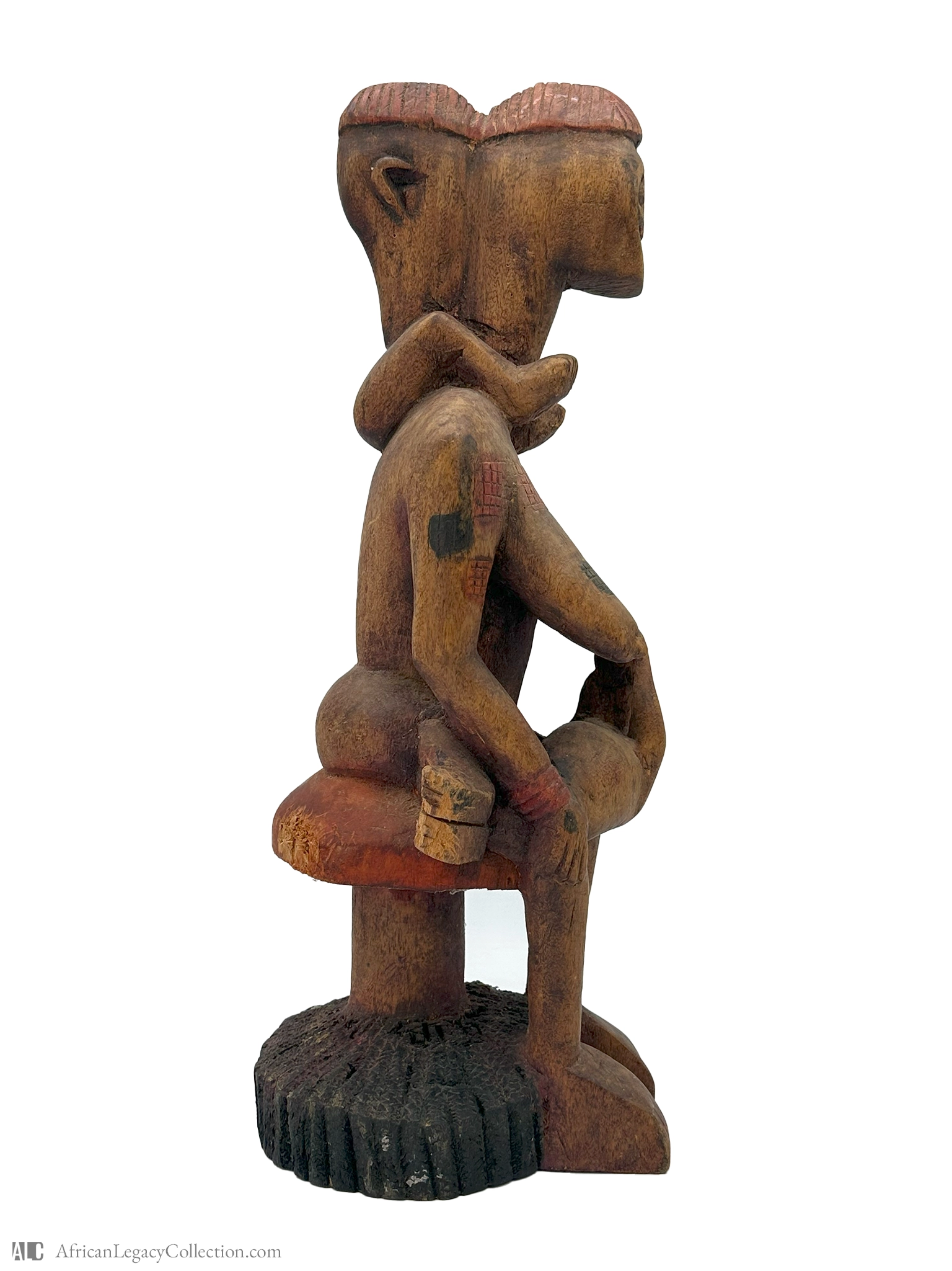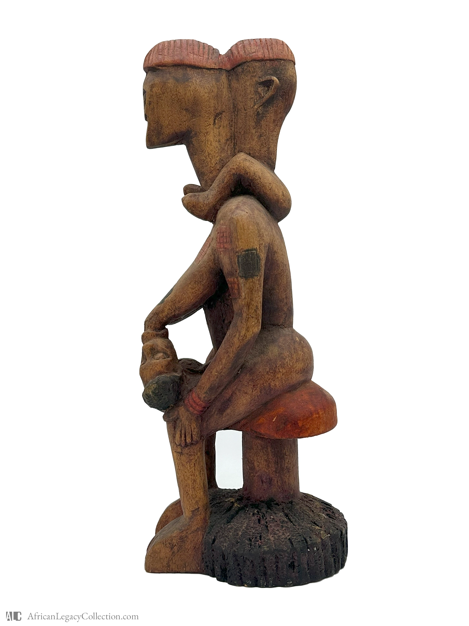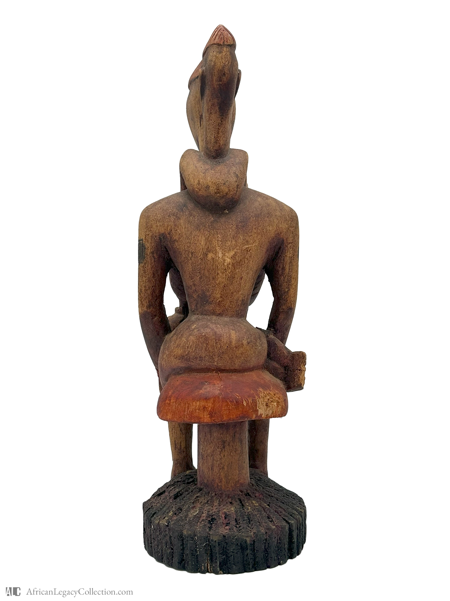 This wooden figure, likely from West Africa, depicts a seated human form showcasing prominent scarification motifs. Such figures are often used in cultural rituals or as symbols of ancestral reverence. The figure’s posture and adornment suggest a role in conveying spiritual or community narratives.