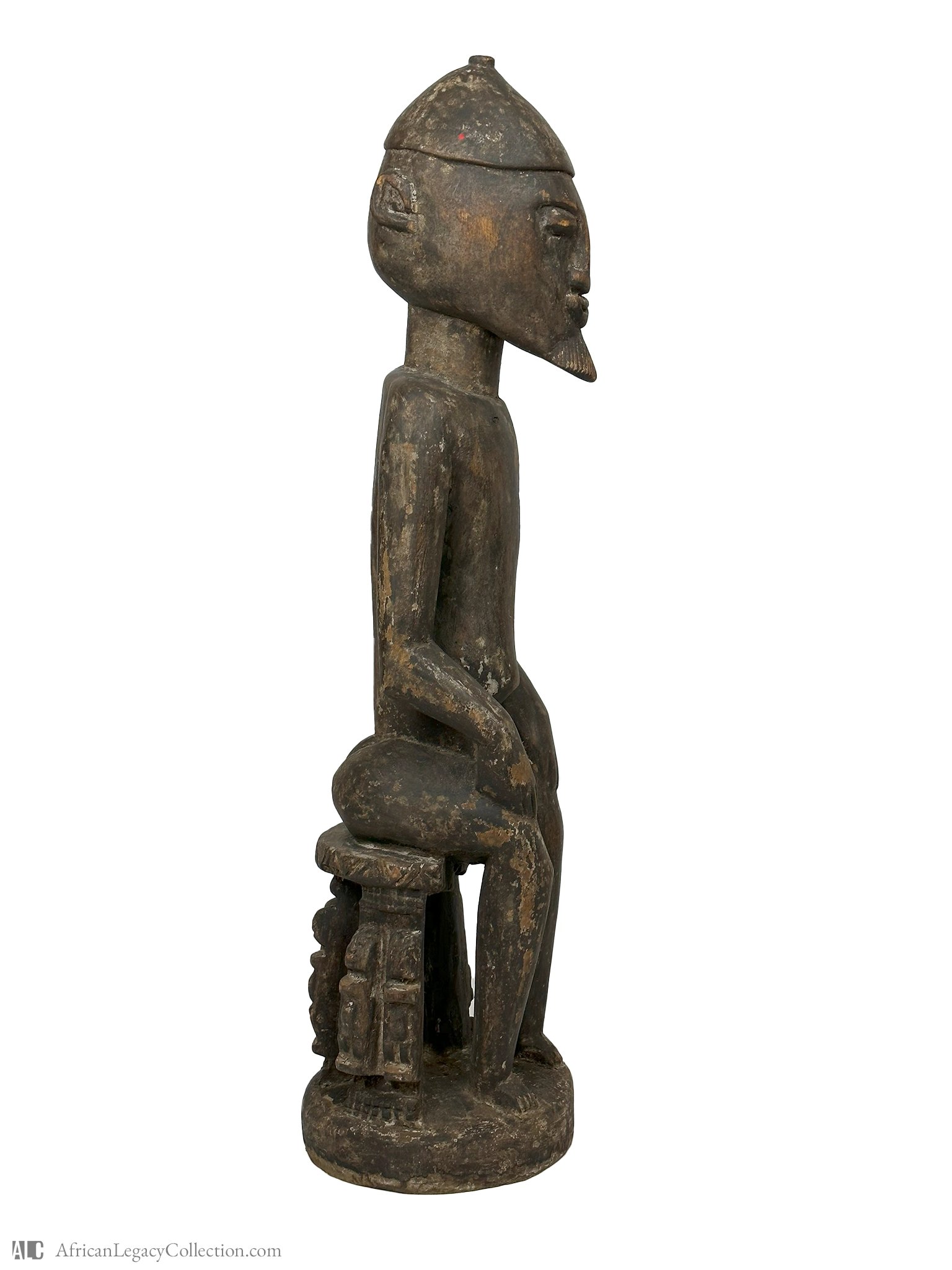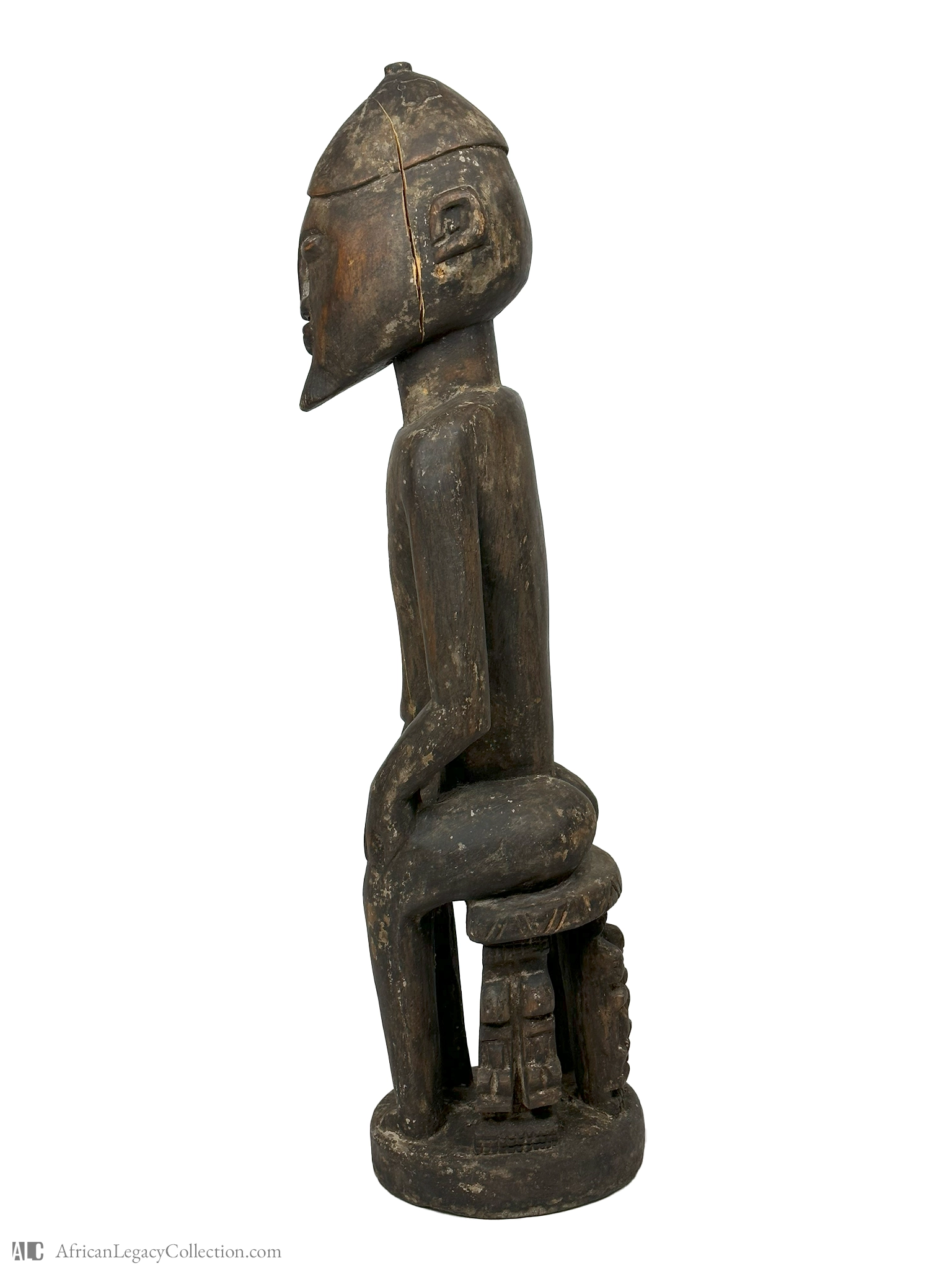 This wooden statue represents a seated figure, likely serving a ceremonial purpose within a community. The form suggests its place of origin is likely West Africa, with features indicative of anthropomorphic stylization. Such objects are often created to embody spiritual beings or ancestors, playing a role in rituals or as symbols of protection.