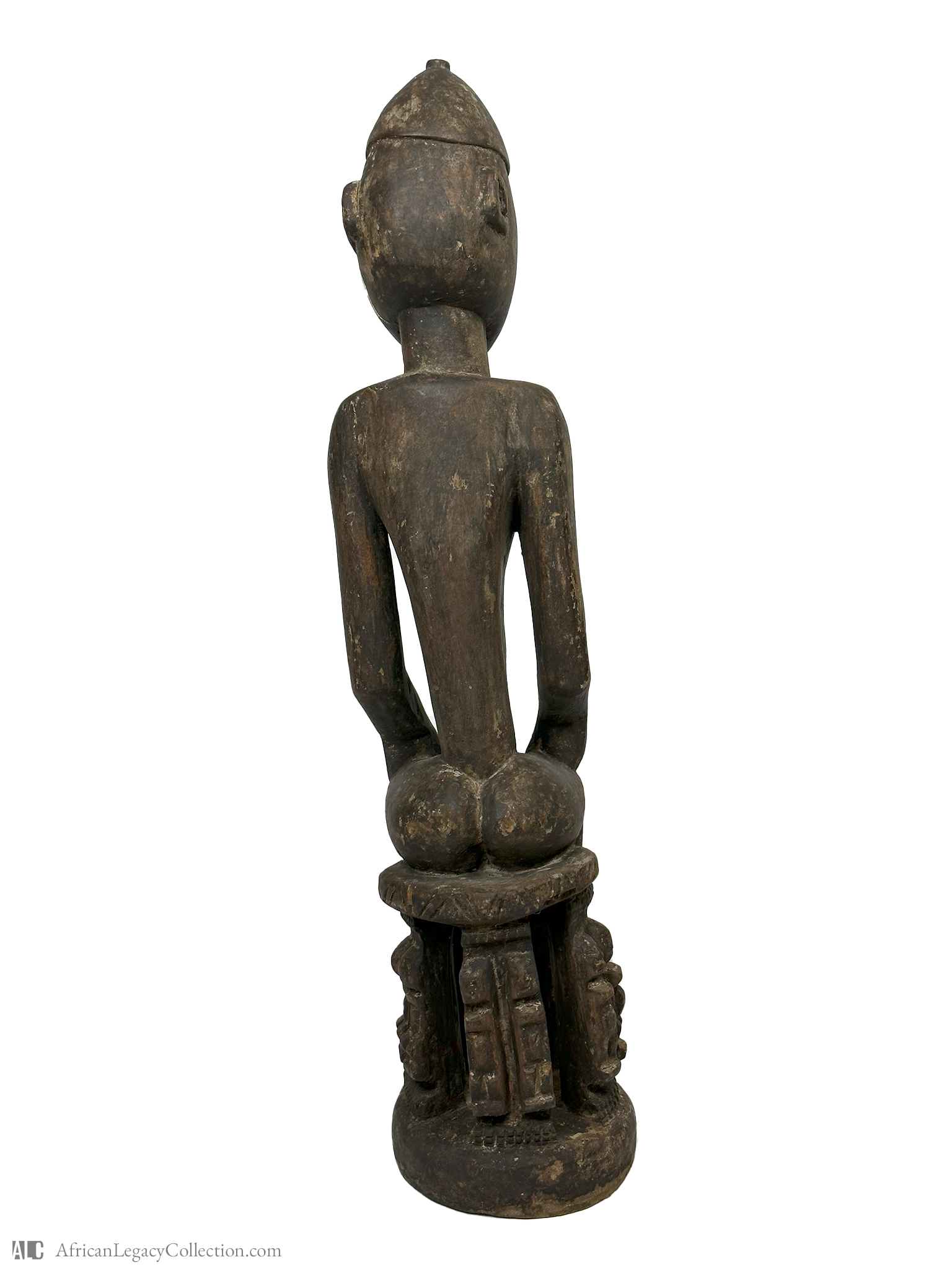 Carved from a single piece of wood, the statue showcases traditional craftsmanship that may include techniques like incised striations and scarification motifs. The patina suggests an older age, possibly linked to tribal or communal events. It stands as a significant representation of cultural identity and historical lineage.