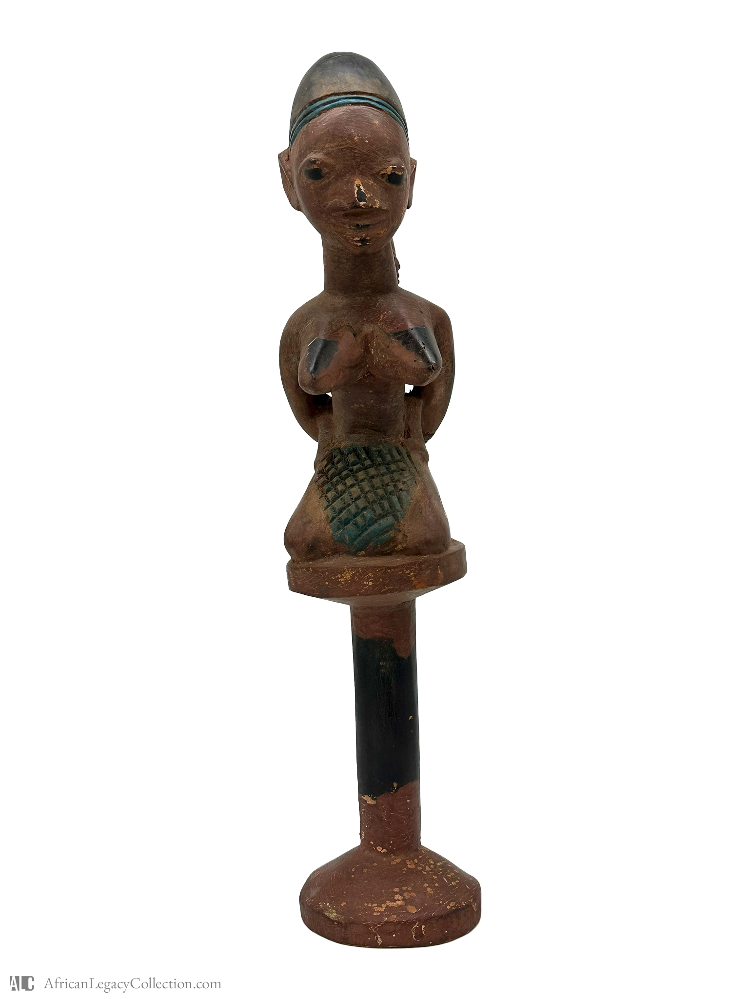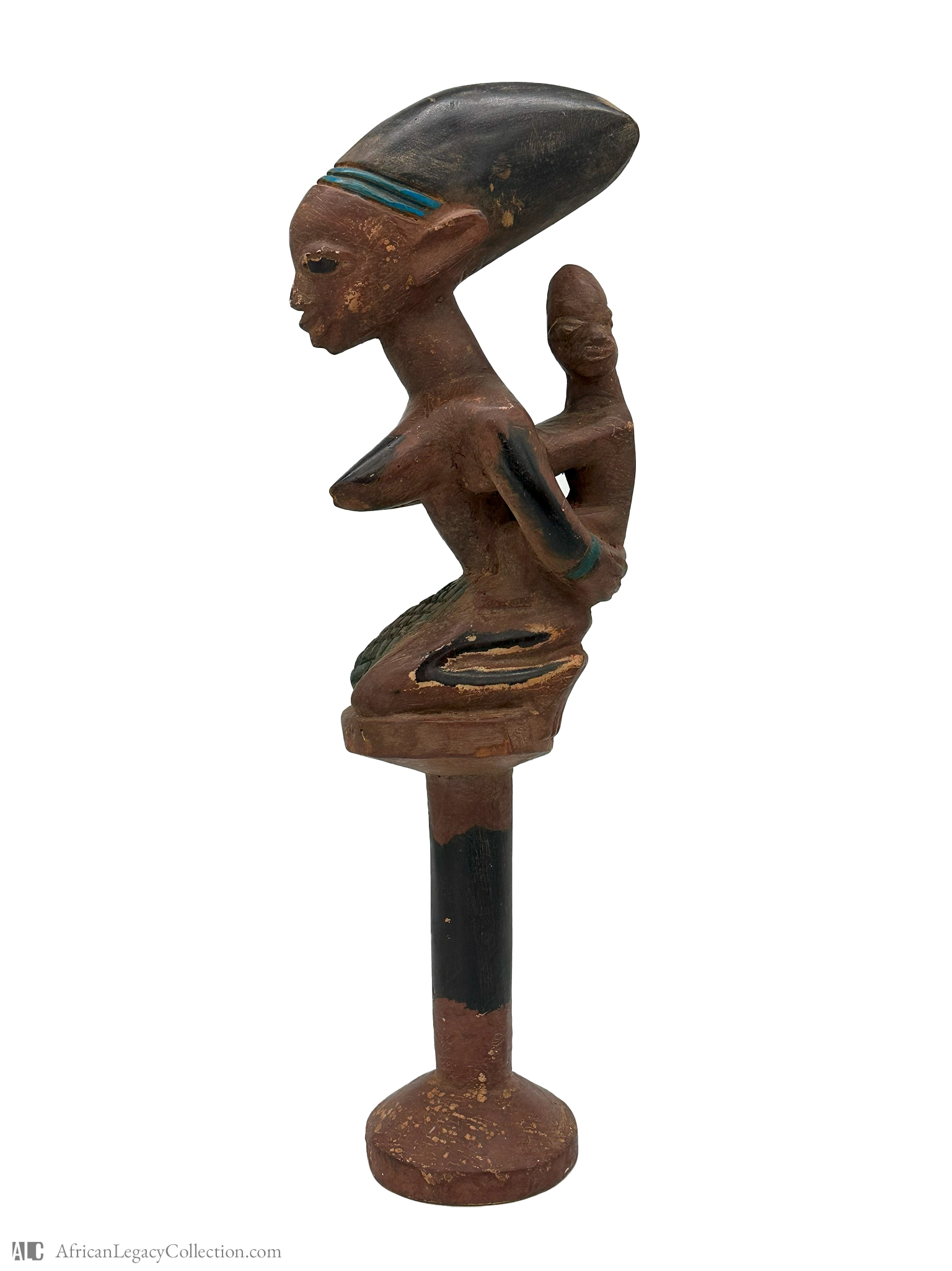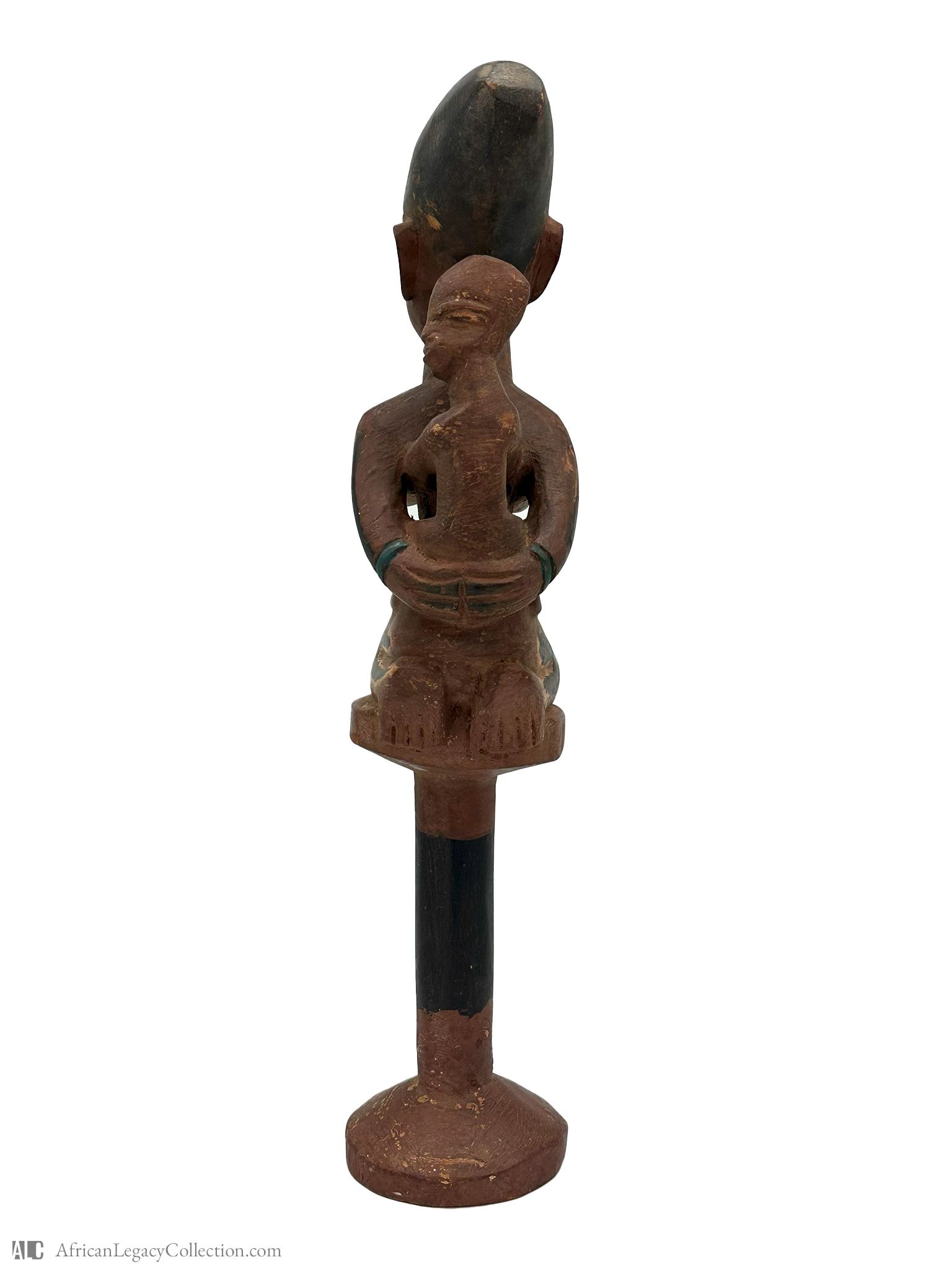 This wooden sculpture likely represents a figure of maternal significance, possibly originating from the Yoruba people of West Africa. It exemplifies the cultural emphasis on fertility and motherhood, often used in ritualistic or ceremonial contexts to convey themes of protection and prosperity.