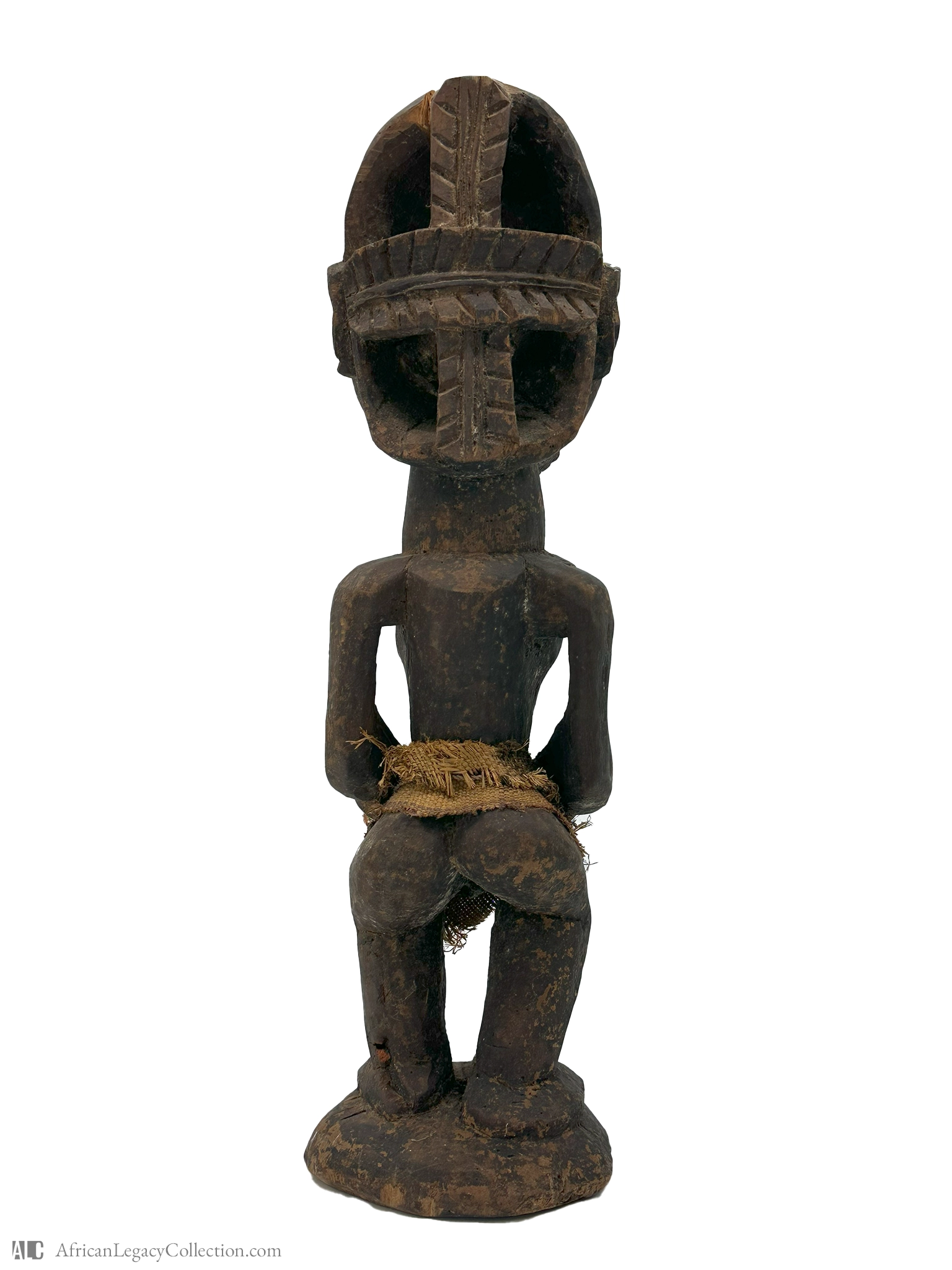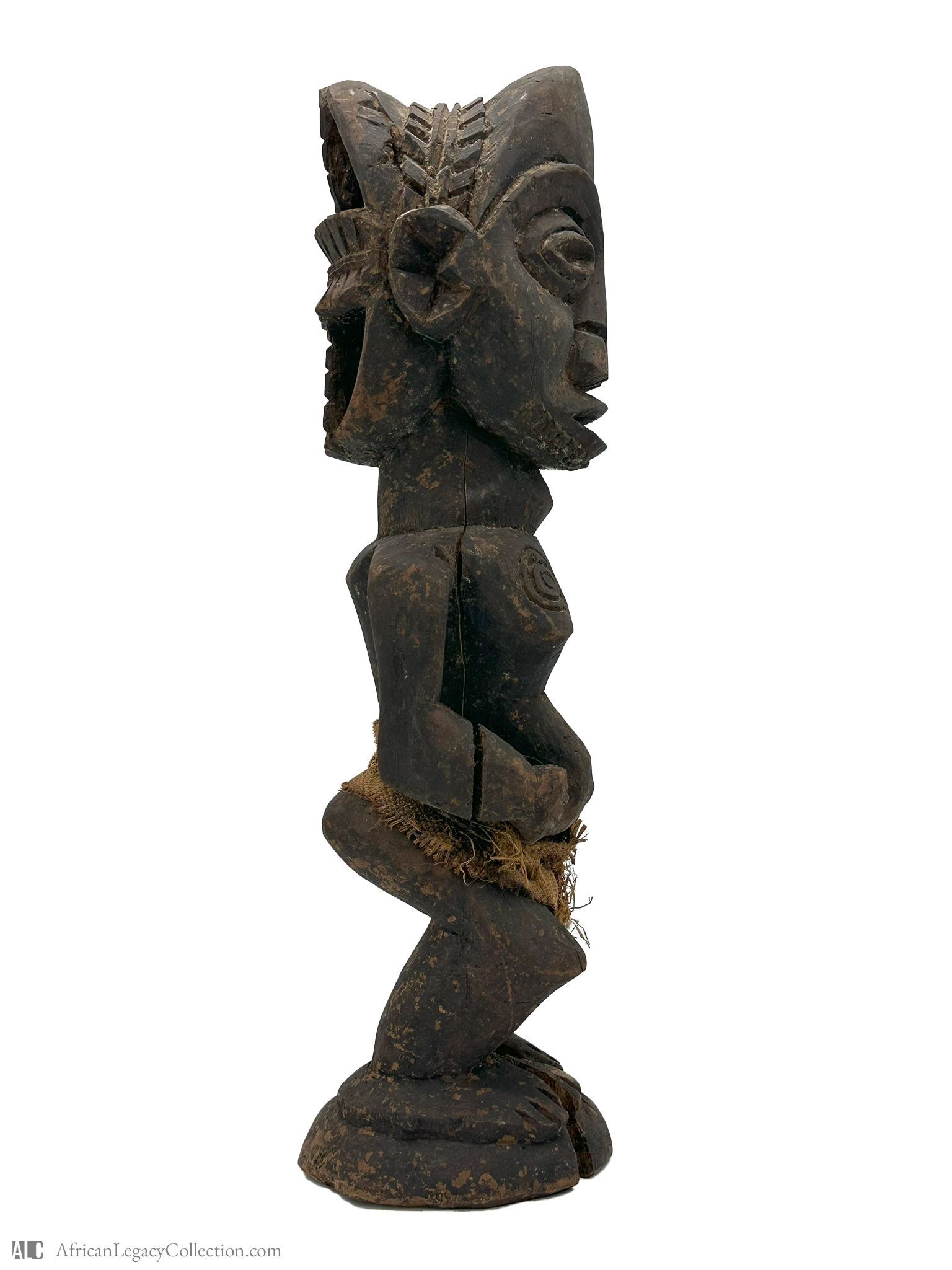 The statue is carved from wood, displaying incised striations and scarification motifs typical of traditional African art. Created using hand-carving techniques, the piece reflects a rich historical context likely from the late 19th to early 20th century, exemplifying the artistic heritage and spiritual beliefs of its people.